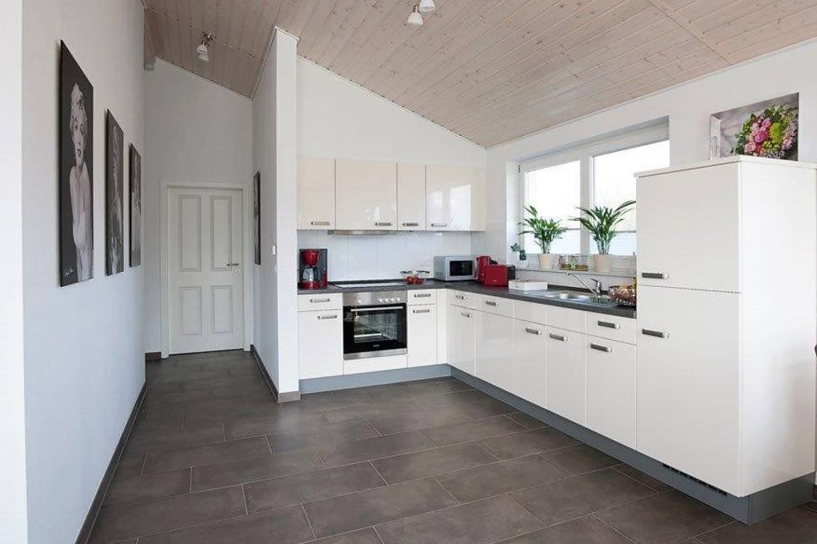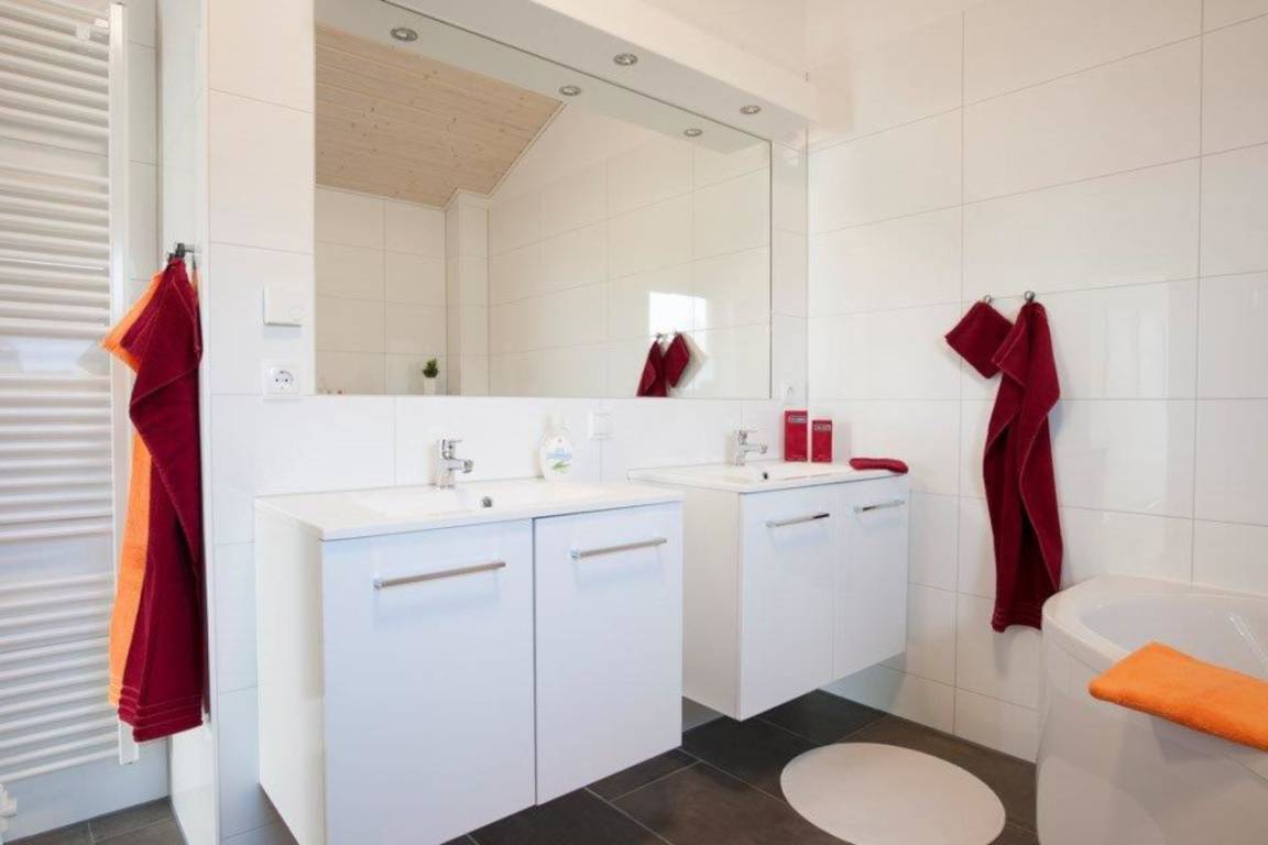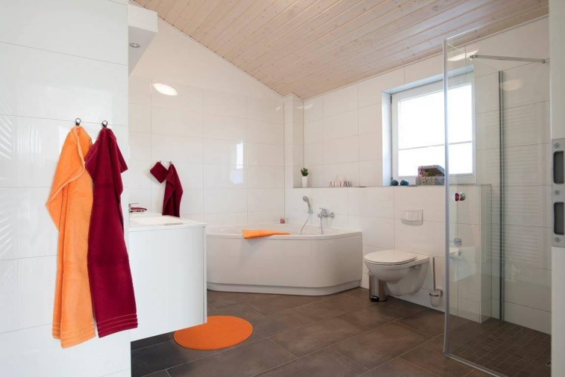 Verbringen Sie einen gemütlichen Abend im großzügigen Wohnbereich vor dem Kamin oder gönnen sich einen Aufenthalt im Wellnessbad mit Sauna, Whirlpool und bodenebener Dusche.