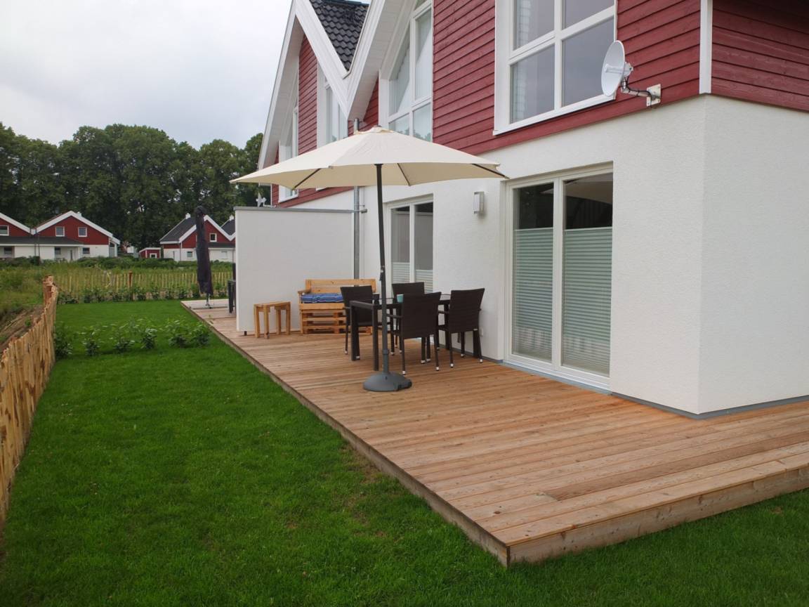 Die großzügige Terrasse in Süd-West-Ausrichtung mit Blick auf den See bietet Raum für Ruhe und Erholung. Gartenmöbel, Grill, Sonnenschirm und Sonnenliege warten auf ihren Einsatz.