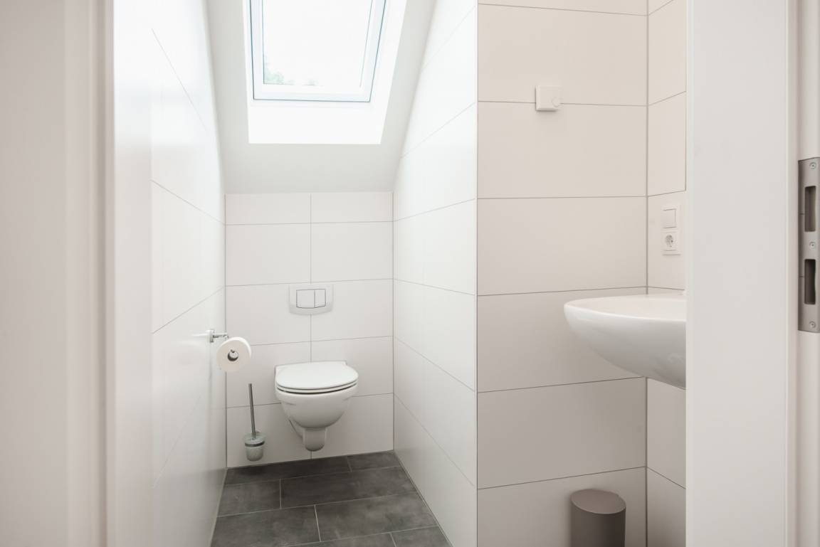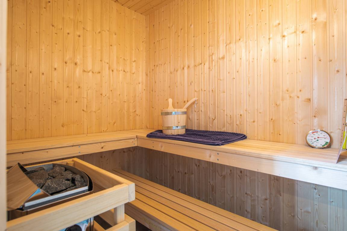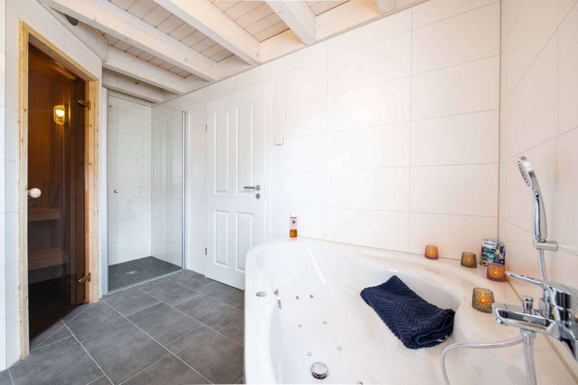 Im Wellnessbad können Sie nach langen Urlaubstagen die Seele baumeln lassen und im Whirlpool oder der Sauna entspannen. Ein zusätzliches Gäste-WC befindet sich im Obergeschoss bei den Schlafräumen.