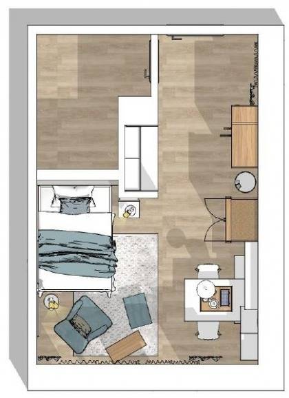 Die Garderobe im Eingangsbereich und der Kleiderschrank, sowie die wohnliche Sitzecke mit Sessel und Hocker runden die Einrichtung ab.