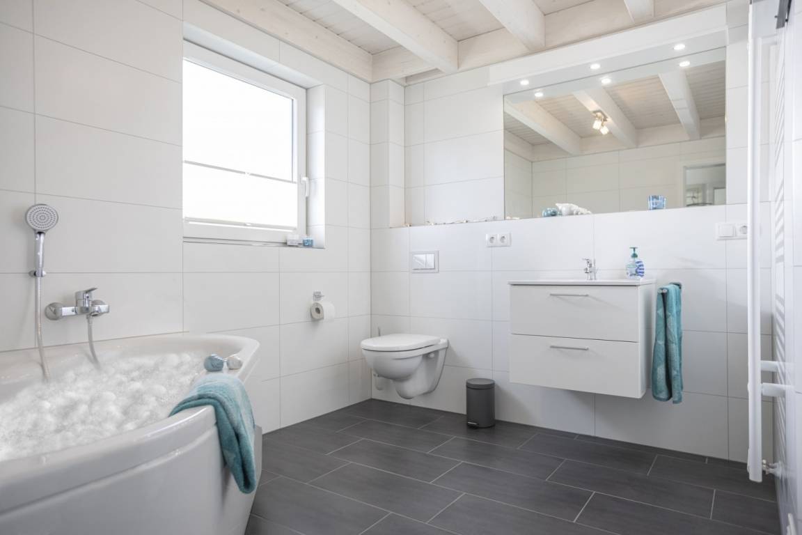 Entspannung finden Sie auch in unserem Wellnessbad mit Sauna und Whirlpool und einer bodengleichen, großzügigen Dusche. Im Haus gibt es ein 2. Badezimmer mit bodengleicher Dusche und WC.