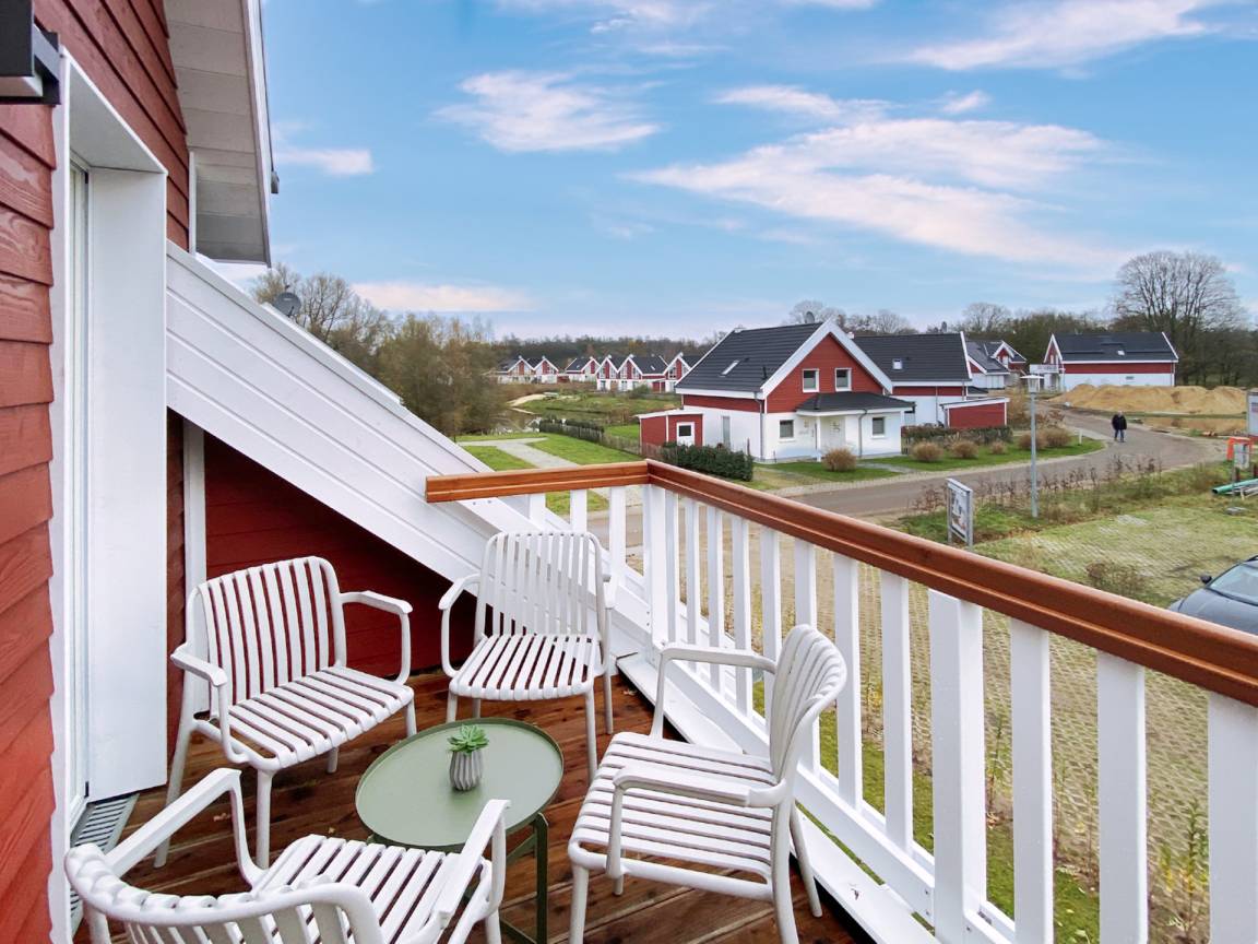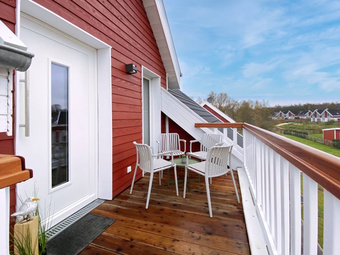 Der Balkon mit Gartenmöbeln lädt zu gemütlichen Stunden an der frischen Luft ein.