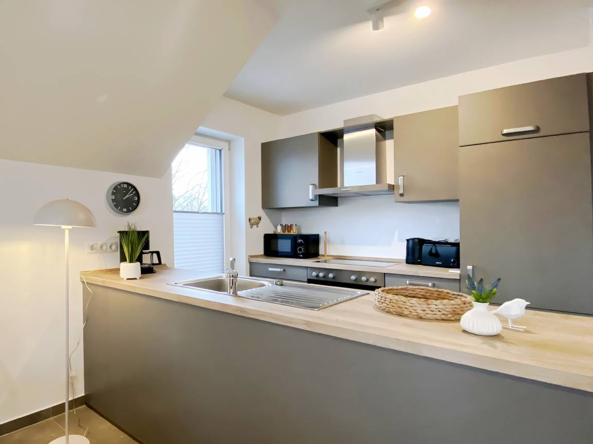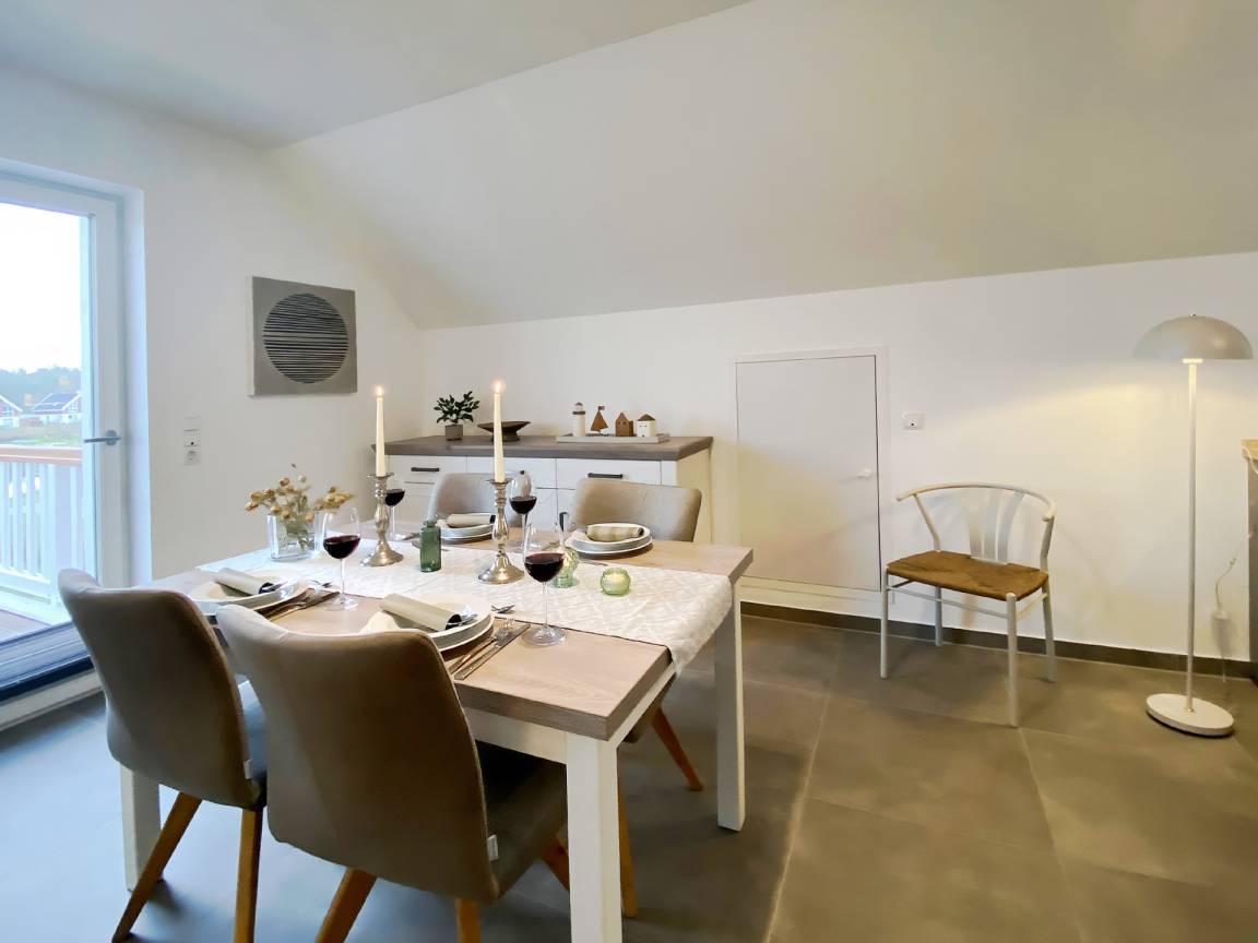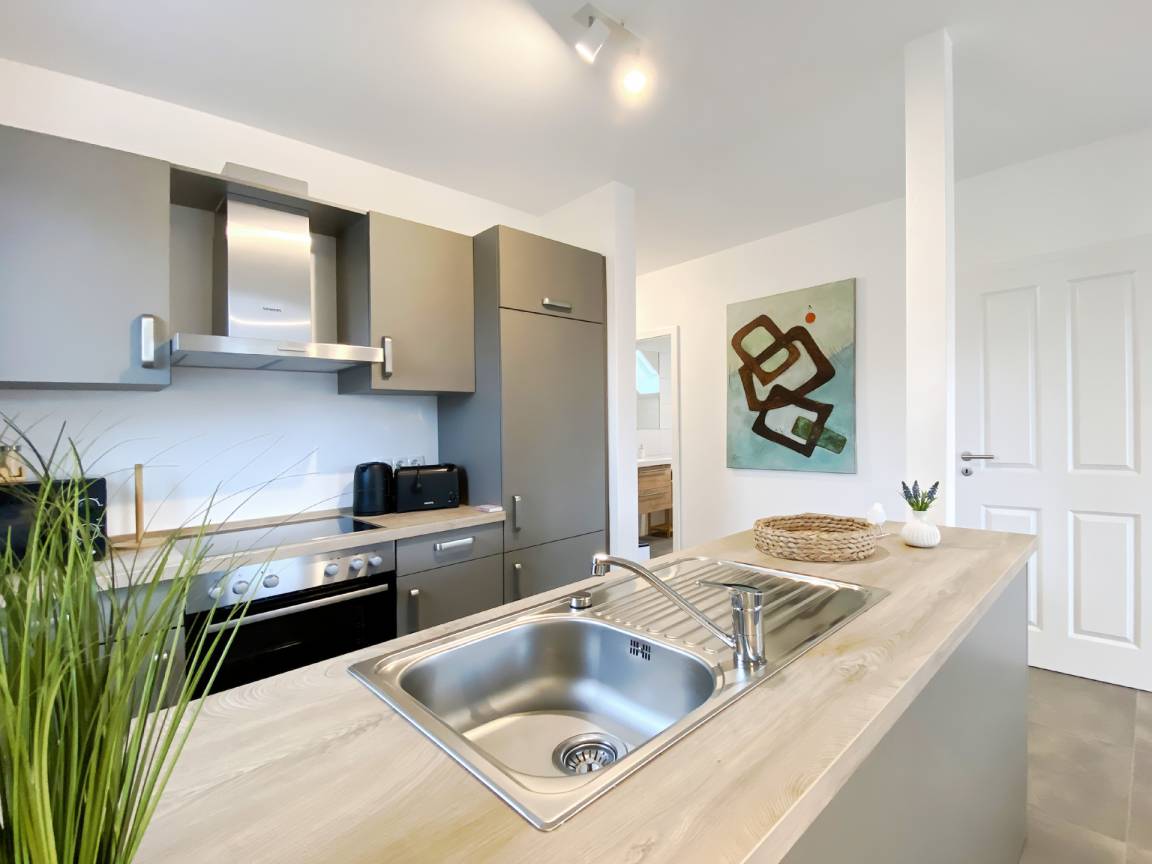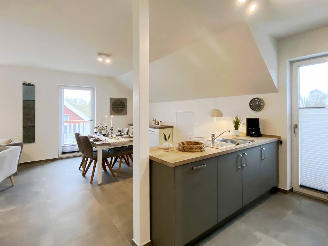 Der offene Wohn- und Essbereich ist hell, modern und gemütlich gestaltet. Die voll ausgestattete Küche bietet alles, was Sie für den täglichen Bedarf benötigen - vom Geschirrspüler bis zum Waffeleisen