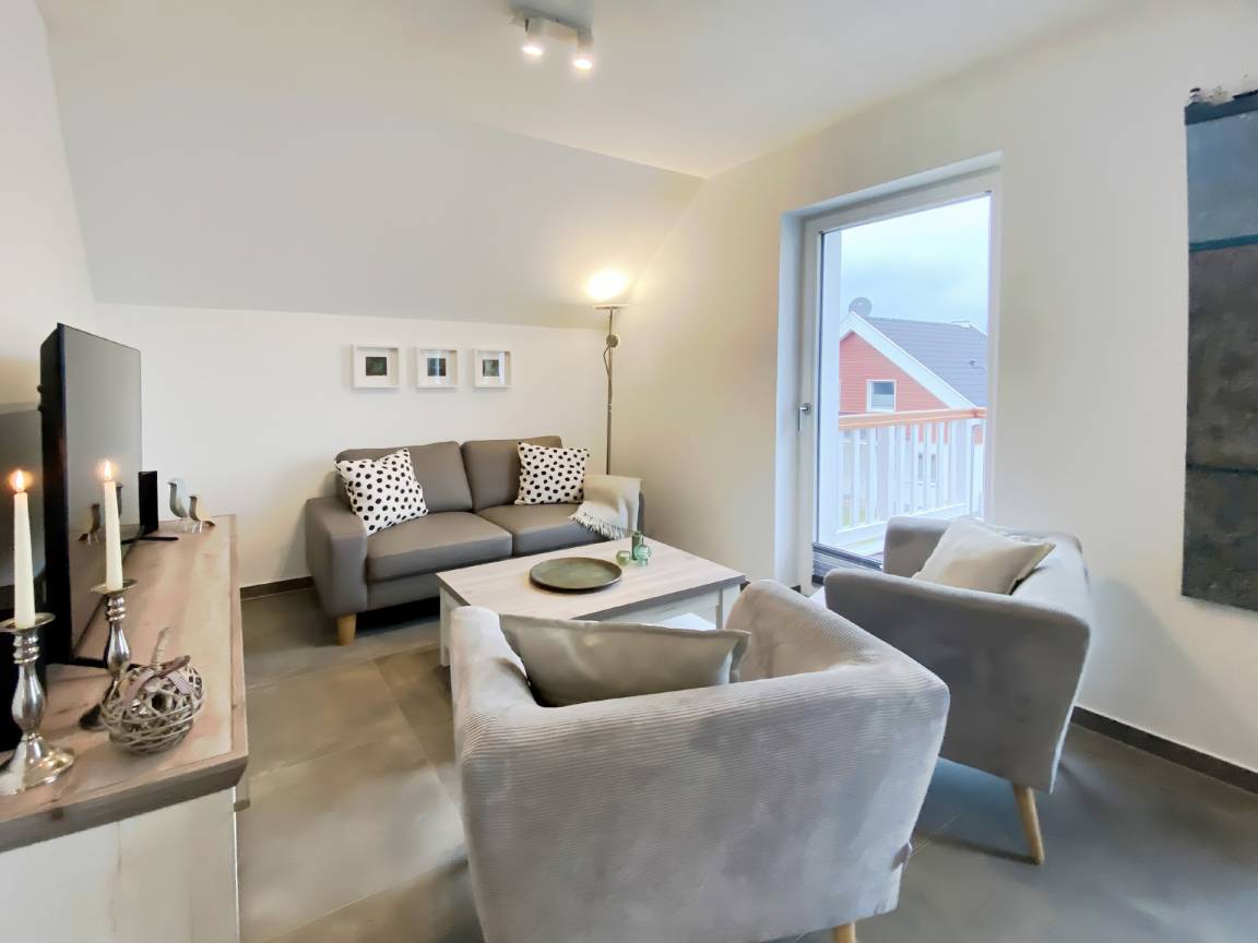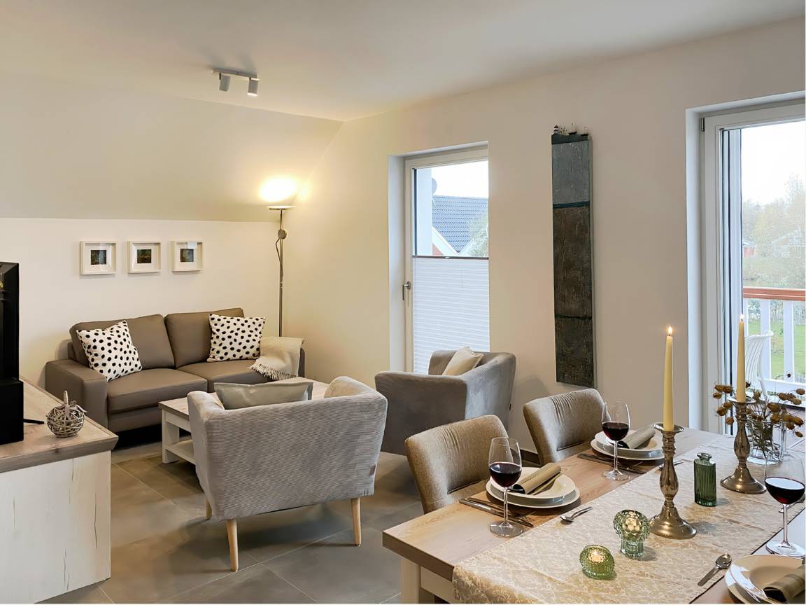 Die stilvolle Ferienwohnung Schilfhaus 96b befindet sich im 1. Obergeschoss und bietet auf 71 m² ein hochwertig eingerichtetes Zuhause für bis zu 4 Personen - optional kann eine 5. Person auf einem Zustellbett untergebracht werden.