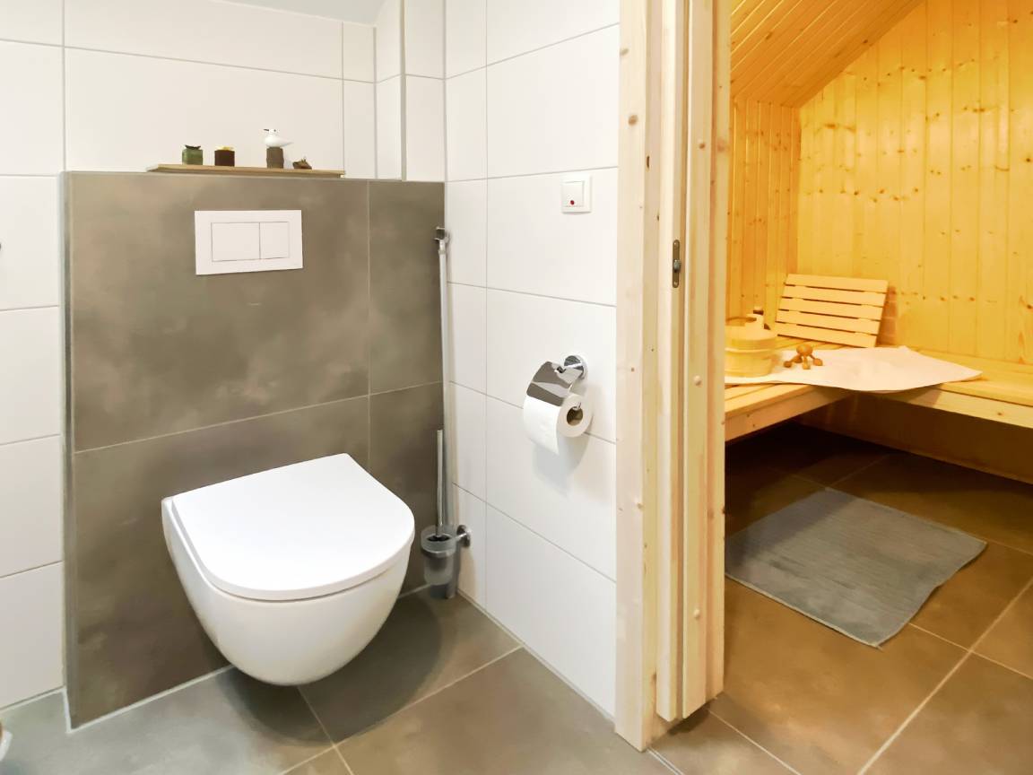 Das luxuriöse Badezimmer überzeugt mit Whirlpool, Sauna und bodengleicher Dusche - Entspannung pur nach einem ereignisreichen Urlaubstag.