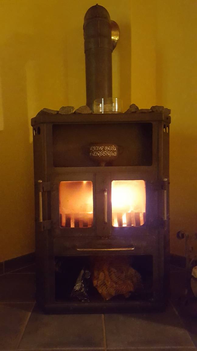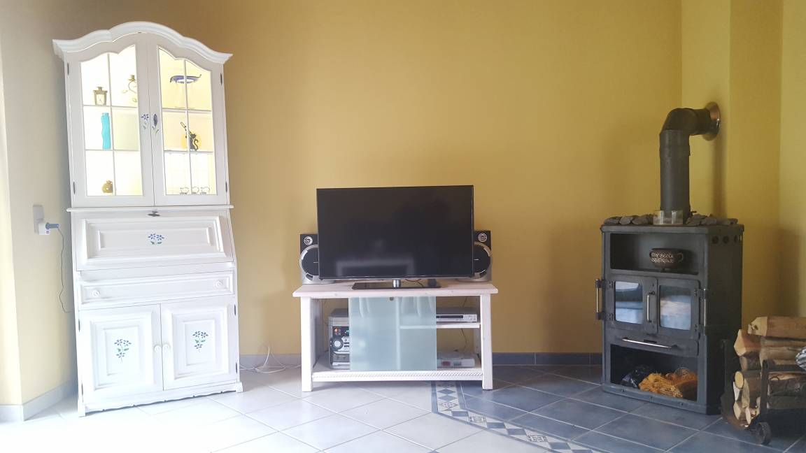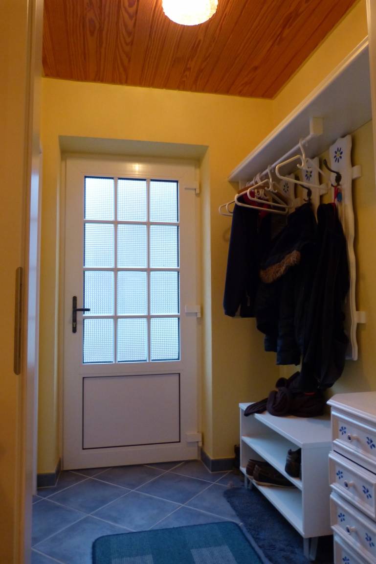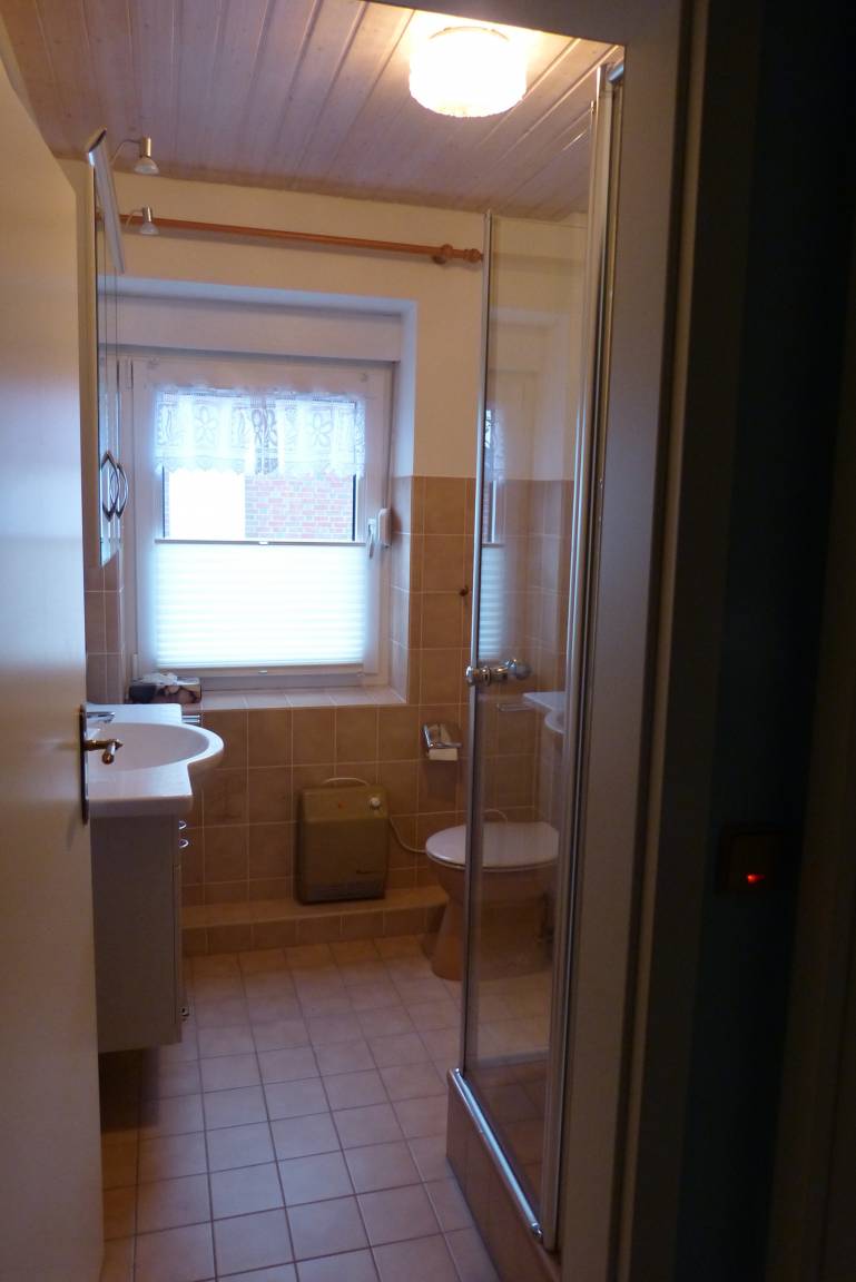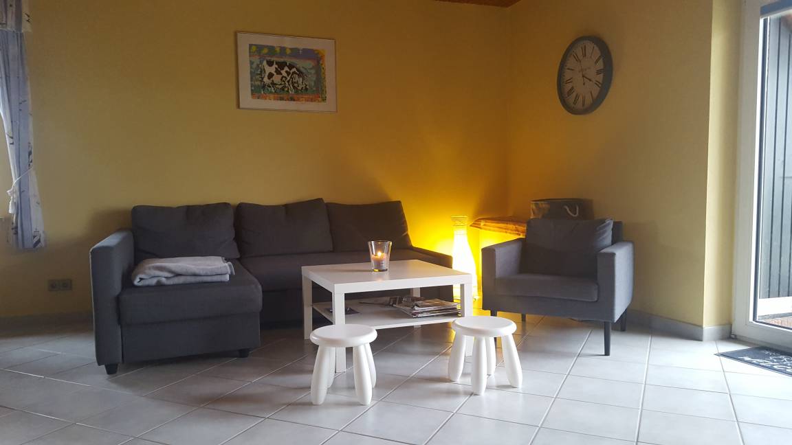 Im Erdgeschoss befinden sich ein Flur mit Garderobe, ein modernisiertes Gäste-WC mit Dusche, eine Küche, ein Hauswirtschaftsraum und ein geräumiges Wohnzimmer mit separatem Wohn- und Essbereich. Die Küche besteht aus einer komplett ausgestatteten Einbauküche mit Kühlschrank inklusive Gefrierfach, Geschirrspülmaschine, Backofen, Cerankochfeld und Mikrowelle. Im Hauswirtschaftsraum steht eine Waschmaschine. Im Essbereich steht ein ausziehbarer Tisch mit 6 Stühlen. Im Wohnbereich kann man es sich auf der Couch, dem Sessel und zweit Kinderhockern gemütlich machen. Zwei bequeme Stuhlsessel können dazugestellt werden. Des Weiteren gibt es einen Ofen, einen 40 Zoll Flachbildschirm, einen DVD Player, eine Stereoanlage und eine Playstation 1. Im Schrank befinden sich diverse Gesellschaftsspiele, ein Schachcomputer und Puzzle. Im ganzen Haus gibt es W-Lan.