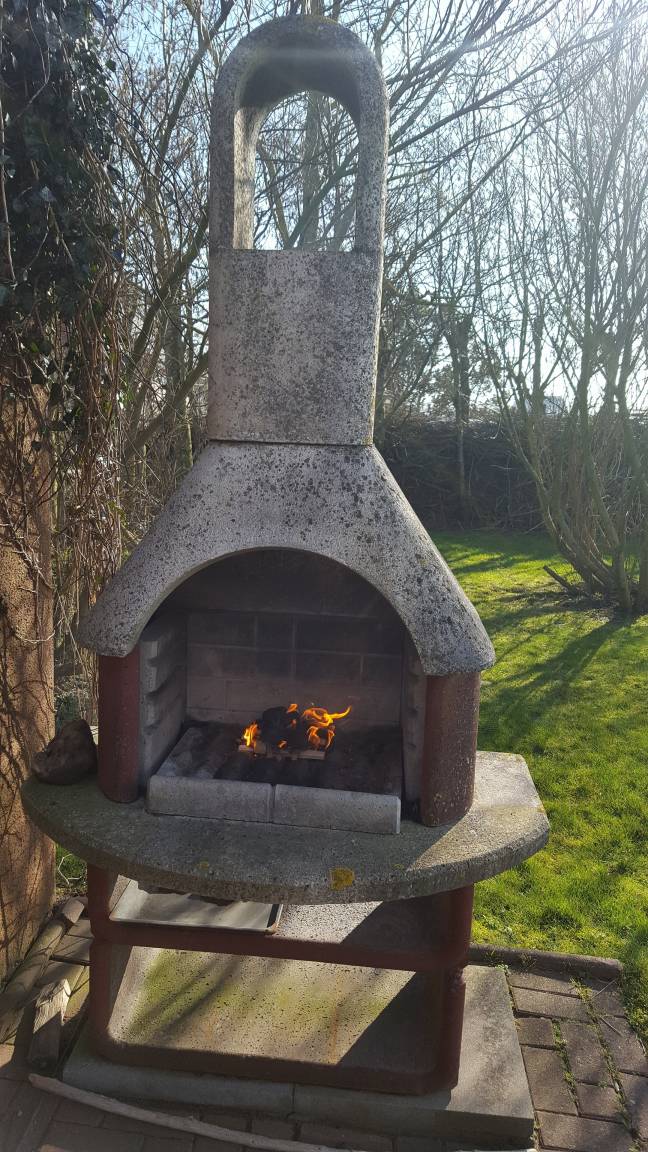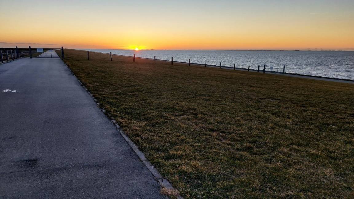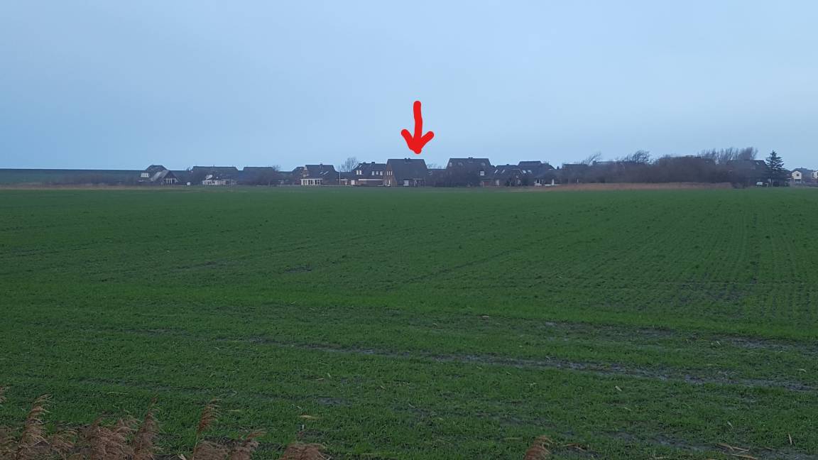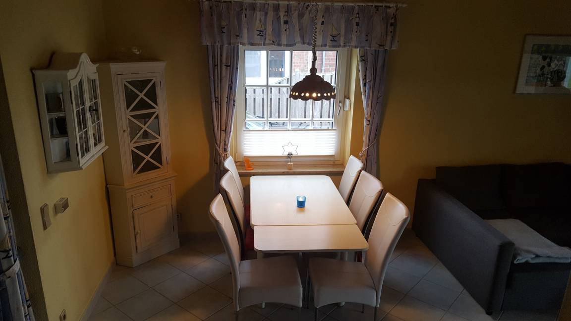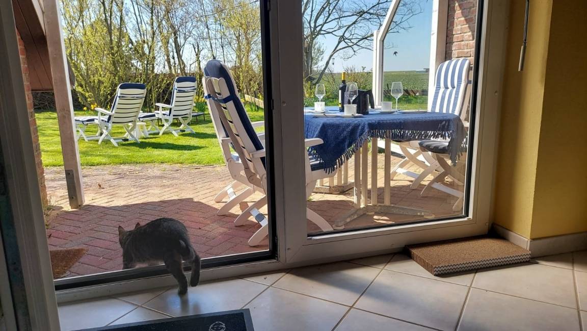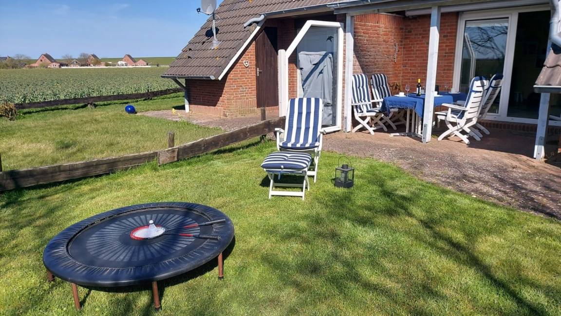 Vom Wohnbereich erreicht man eine für sechs Personen möblierte, windgeschützte, überdachte Terrasse. Vom Garten aus hat man einen wunderschönen Panoramablick über die Felder zum Deich. Außerdem steht im Garten ein Grillkamin.