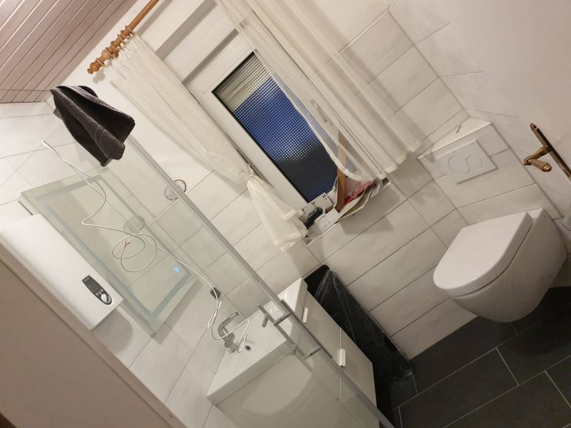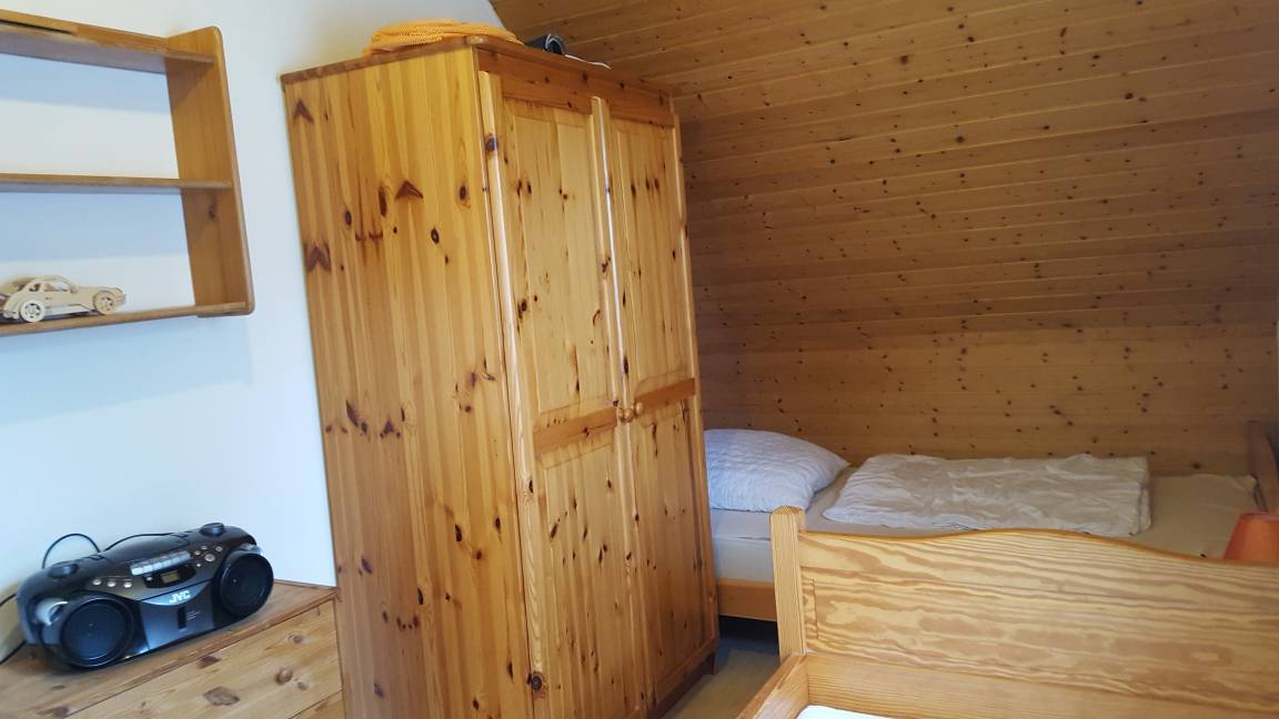 Im Obergeschoss befinden sich drei Schlafzimmer, zwei mit einem Doppelbett und ein weiteres mit zwei Einzelbetten. In jedem Schlafzimmer steht ein Kleiderschrank. Im großen Schlafzimmer steht ein weiterer Fernseher. Zusätzlich befindet sich im Obergeschoss ein weiteres Badezimmer mit Dusche und WC. In beiden Badezimmern ist jeweils ein Fön vorhanden.