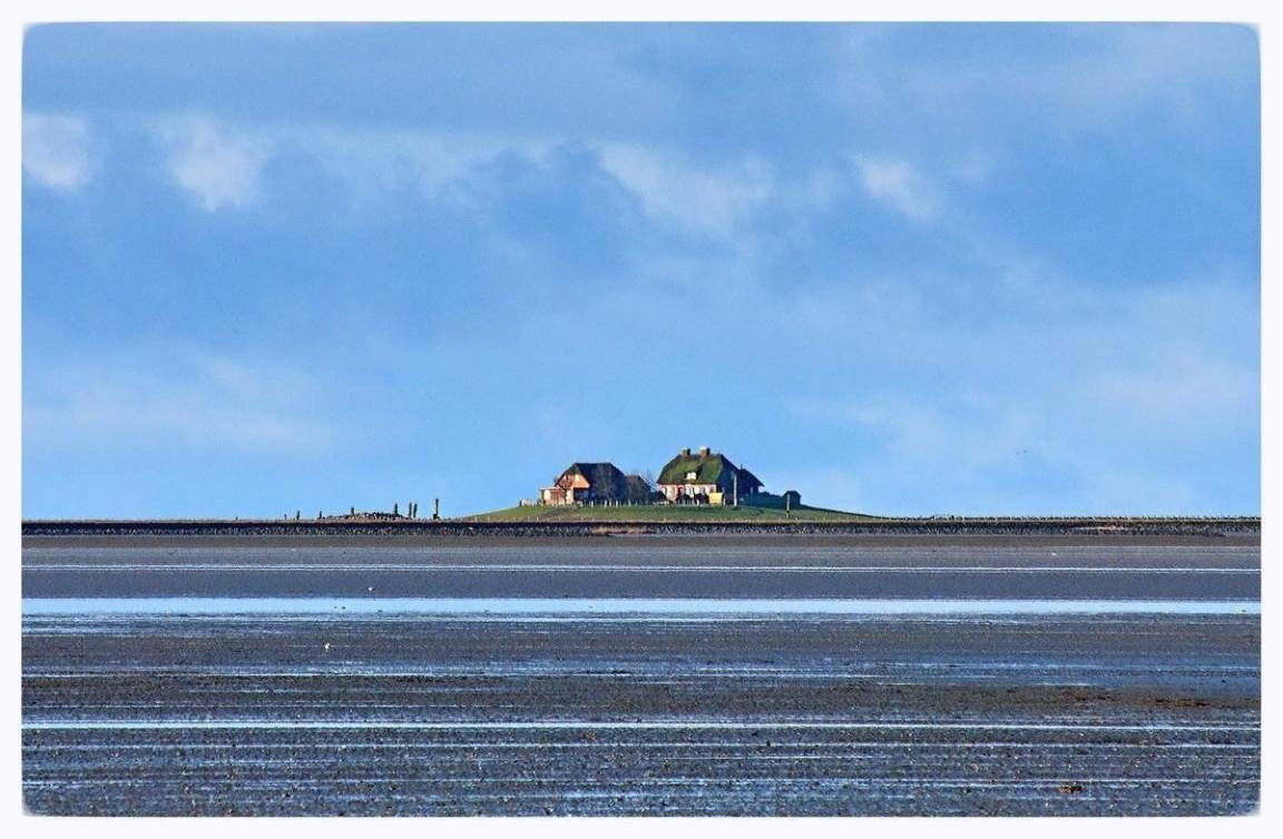 Wer Ruhe und leere Strände sucht - auch in der Hauptsaison - , ist hier genau richtig. Umgeben von den berühmten Küstenorten liegt diese Halbinsel verborgen am Rand der Welt. Friedlich und freundlich schlummert sie vor sich hin und begrüßt jeden Besucher mit einem weiten Himmel, salziger Luft und einem schlichten "Moin", das mehr sagt als tausend Worte andernorts. Schafe ziehen wie Wolken über einen grünen Himmel auf den Deichen und am Horizont schimmern die Halligen, winzige Inseln, im Meer. Wenn die Sonne versinkt, wird die grüne Insel in ein rötliches Licht getaucht und in der Nacht ist der Sternenhimmel unendlich. Außer jeder Menge Watt mit all seinen Schätzen gibt es in Neptuns Vorgarten Salzwiesen und eine vielfältige Tier- und Pflanzenwelt. Unter dem Meeresboden ist Rungholt verborgen, das Atlantis der Nordsee. Diese sagenumwobene Stadt versank bei der großen Flut im Jahr 1362 und noch heute werden immer wieder Schätze dieser reichen Kultur bei Ebbe freigespült. Rungholt lag, darauf deuten viele Funde hin, zwischen dem Strand Fuhlehörn und der Hallig Südfall, also wenige Meter von dem Ferienhaus entfernt. Bei Sturm, so sagt man, läuten die Glocken von Rungholt, aber das könnte auch Seemannsgarn sein.