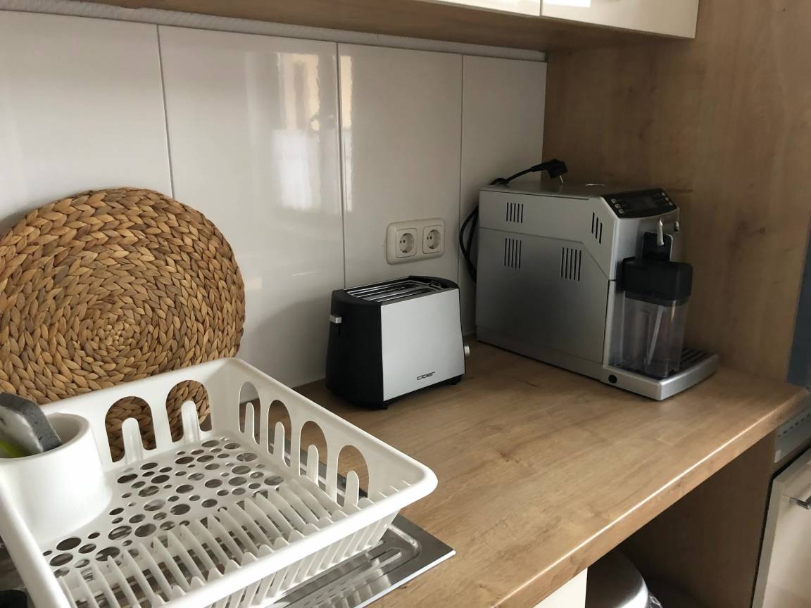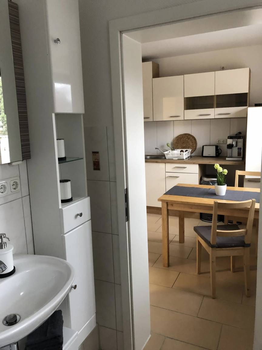 Der Zugang zur Wohnung erfolgt ausschließlich über eine Treppe. Durch einen langen Flur, der gemeinsam mit einer anderen Ferienwohnung genutzt wird, gelangen Sie in die vollständig ausgestattete, zeitgemäße Küche. Hier finden Sie ein Cerankochfeld, einen Backofen, einen Kühlschrank, eine Mikrowelle, einen Kaffeevollautomaten, einen Toaster, einen Wasserkocher sowie eine gemütliche Sitzecke für zwei Personen.