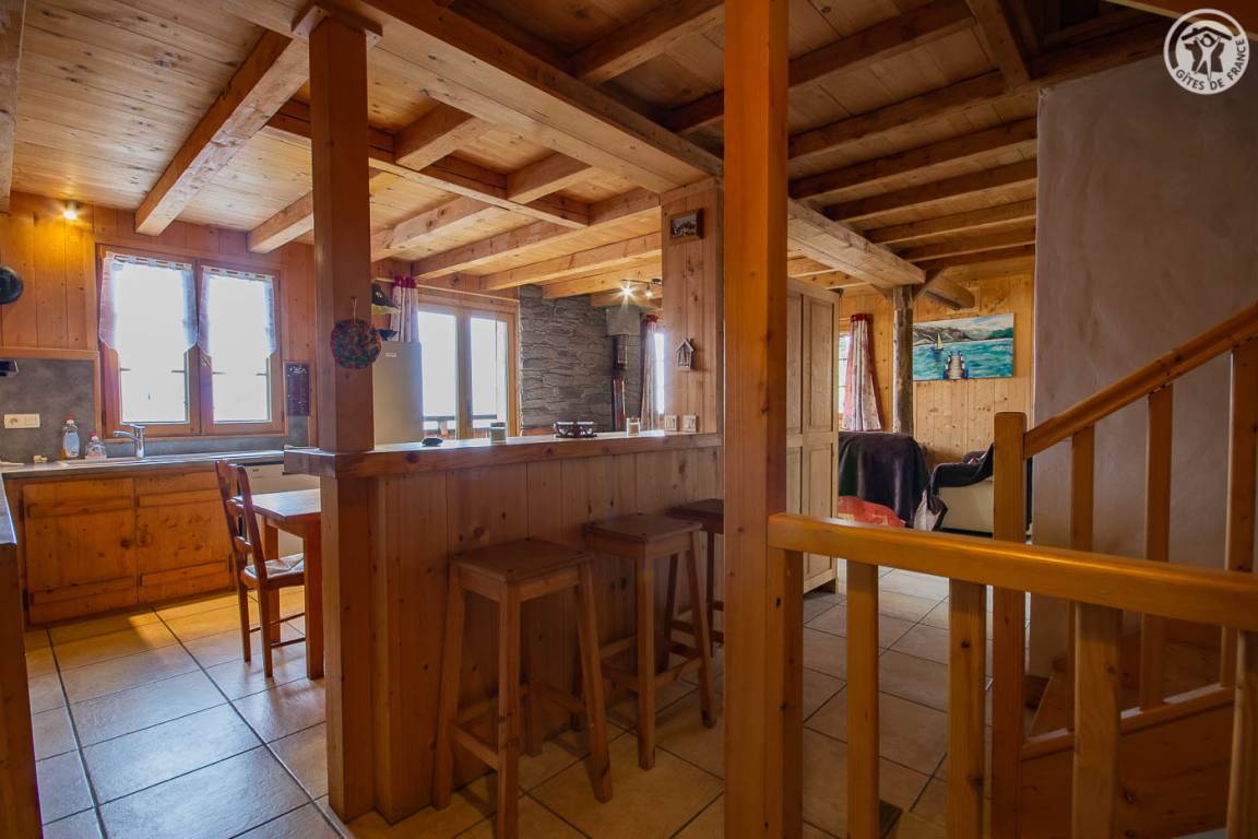 Freistehendes Haus auf 3 Ebenen mit ebenem Zugang vom Parkplatz (1. Stock) in den Wohn-Küchen-Aufenthaltsbereich (extra und Freizeit-Holzofen) mit Zugang zu einem vorderen Balkon, einem Badezimmer (Dusche und Badewanne, 2 Waschbecken), separatem WC. Erdgeschoss (Ebene 0): 4 Schlafzimmer (3 Doppelbetten 160 x 200 cm / 2 Etagenbetten 90 x 190 cm), ein Duschbad, separates WC. 3. Stock: schräger Dachboden, ausgebaut zu einem Spielbereich für Kinder, einem kleinen Aufenthaltsbereich und der Möglichkeit für 2 Betten (2 Einzelbetten 80 x 190 cm). Gesamtwohnfläche: 145 m² inkl. Dachgeschossflächen. Boden. Garage nur für Fahrräder, Motorräder, Skier. NICHTRAUCHERHAUS. Ladesteckdose für Elektrofahrzeuge (kostenpflichtiges Laden).