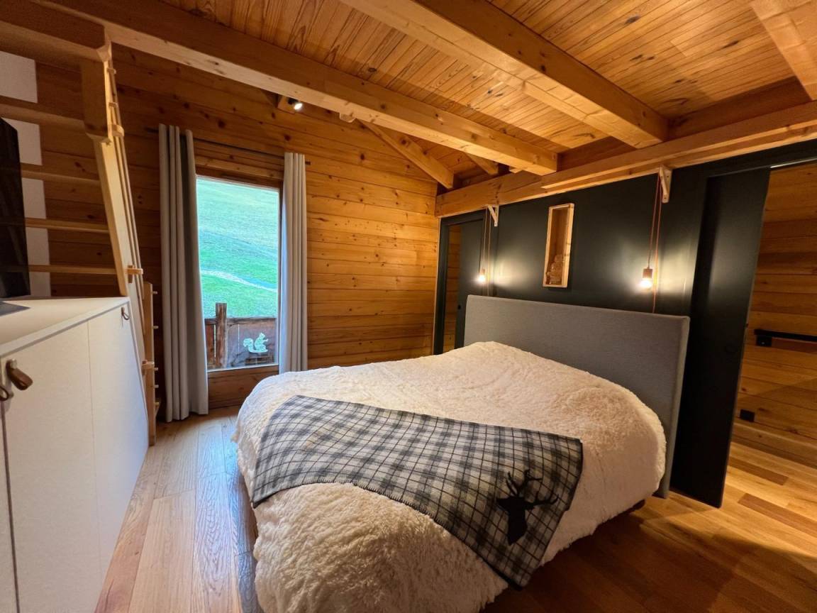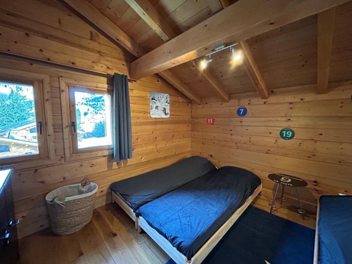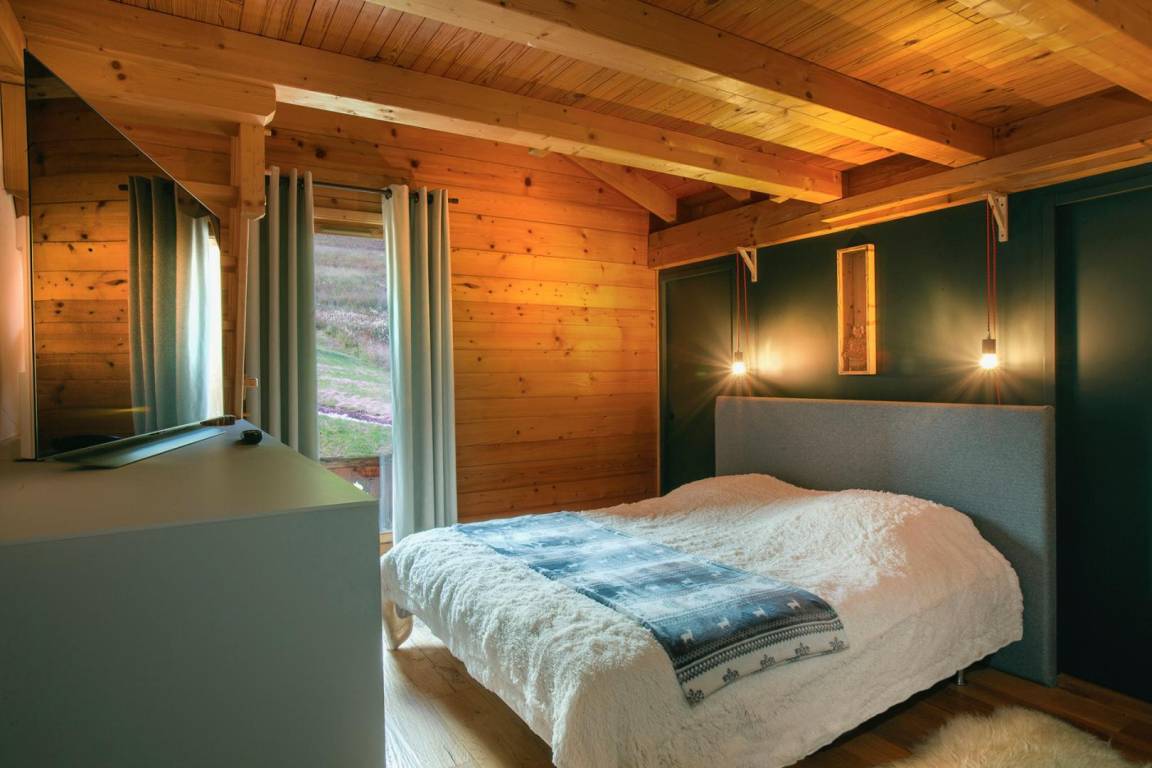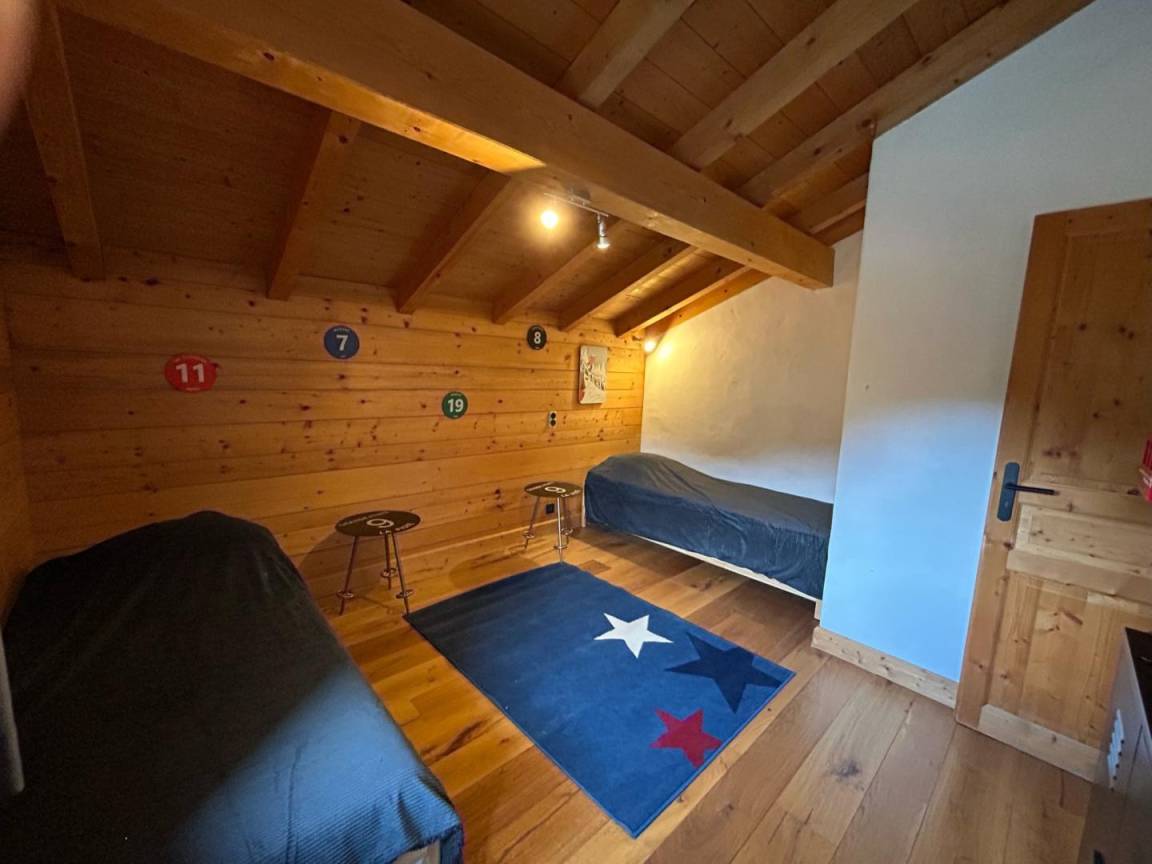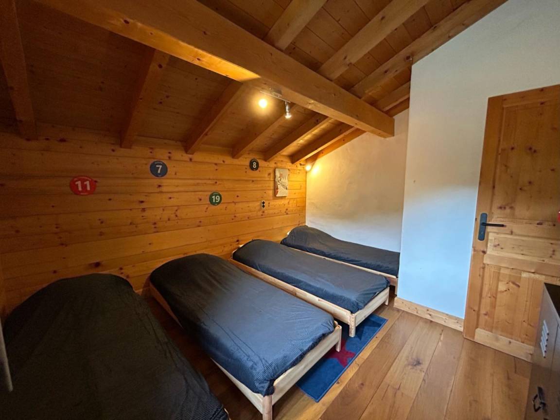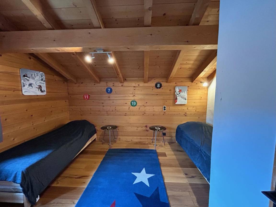 Freistehendes Chalet auf zwei Ebenen. Erdgeschoss: Großer Raum für Skier und Fahrräder, Eingangsbereich mit Waschküche, Wohnküche (mit Kaminofen, Tischfußball und Weinkeller), Wohnzimmer (mit Kamin und Starlink-TV), Schlafzimmer (mit Doppelbett 160x200 cm und Fernseher) mit Duschbad (Dusche und WC), separates WC. Obergeschoss: Galerie mit Fernseher, zwei Schlafzimmer mit Fernseher und Balkon (mit Doppelbett 160x200 cm / Doppelbett 160x210 cm) und Duschbad (Dusche und WC), ein Schlafzimmer (mit vier Einzelbetten 80x190 cm, die zu zwei Doppelbetten zusammengestellt werden können), Badezimmer (mit Badewanne), separates WC. Terrasse, Garten, privater Parkplatz.