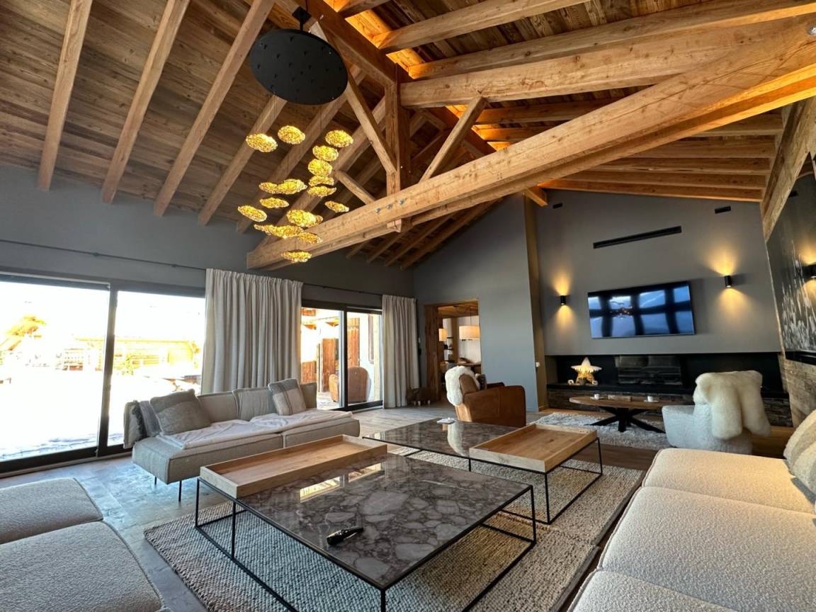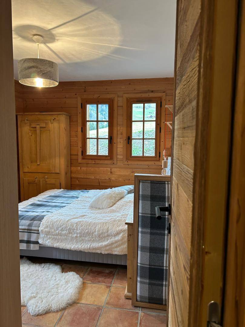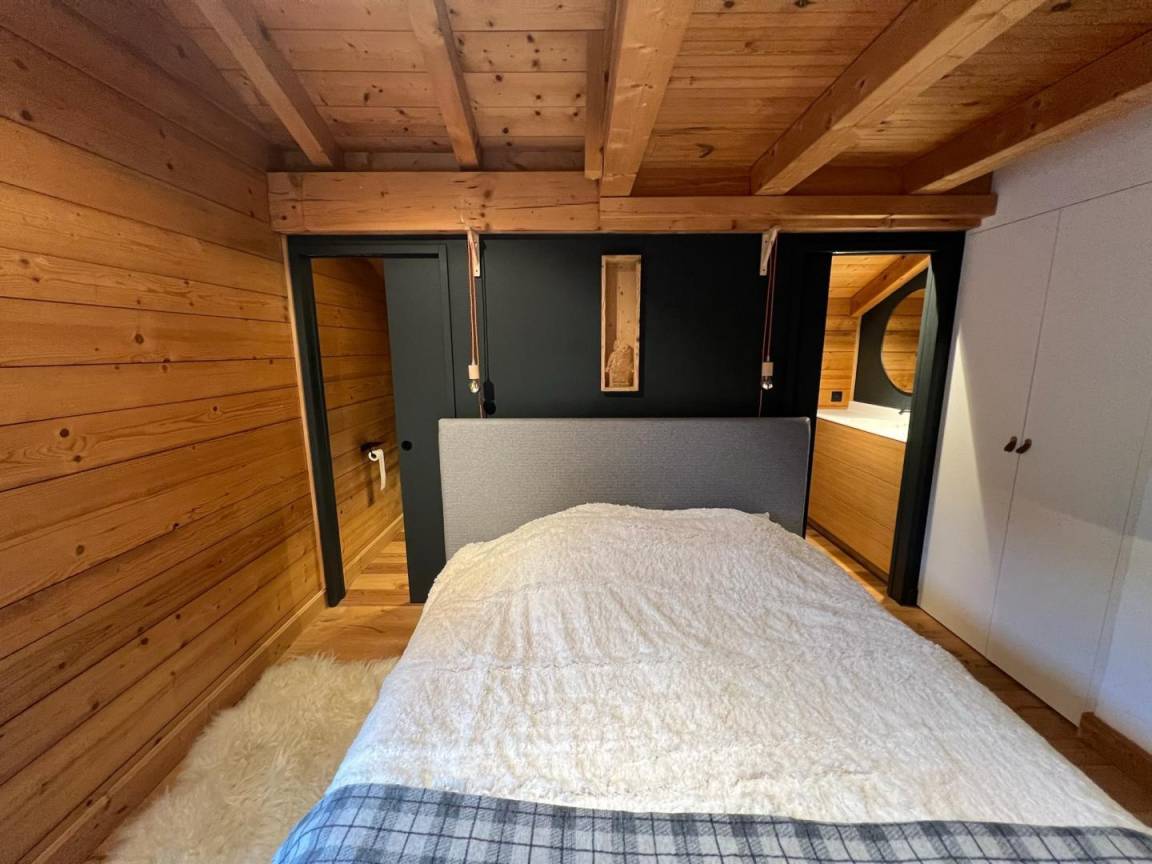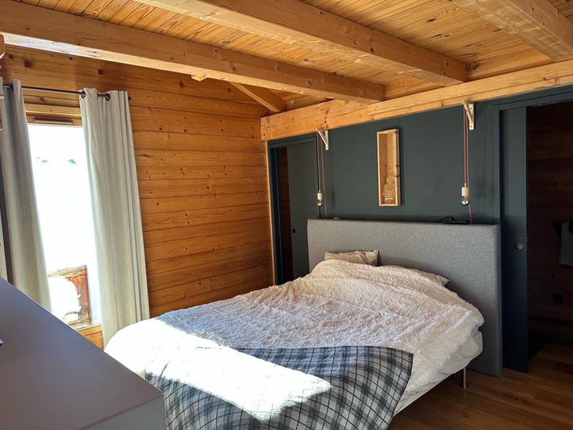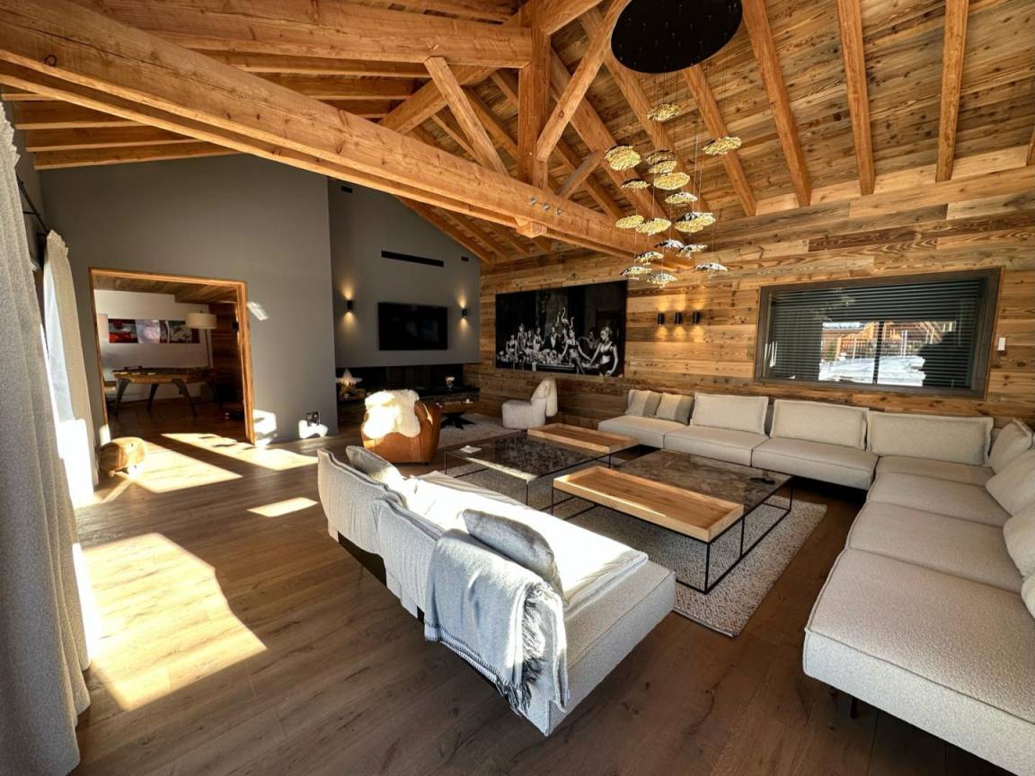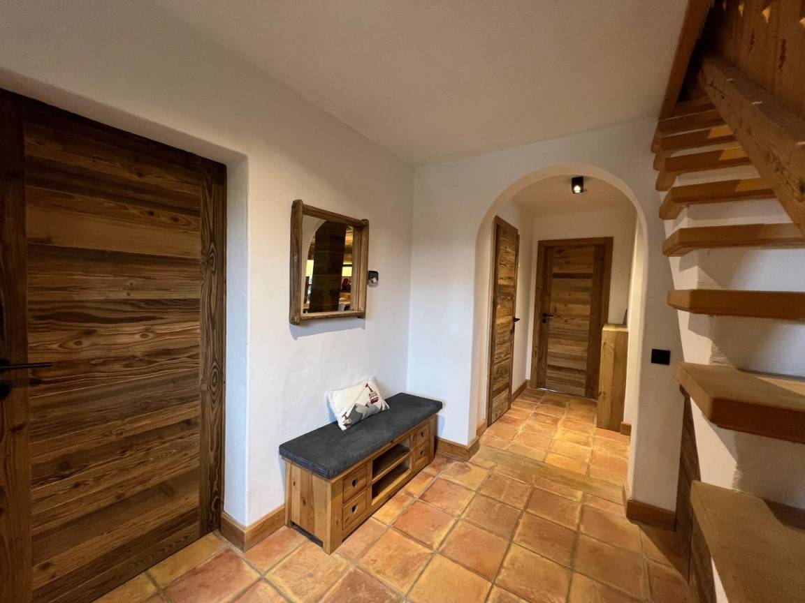 Freistehendes Chalet auf zwei Ebenen. Erdgeschoss: Großer Raum für Skier und Fahrräder, Eingangsbereich mit Waschküche, Wohnküche (mit Kaminofen, Tischfußball und Weinkeller), Wohnzimmer (mit Kamin und Starlink-TV), Schlafzimmer (mit Doppelbett 160x200 cm und Fernseher) mit Duschbad (Dusche und WC), separates WC. Obergeschoss: Galerie mit Fernseher, zwei Schlafzimmer mit Fernseher und Balkon (mit Doppelbett 160x200 cm / Doppelbett 160x210 cm) und Duschbad (Dusche und WC), ein Schlafzimmer (mit vier Einzelbetten 80x190 cm, die zu zwei Doppelbetten zusammengestellt werden können), Badezimmer (mit Badewanne), separates WC. Terrasse, Garten, privater Parkplatz.