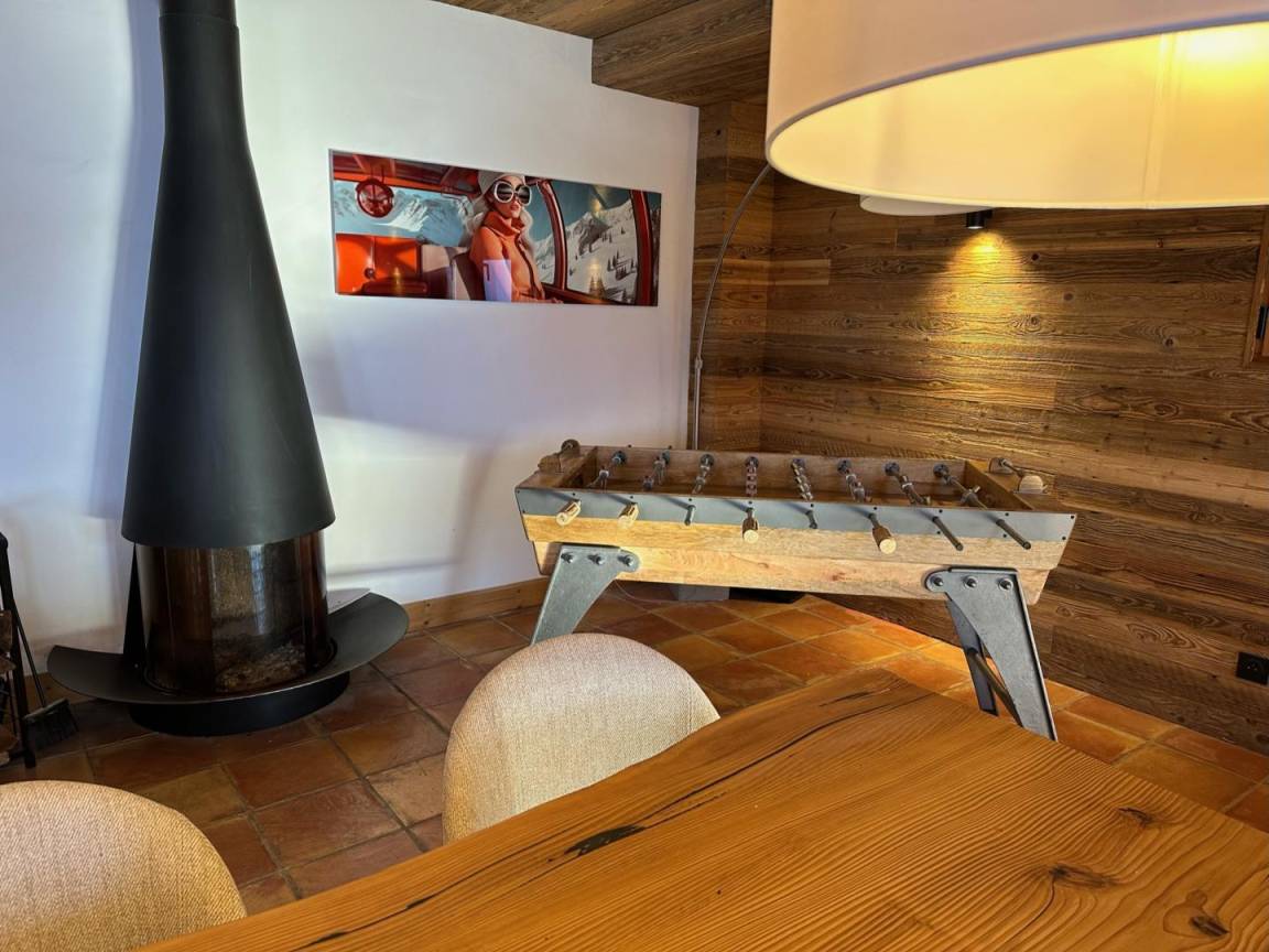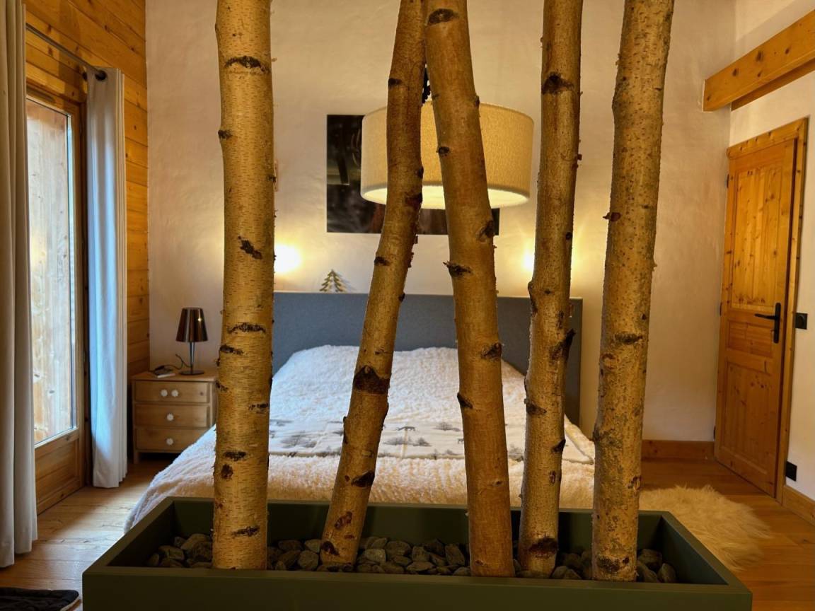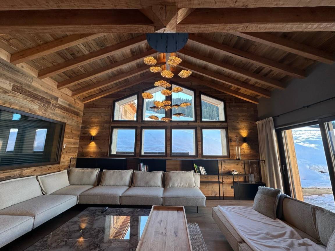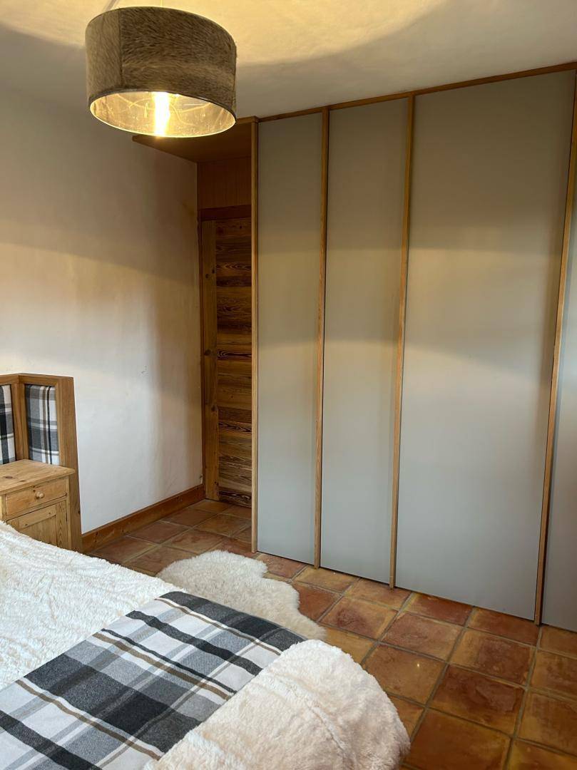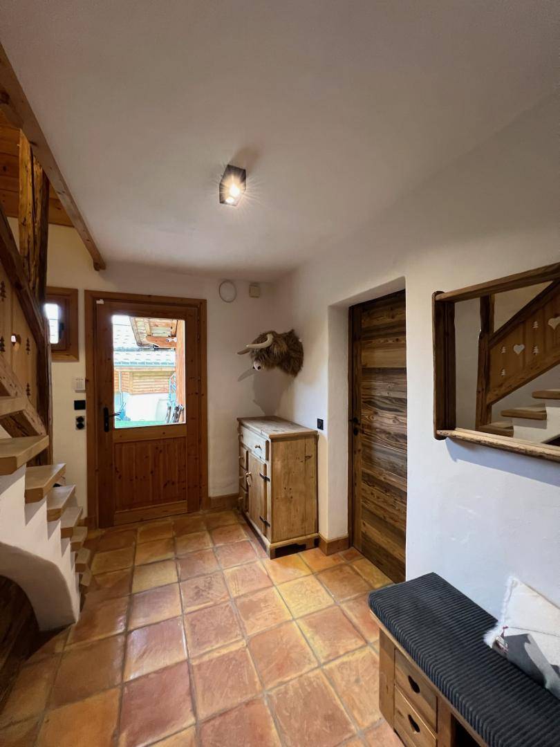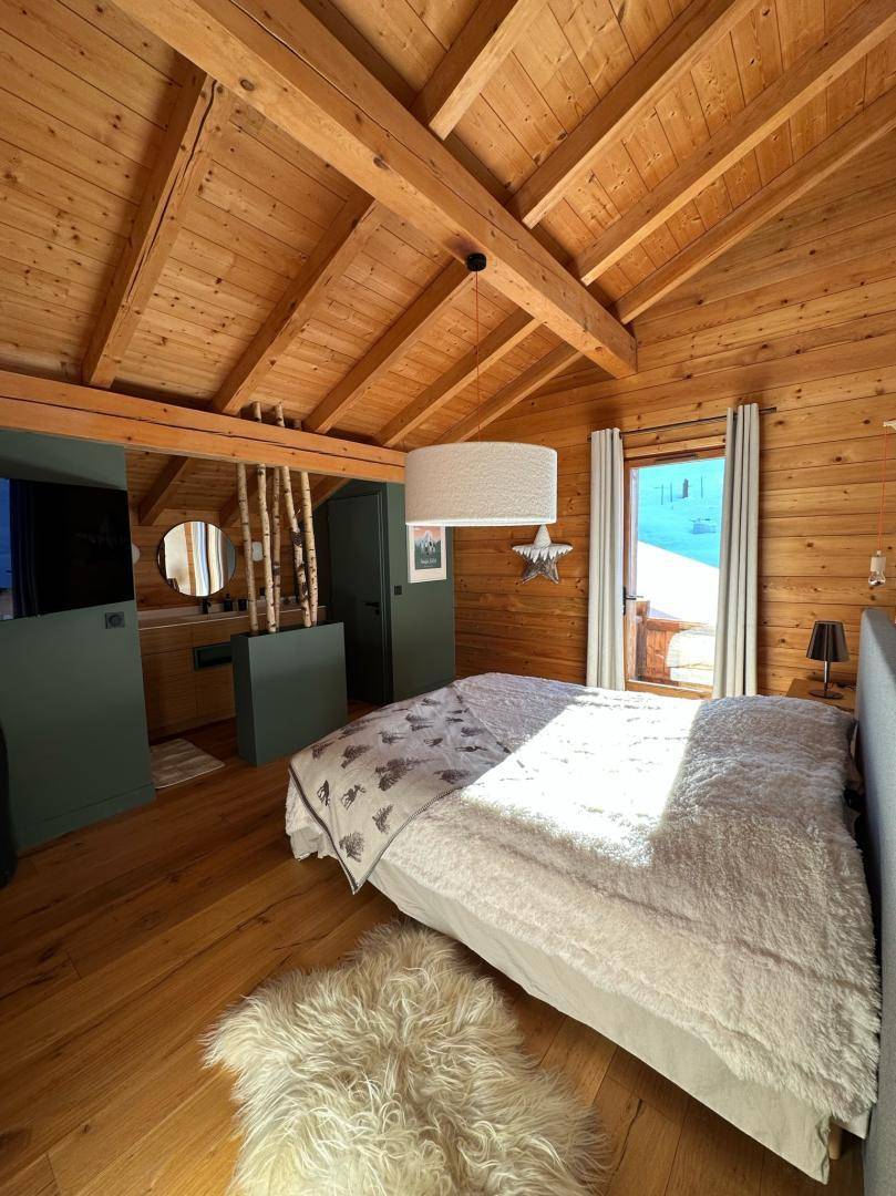 Freistehendes Chalet auf zwei Ebenen. Erdgeschoss: Großer Raum für Skier und Fahrräder, Eingangsbereich mit Waschküche, Wohnküche (mit Kaminofen, Tischfußball und Weinkeller), Wohnzimmer (mit Kamin und Starlink-TV), Schlafzimmer (mit Doppelbett 160x200 cm und Fernseher) mit Duschbad (Dusche und WC), separates WC. Obergeschoss: Galerie mit Fernseher, zwei Schlafzimmer mit Fernseher und Balkon (mit Doppelbett 160x200 cm / Doppelbett 160x210 cm) und Duschbad (Dusche und WC), ein Schlafzimmer (mit vier Einzelbetten 80x190 cm, die zu zwei Doppelbetten zusammengestellt werden können), Badezimmer (mit Badewanne), separates WC. Terrasse, Garten, privater Parkplatz.