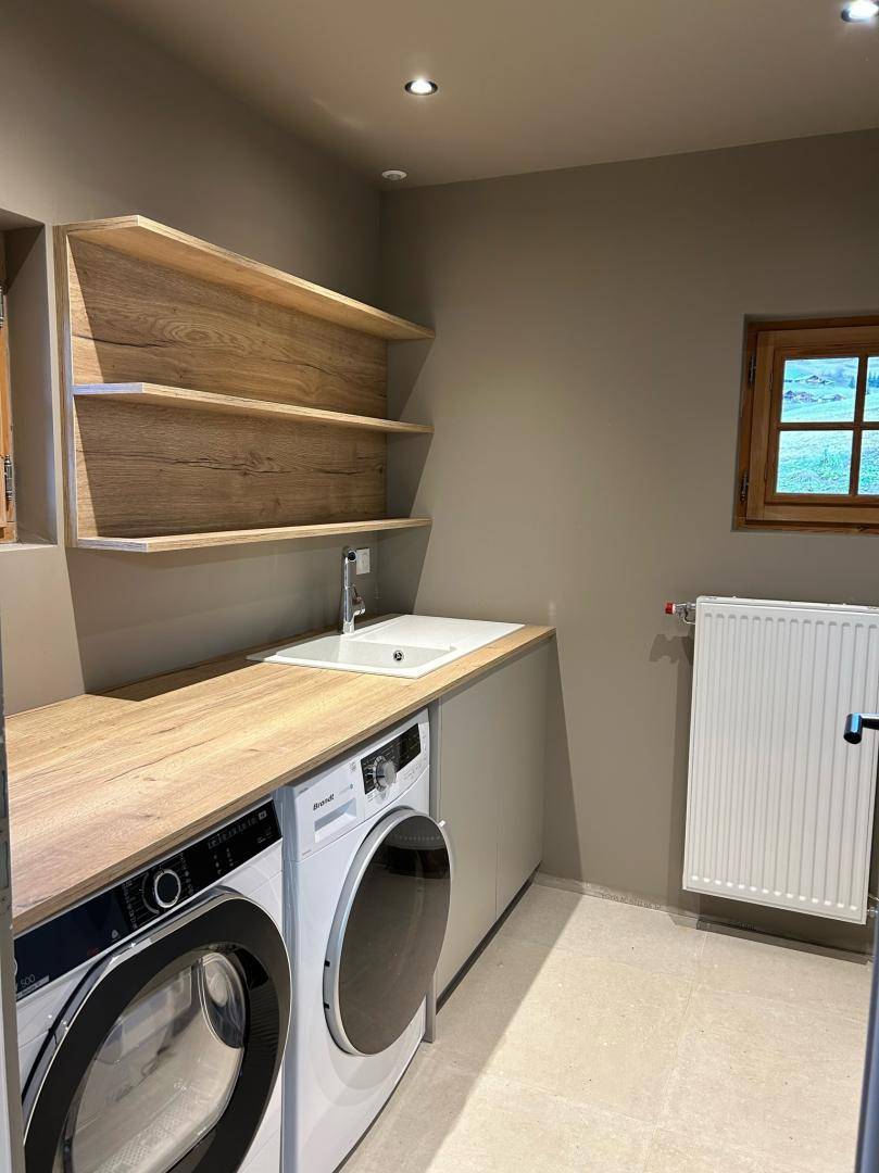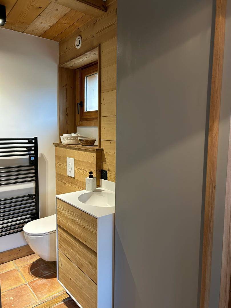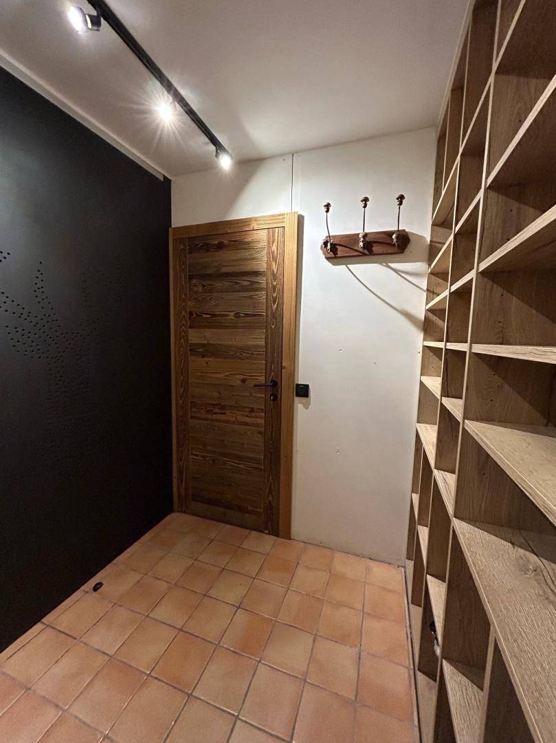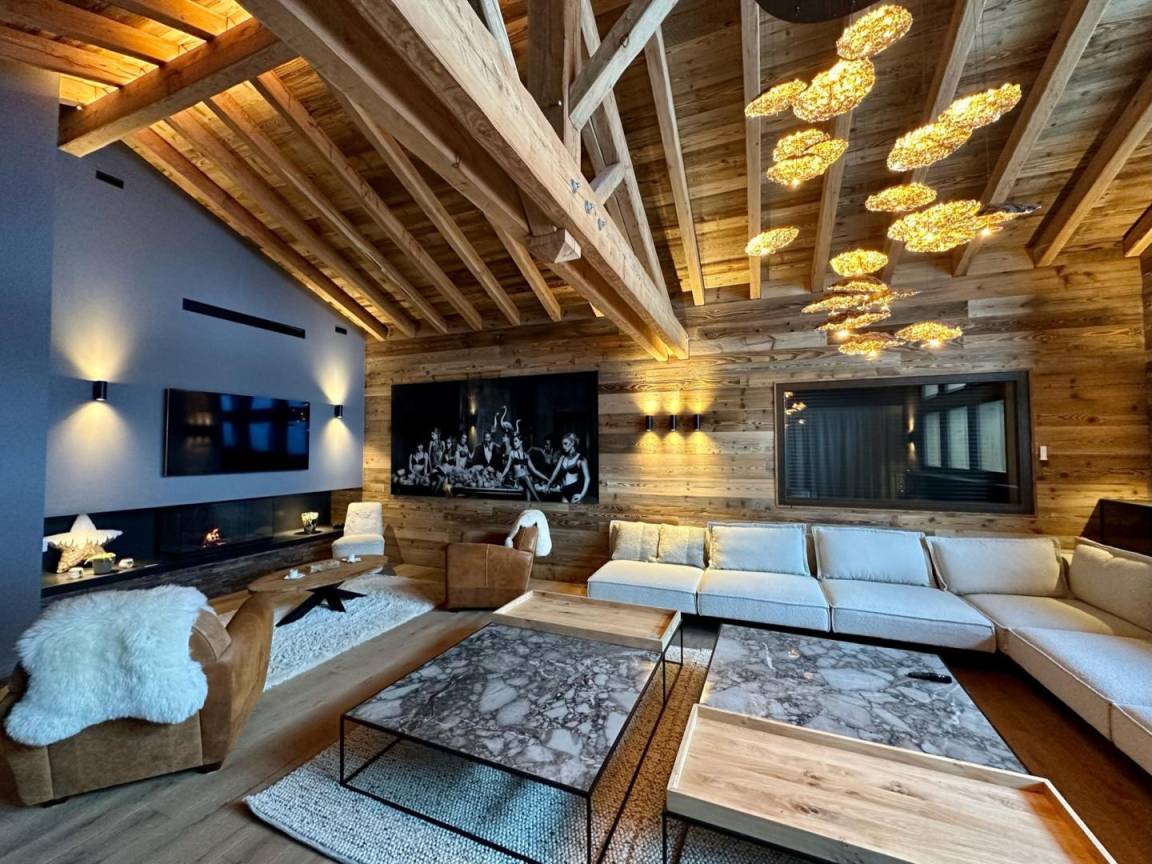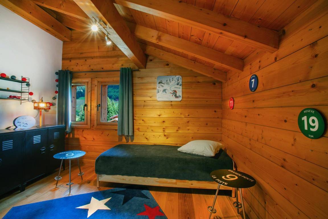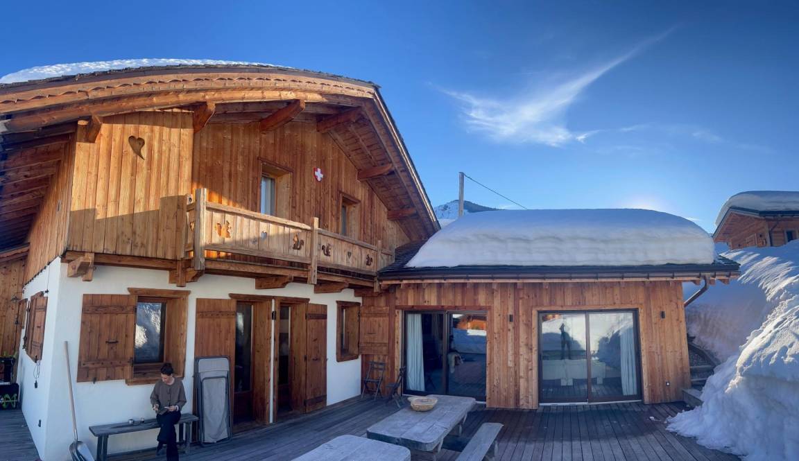 Freistehendes Chalet auf zwei Ebenen. Erdgeschoss: Großer Raum für Skier und Fahrräder, Eingangsbereich mit Waschküche, Wohnküche (mit Kaminofen, Tischfußball und Weinkeller), Wohnzimmer (mit Kamin und Starlink-TV), Schlafzimmer (mit Doppelbett 160x200 cm und Fernseher) mit Duschbad (Dusche und WC), separates WC. Obergeschoss: Galerie mit Fernseher, zwei Schlafzimmer mit Fernseher und Balkon (mit Doppelbett 160x200 cm / Doppelbett 160x210 cm) und Duschbad (Dusche und WC), ein Schlafzimmer (mit vier Einzelbetten 80x190 cm, die zu zwei Doppelbetten zusammengestellt werden können), Badezimmer (mit Badewanne), separates WC. Terrasse, Garten, privater Parkplatz.