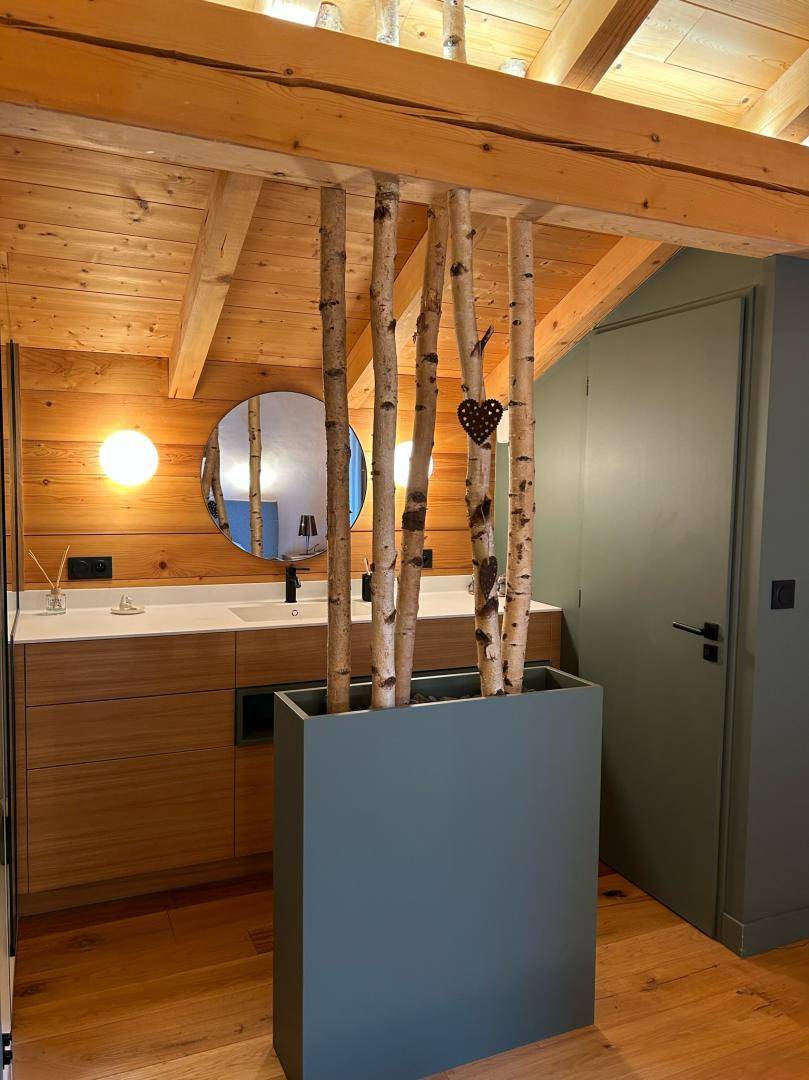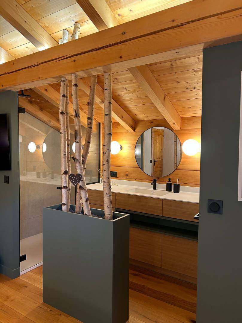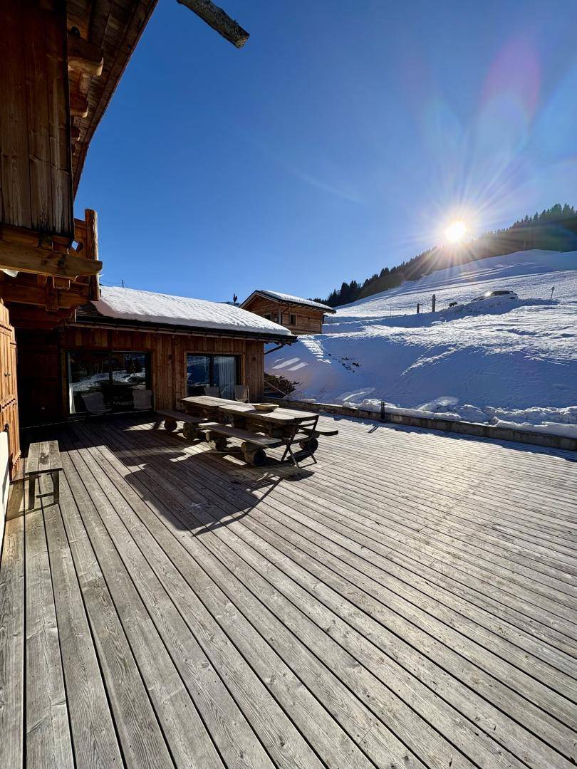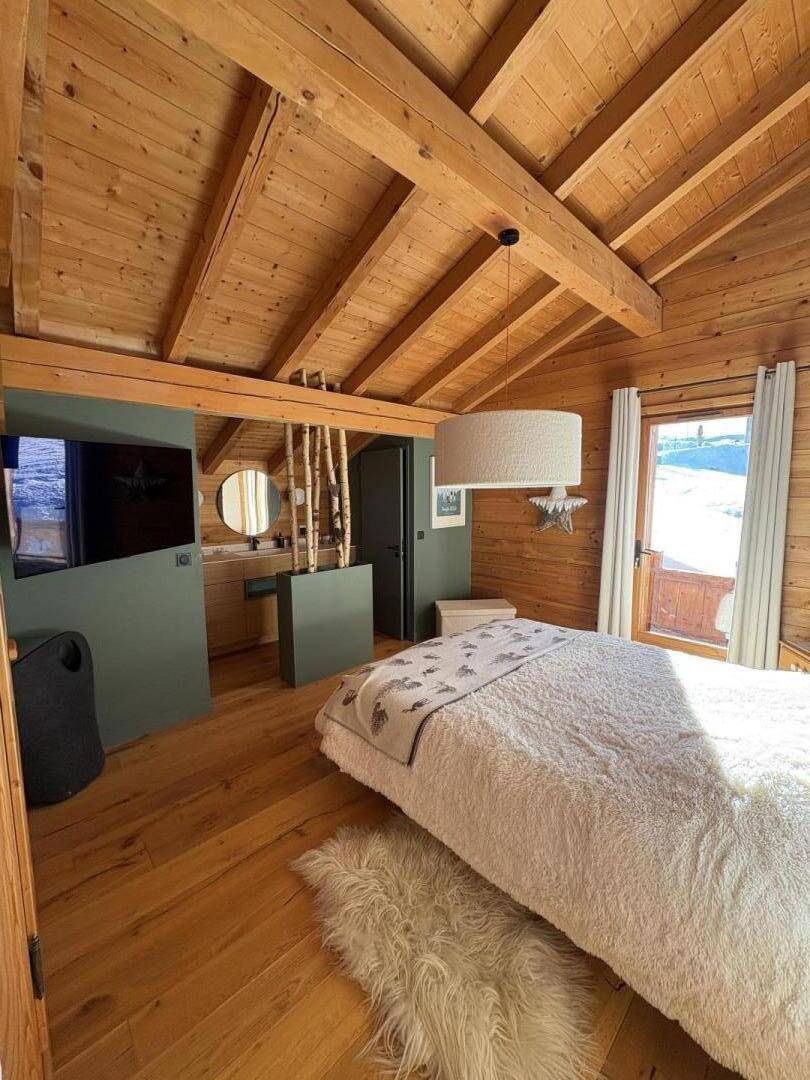 Dieses exklusive, freistehende Chalet liegt zwischen Notre-Dame-de-Bellecombe und Les Saisies, inmitten eines Naturschutzgebietes mit Almwiesen und Waldwiesen. Es besticht durch eine herrliche 100 m² große Terrasse und ein weitläufiges, sanft abfallendes Grundstück, das Ruhe und Erholung garantiert. Die großzügigen Räumlichkeiten, insbesondere das helle und einladende Wohnzimmer mit Kamin und großen Fenstern, wirken sofort einladend. Hochwertige Ausstattung und All-inclusive-Service sorgen für optimalen Komfort zu jeder Jahreszeit. Im Sommer steht vor dem Chalet eine 50 Meter lange, abfallende Zufahrt zum Parken bereit. Im Winter gibt es private Parkplätze am Straßenrand (für 2-3 Fahrzeuge je nach Größe) mit separatem Fußweg zum Chalet.
