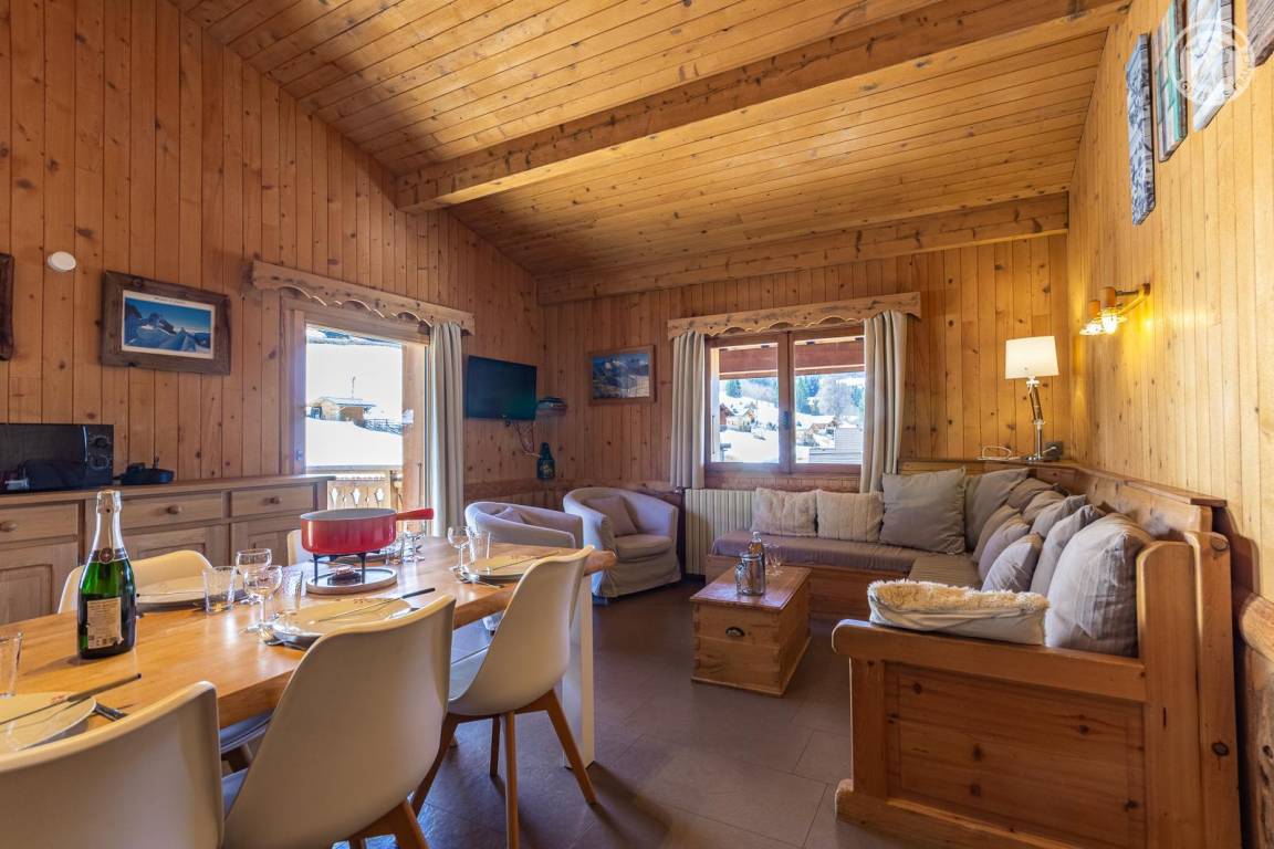 Modernes, stilvolles Chalet, 200 m von den Pisten und 8 km von Les Saisies entfernt. Wohngebiet am Südwesthang. Großer Komfort. Angenehmer Bergcharakter. Warm und gemütlich. Viel Charme. Riesiges Naturland. Herrlicher, sehr klarer Blick auf das Massiv und die Pisten. Skigebiet N.D. de Bellecombe 200 m / Espace Diamant, Les Saisies 8 km.