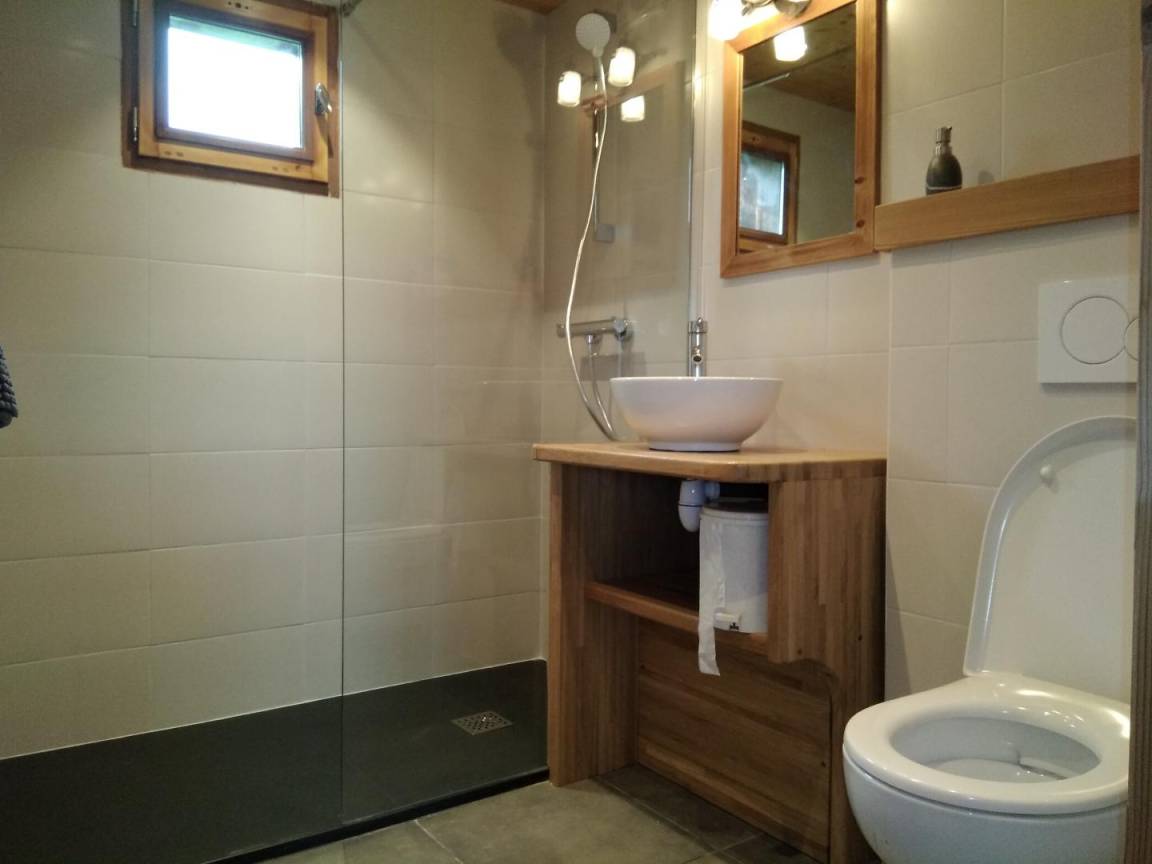 „L'accueil du propriétaire fut chaleureux. Le chalet à côté de trois autres identiques est très joli avec une belle vue et un joli jardin. Pour une famille de 4 personnes le chalet est toutefois assez petit (le frigo par exemple est vraiment juste pour 4). La route est toutefois passante (beaucoup de motos l'été) et les chiens des autres locataires pas toujours très calmes. Heureusement que la région regorge de choses à visiter et que nous ne sommes pas restés au gîte.“