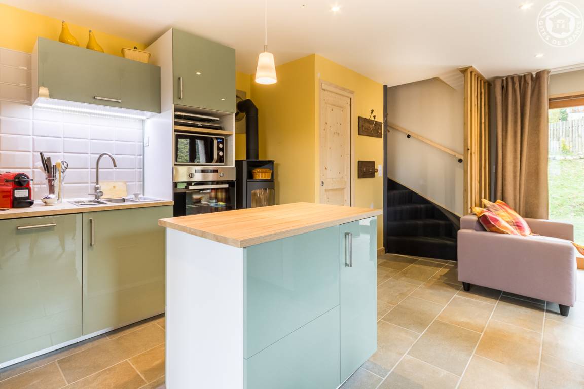 Einfamilienhaus auf 2 Ebenen. 1. Stock (Zugang über eine Holzaußentreppe): Wohnzimmer-Küchen-Loungebereich, Herd (Holz inklusive), WC, Bluetooth-Lautsprecher. 2. Stock: 2 Schlafzimmer (1 Doppelbett / 2 Einzelbetten, die zu 1 Doppelbett 160 x 190 cm zusammengestellt werden können), ein Duschbad mit WC (walk-in Dusche). Balkon und Balkonterrasse. Boden. Keller zur Aufbewahrung von Skiern und Fahrrädern.