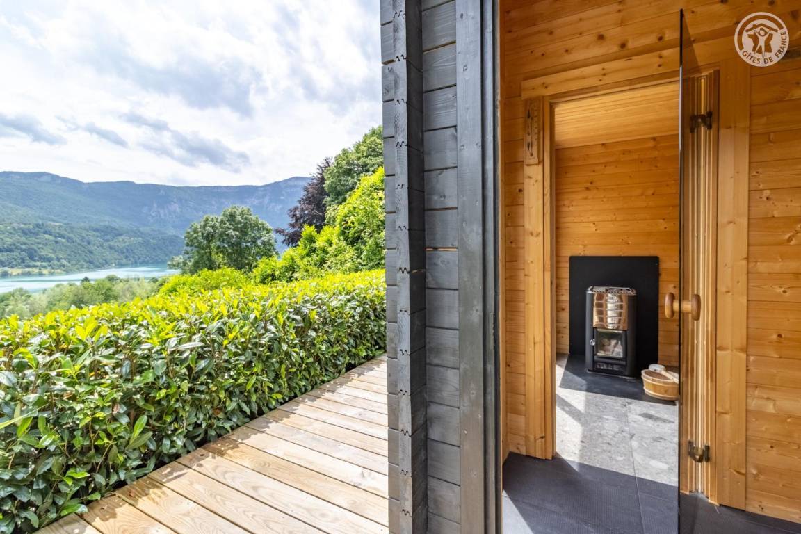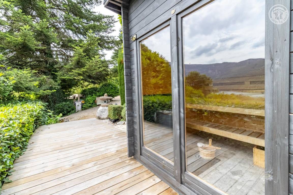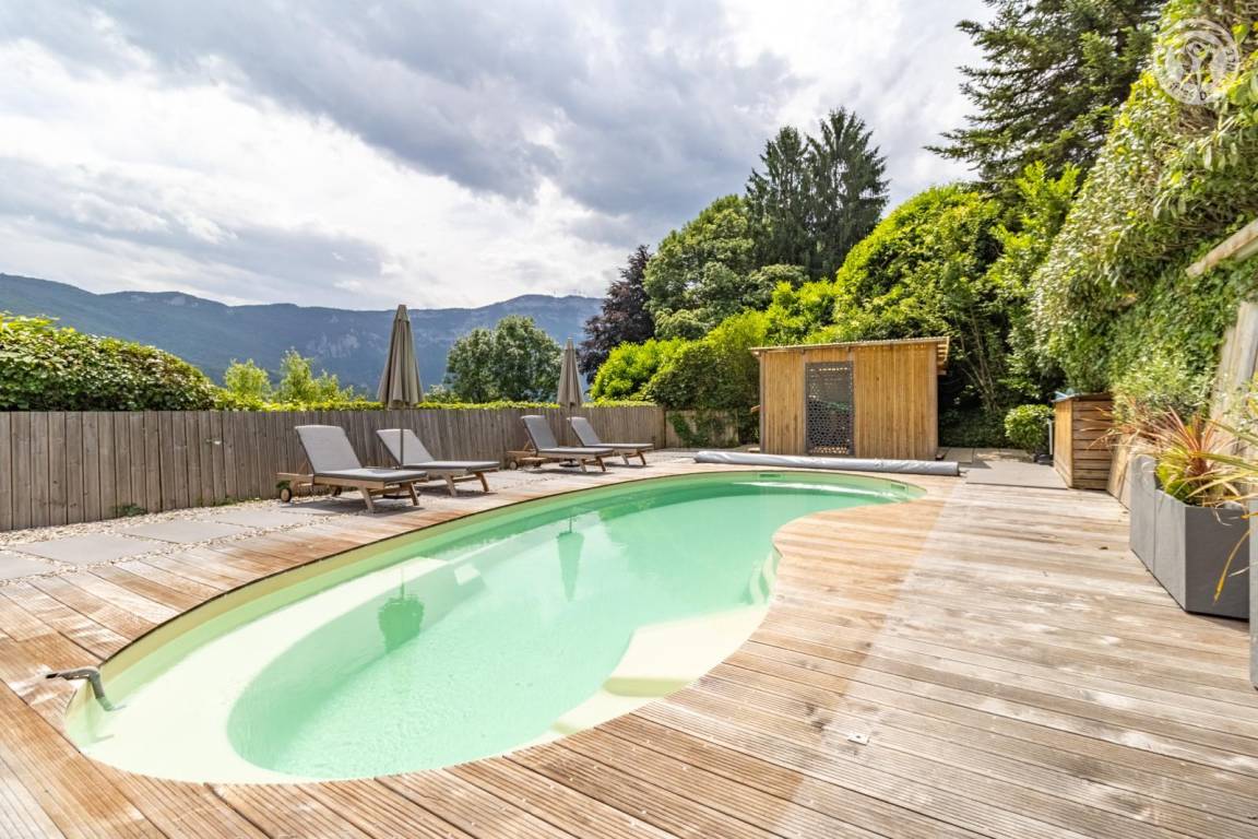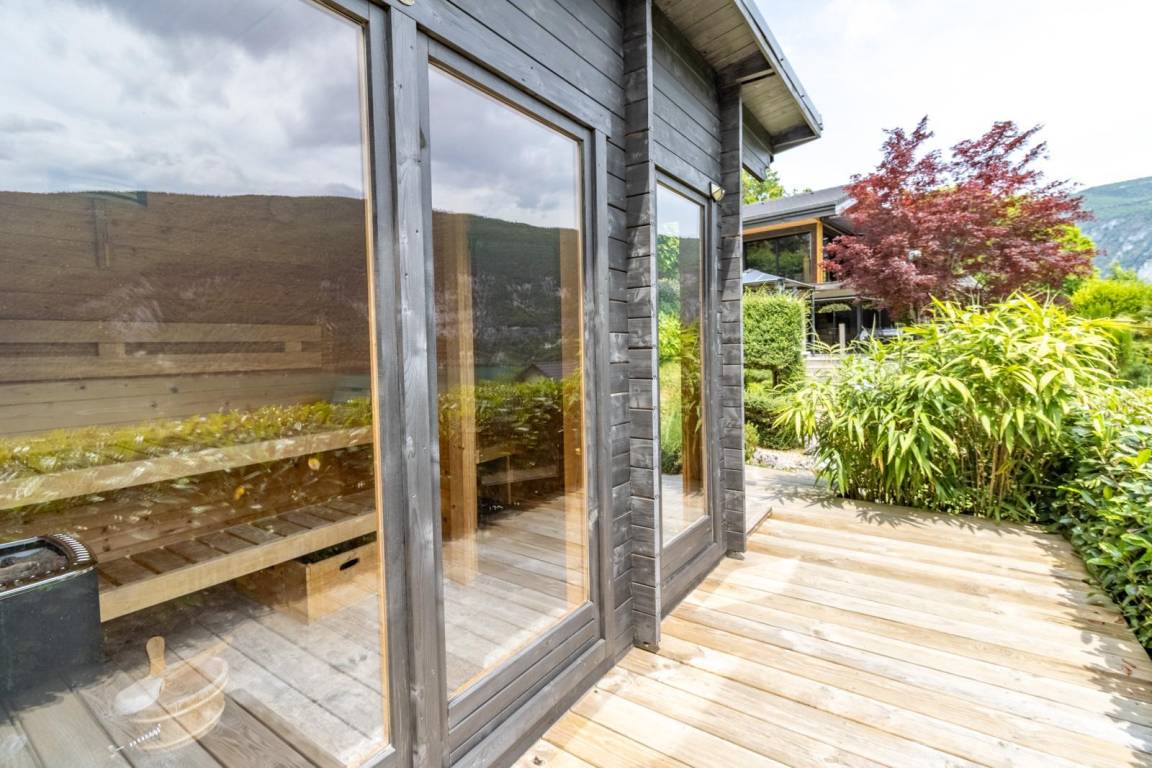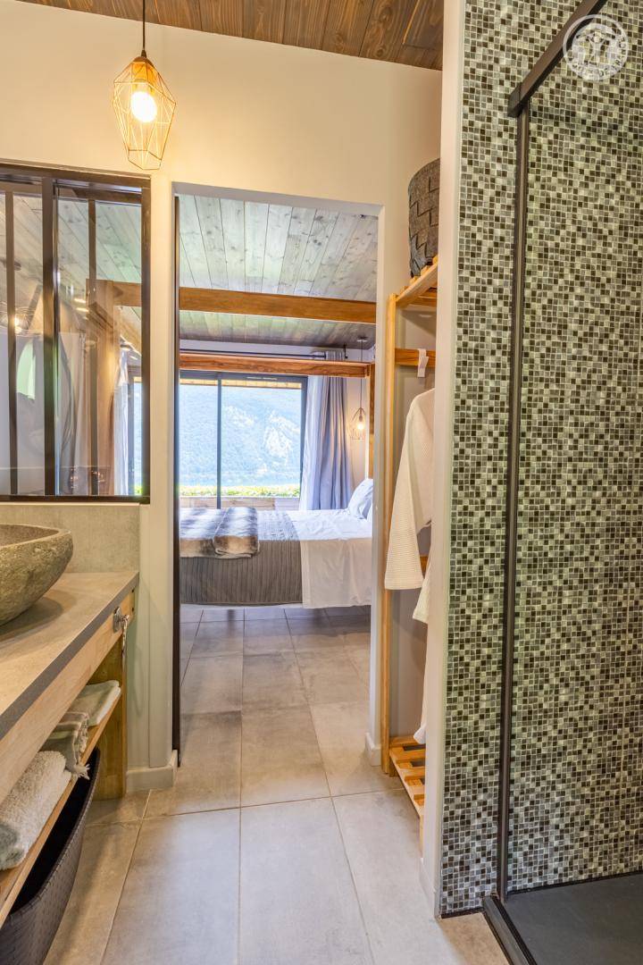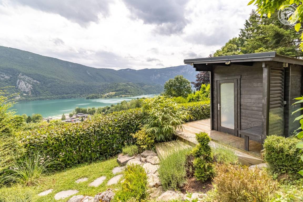 Dieses kleine Fachwerkhaus am Eingang des Grundstücks bietet Ihnen absolute Unabhängigkeit und Privatsphäre, ganz ohne Nachbarn. Am Hang gelegen, wirkt es wie versteckt in der Natur und bietet einen atemberaubenden Blick auf den darunterliegenden See. Vom Wohnzimmer, der Terrasse oder sogar vom Bett aus genießen Sie einen atemberaubenden Blick auf den Lac de Aiguebelette. Zu den Annehmlichkeiten für einen zauberhaften Aufenthalt gehören ein privater Wellnessbereich, eine Sauna und ein beheizter Außenpool sowie hochwertige Materialien für ein optimales, erholsames und intimes Erlebnis.
