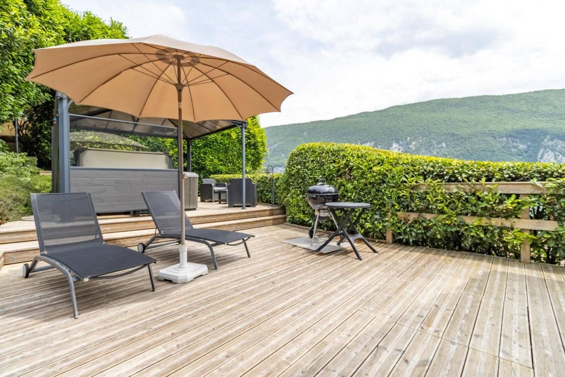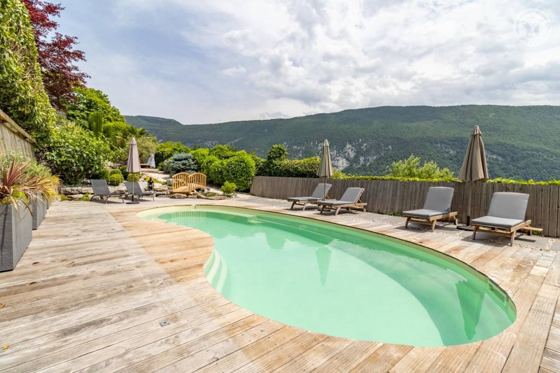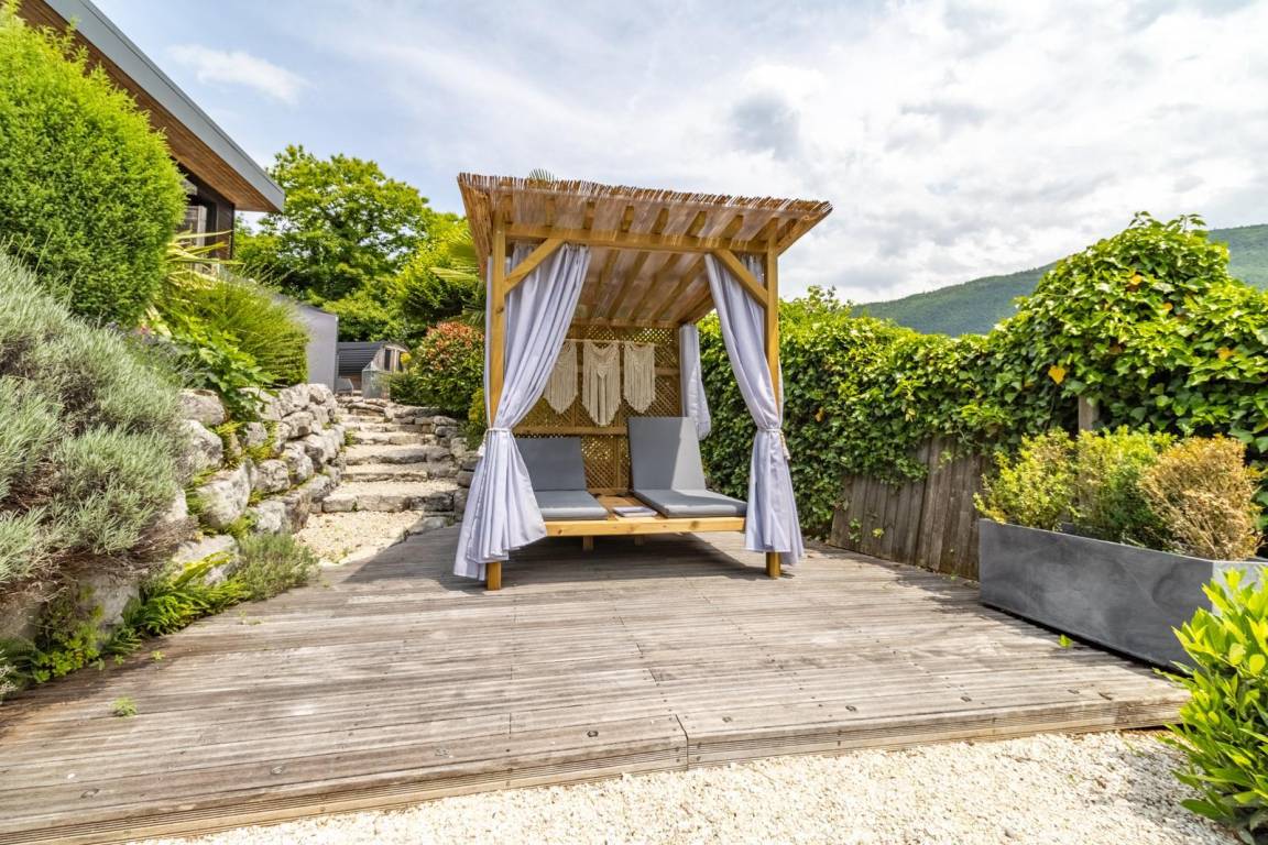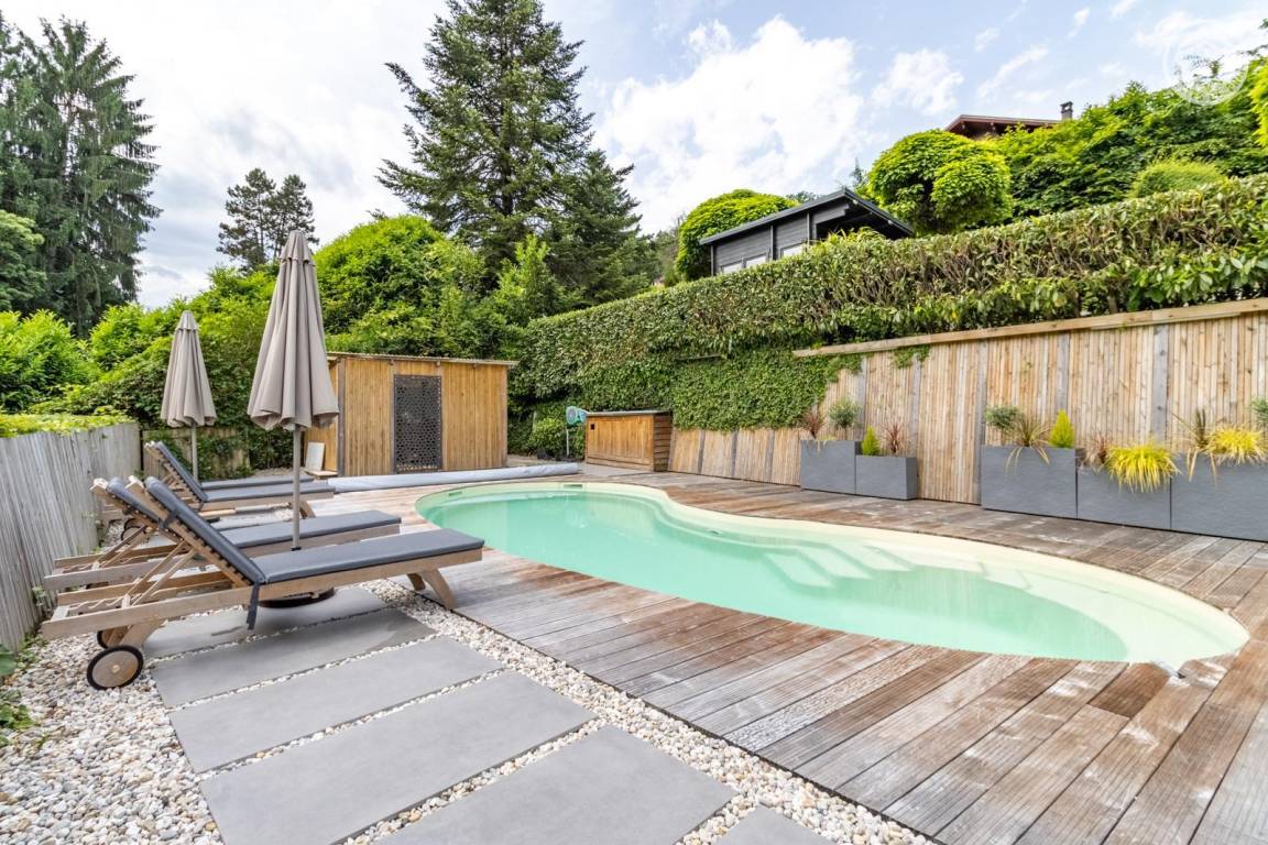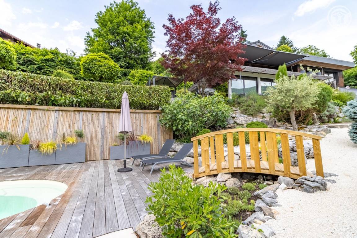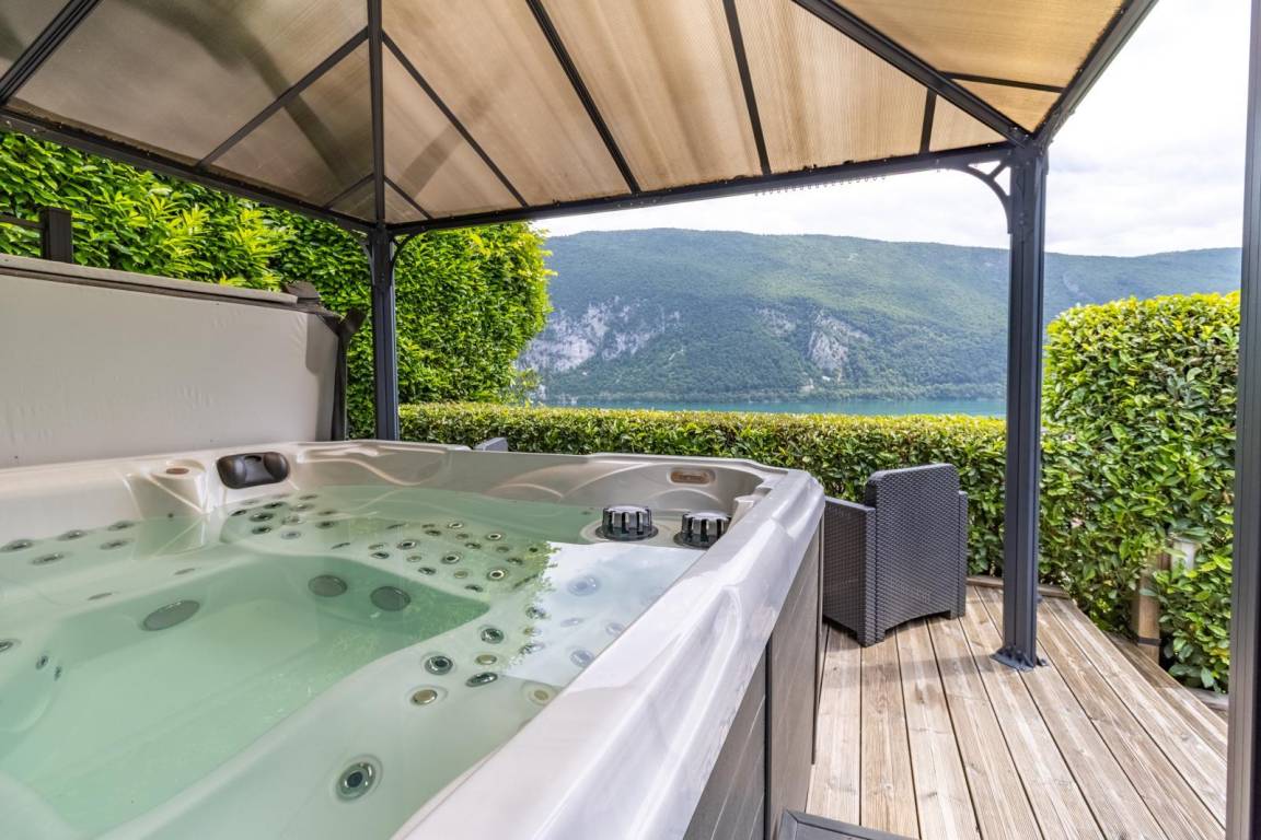 Dieses kleine Fachwerkhaus am Eingang des Grundstücks bietet Ihnen absolute Unabhängigkeit und Privatsphäre, ganz ohne Nachbarn. Am Hang gelegen, wirkt es wie versteckt in der Natur und bietet einen atemberaubenden Blick auf den darunterliegenden See. Vom Wohnzimmer, der Terrasse oder sogar vom Bett aus genießen Sie einen atemberaubenden Blick auf den Lac de Aiguebelette. Zu den Annehmlichkeiten für einen zauberhaften Aufenthalt gehören ein privater Wellnessbereich, eine Sauna und ein beheizter Außenpool sowie hochwertige Materialien für ein optimales, erholsames und intimes Erlebnis.