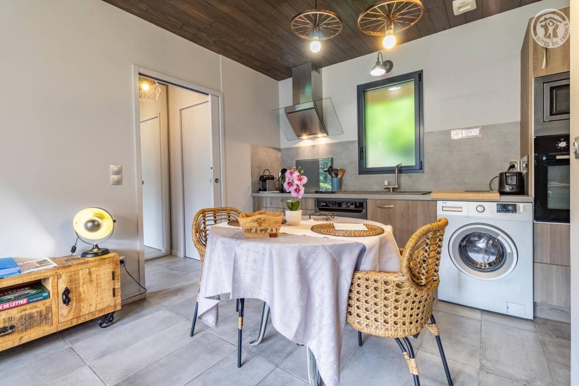 Kleines, freistehendes, einstöckiges Haus am Eingang zum weitläufigen Grundstück der Eigentümer. Zugang über eine Außentreppe, die hinunter zum Kiesboden führt. Auf einer Ebene: Wohnküche, Schlafzimmer (1 Doppelbett 180 x 200 cm), Badezimmer (ebenerdige Dusche) im Schlafzimmer, separates WC. 1 privater Parkplatz auf dem Grundstück. Privater überdachter Whirlpool auf der großen privaten Terrasse, gemeinsame Sauna (geplant) (mit einer weiteren kleinen Touristenunterkunft), gemeinsamer beheizter Außenpool (freier Zugang) von Mai bis Ende September. Angrenzender privater, umzäunter Garten.