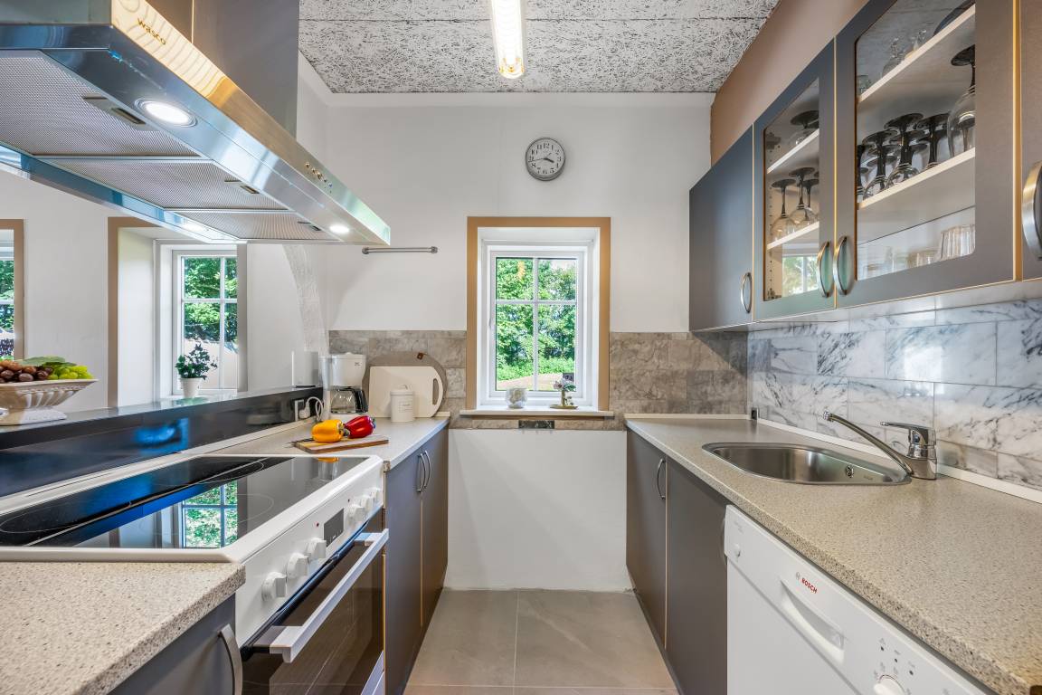 KücheDie Küche ist mit Kühlschrank ausgestattet. Außerdem gibt es 4 Keramik-Kochfelder, Umluftofen, Mikrowelle sowie Geschirrspüler.