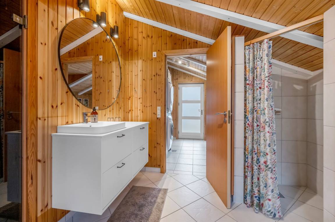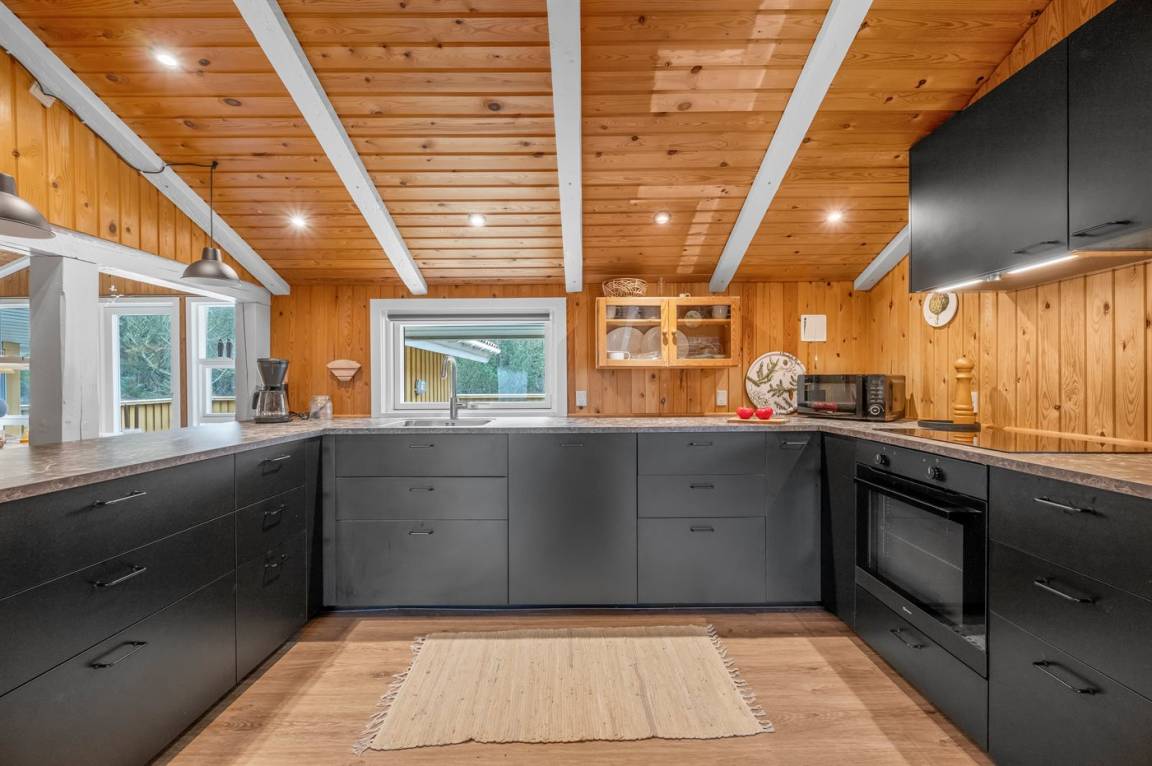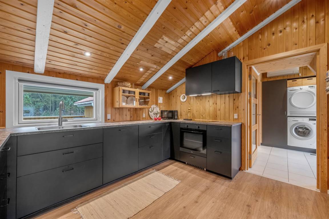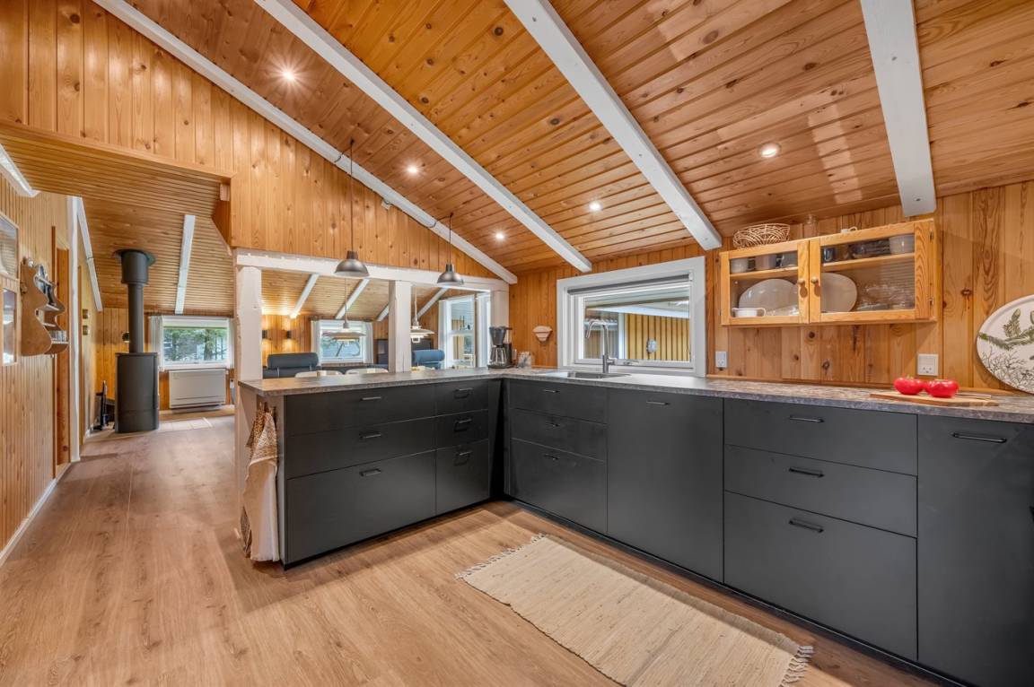 Im Inneren begrüßt euch das Haus mit einem praktischen Eingangsbereich mit Platz für Jacken und Schuhe. Hier findet ihr auch eine Waschmaschine und einen Trockner, sodass sich die kleinen praktischen Dinge des Alltags ganz einfach erledigen lassen – auch im Urlaub. Die Wohnküche bildet den Mittelpunkt vieler gemütlicher Urlaubsmomente. Sie ist gut ausgestattet, unter anderem mit Induktions-Kochzonen, Geschirrspüler und Mikrowelle, sodass ihr im Urlaub gemeinsam kochen könnt. Im Wohnbereich gibt es einen Essplatz, einen Fernseher sowie einen gemütlichen Kaminofen, der an kühleren Tagen Wärme und Atmosphäre verbreitet.