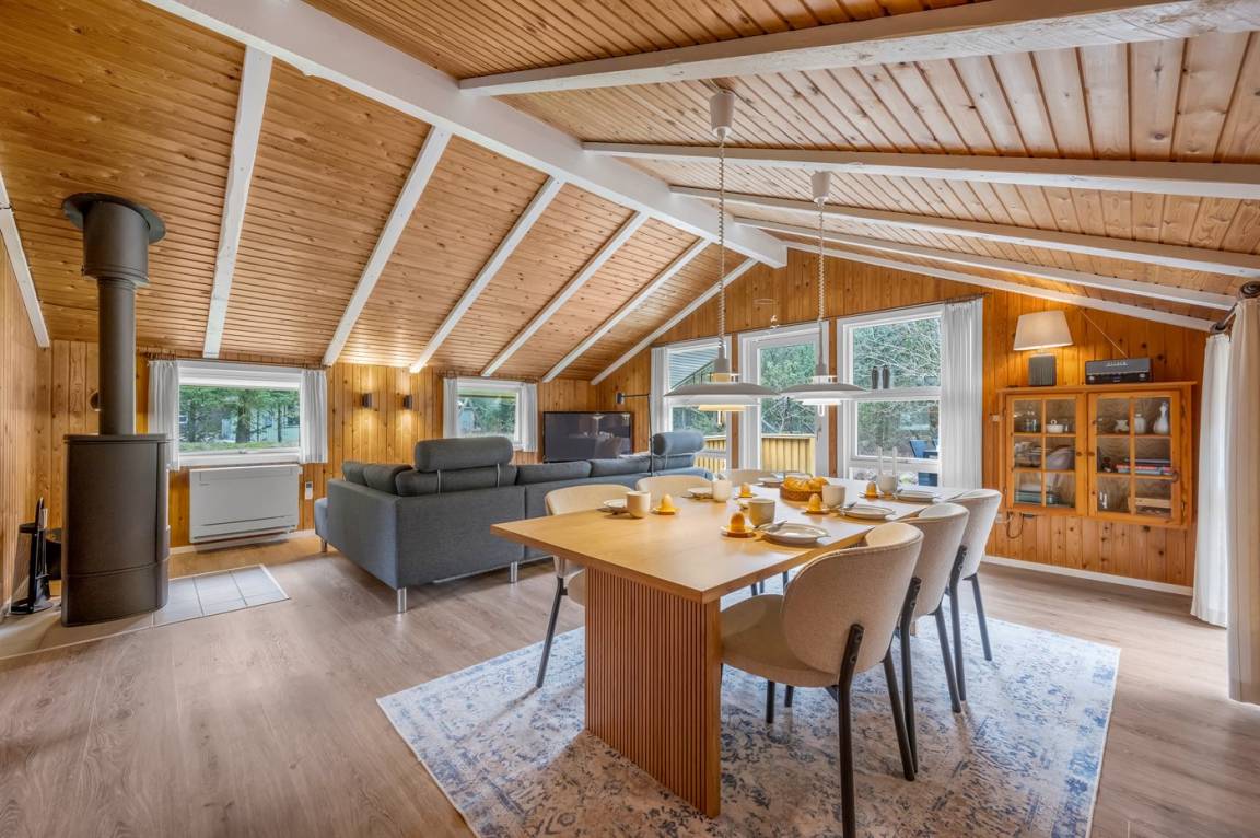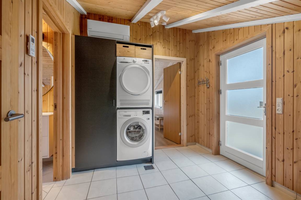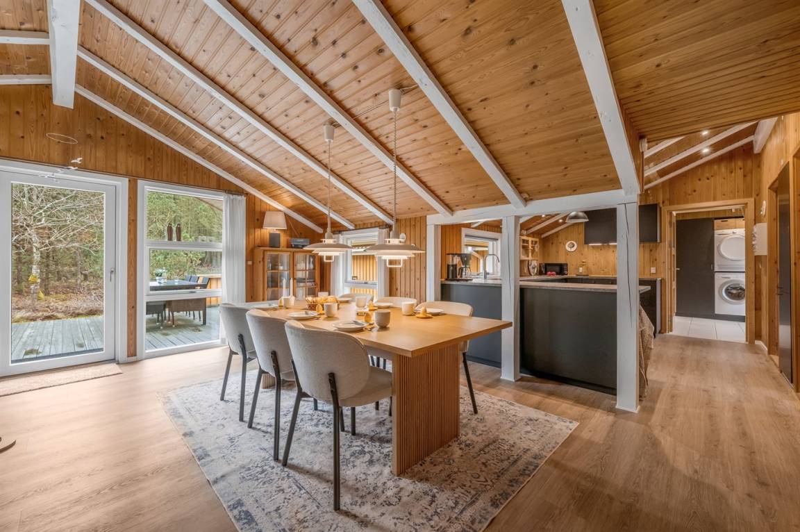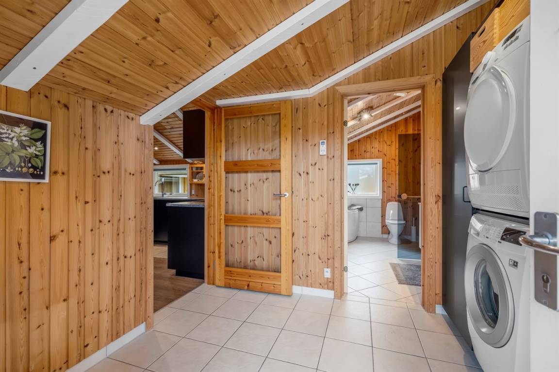 Im Inneren begrüßt euch das Haus mit einem praktischen Eingangsbereich mit Platz für Jacken und Schuhe. Hier findet ihr auch eine Waschmaschine und einen Trockner, sodass sich die kleinen praktischen Dinge des Alltags ganz einfach erledigen lassen – auch im Urlaub. Die Wohnküche bildet den Mittelpunkt vieler gemütlicher Urlaubsmomente. Sie ist gut ausgestattet, unter anderem mit Induktions-Kochzonen, Geschirrspüler und Mikrowelle, sodass ihr im Urlaub gemeinsam kochen könnt. Im Wohnbereich gibt es einen Essplatz, einen Fernseher sowie einen gemütlichen Kaminofen, der an kühleren Tagen Wärme und Atmosphäre verbreitet.