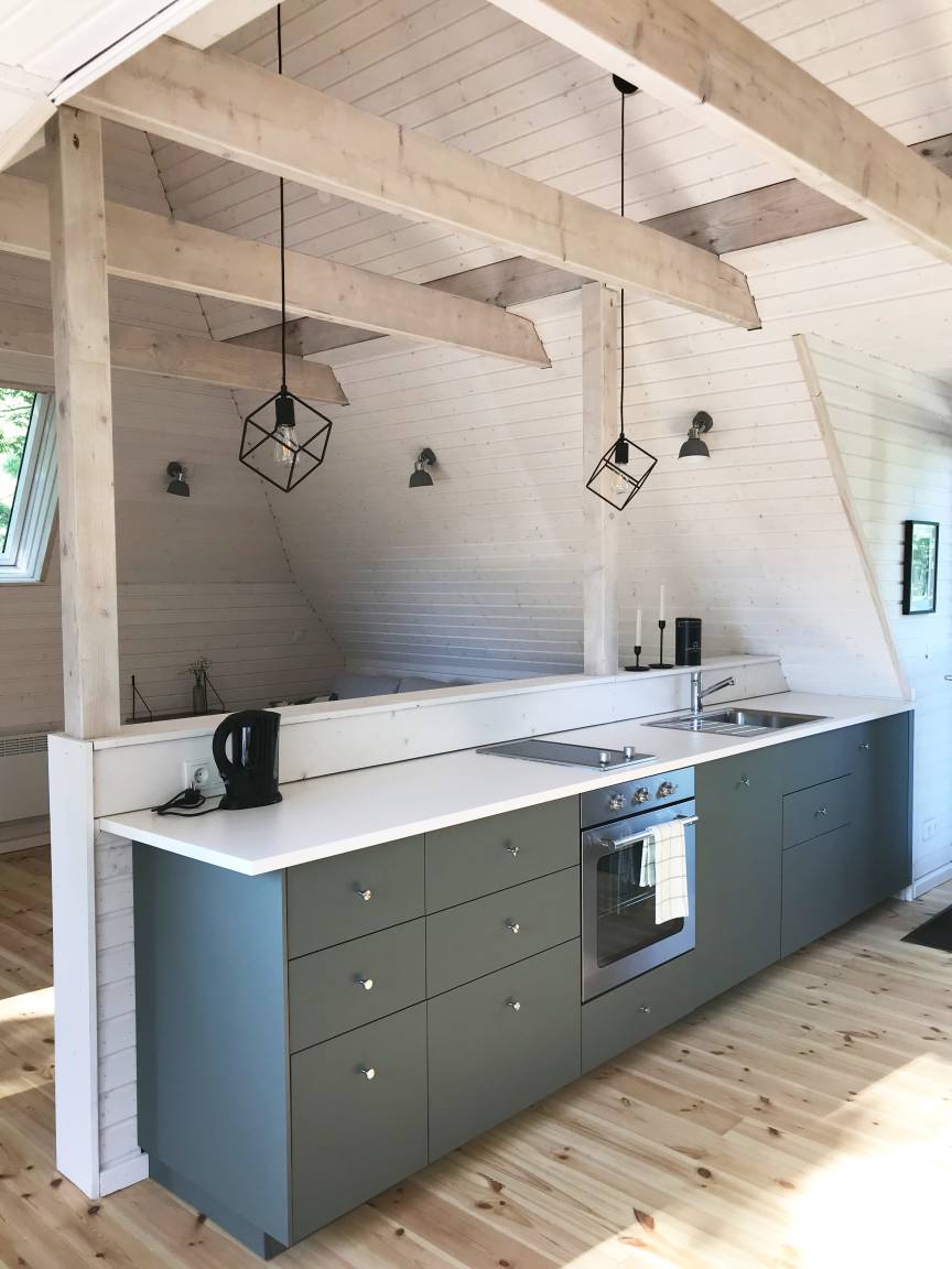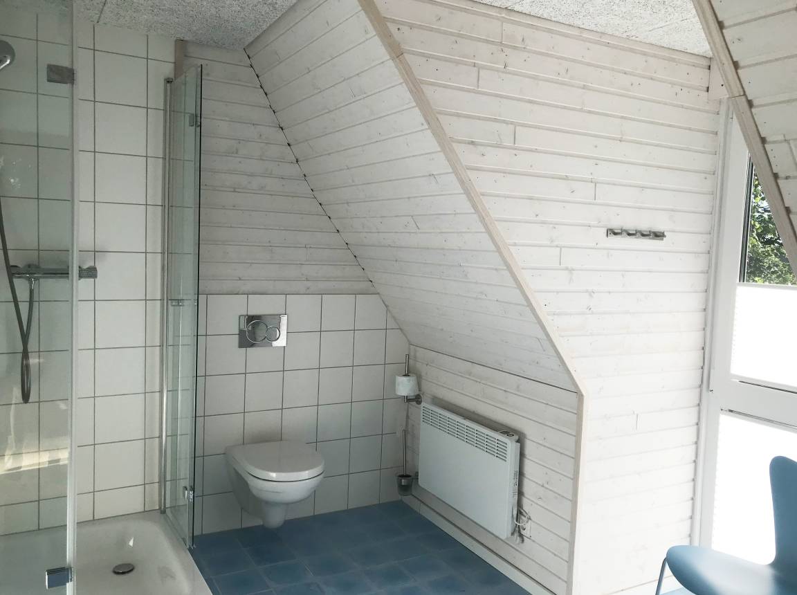 Die "Waldwohnung" ist eine moderne, im skandinavischen Stil eingerichtete Ferienwohnung im Dachgeschoss für bis zu zwei Personen. Die Wohnung besteht aus einem offenem Wohn- und Esszimmer sowie einer gut ausgestatteten Küche die über eine halbhohe Wand vom Wohnraum abgetrennt ist, sowie einem gemütlichen Schlafzimmer und einem großzügigen Bad. Die Küche verfügt über einen Backofen mit Kochfeld, einen Geschirrspüler, eine Mikrowelle und einen Kühlschrank mit Gefrierfach. Im Schlafraum ist ein Doppelbett mit Blick auf einen wandhängenden Fernseher vorhanden. Im Badezimmer ist eine großzügige Dusche mit verglaster Duschkabine, ein Waschtisch mit Stauraum und ein WC. Die Wohnung erschließt sich über eine kurze Treppe mit vorgelagertem Balkon. Aus der im Dachgeschoss liegenden Ferienwohnung blickt man in den großen grünen Garten und die Wipfel der Bäume, die das Grundstück umsäumen. In der Einrichtung spiegelt sich dies Thema wieder. So erschließt sich der Name "Waldwohnung". Die Fußböden sind aus geölten Holzdielen oder rustikalen Fliesen in warmen Farben. Die Wände sind im skandinavischen Design mit lasierten Brettern in weiß verkleidet, die Deckenbalken - ebenfalls weiß lasiert - sind sichtbar. Große vollverglaste, bodentiefe Gauben lassen viel Tageslicht in die helle Wohnung. Genießen Sie von der großzügigen Terrasse, das Rauschen der Blätter, das vielstimmige Vogelkonzert, das Spiel von Licht und Schatten und den Blick in die Bäume und den schleswig-holsteinischen Himmel. Zu der Wohnung gehört eine sehr große voll möblierte Terrasse mit Sonnenliege, Tisch und Stühlen, sowie Grill und Sonnenschirm.