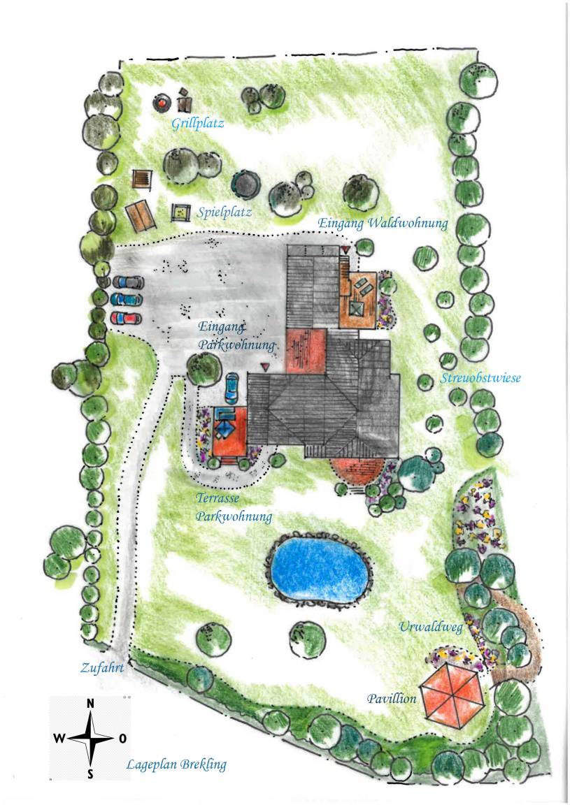 Die Ferienwohnungen liegen in einem ortsprägenden ehemaligen Bauernhaus im Zentrum des Dorfes Brekling am Langsee. Das Haus wurde ca. 1920 errichtet und die Ferienwohnung wurde 2017 komplett saniert und modernisiert. Eine Mischung aus antiken Elementen mit modernen Einrichtungen und viel Komfort bildet das Ambiente der Wohnung, die sich über die Etagen Erd- und Dachgeschoss erstreckt. Das vorhandene 6000 m² große parkähnliche Grundstück kann uneingeschränkt genutzt werden. Direkt am Haus befindet sich der PKW-Stellplatz und Unterstellmöglichkeiten für Fahrräder und Angelsachen. Die Ferienwohnungen liegen ca. fünf Autominuten von der Kleinstadt Schleswig entfernt. Die nächstgelegene Einkaufsmöglichkeit ist ebenfalls ca. 5 min - im Nachbarort Böklund - entfernt. Die Schlei, der Freizeitpark "TolkSchau", der 500 m entfernte Langsee sowie die Ost- und Nordsee, die Städte Flensburg und Kappeln sind jeweils schnell erreicht. Auch ein Abstecher nach Dänemark oder in die Landeshauptstadt Kiel sind als entspannte Tagestouren zu empfehlen. Zahlreiche kleine Straßen und Wege bieten die Möglichkeit zu ausgedehnten Fahrrad- oder Wandertouren. Das Haus Brekling wird neben der Ferienwohnung als Privatwohnsitz und Büro genutzt.