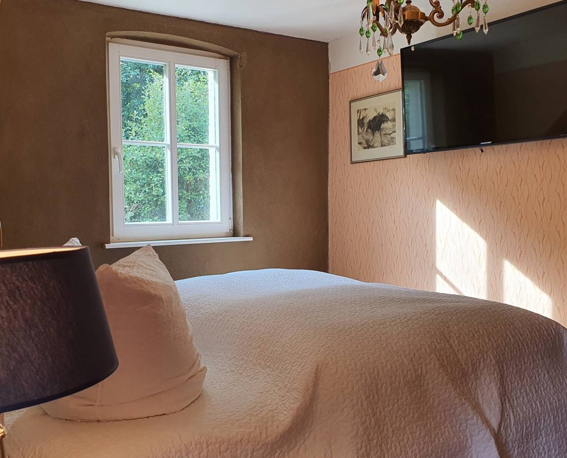 Das 27,8 qm große Zimmer hat ein Schlafzimmer im 30iger Jahre Stil mit Doppelbett (2,0mx2,0m) und großem Wand-TV, einen kleinen Arbeitsbereich auf dem Flur, ein separates Duschbad und verfügt zudem über einen Ausblick auf die Pferdeweide.