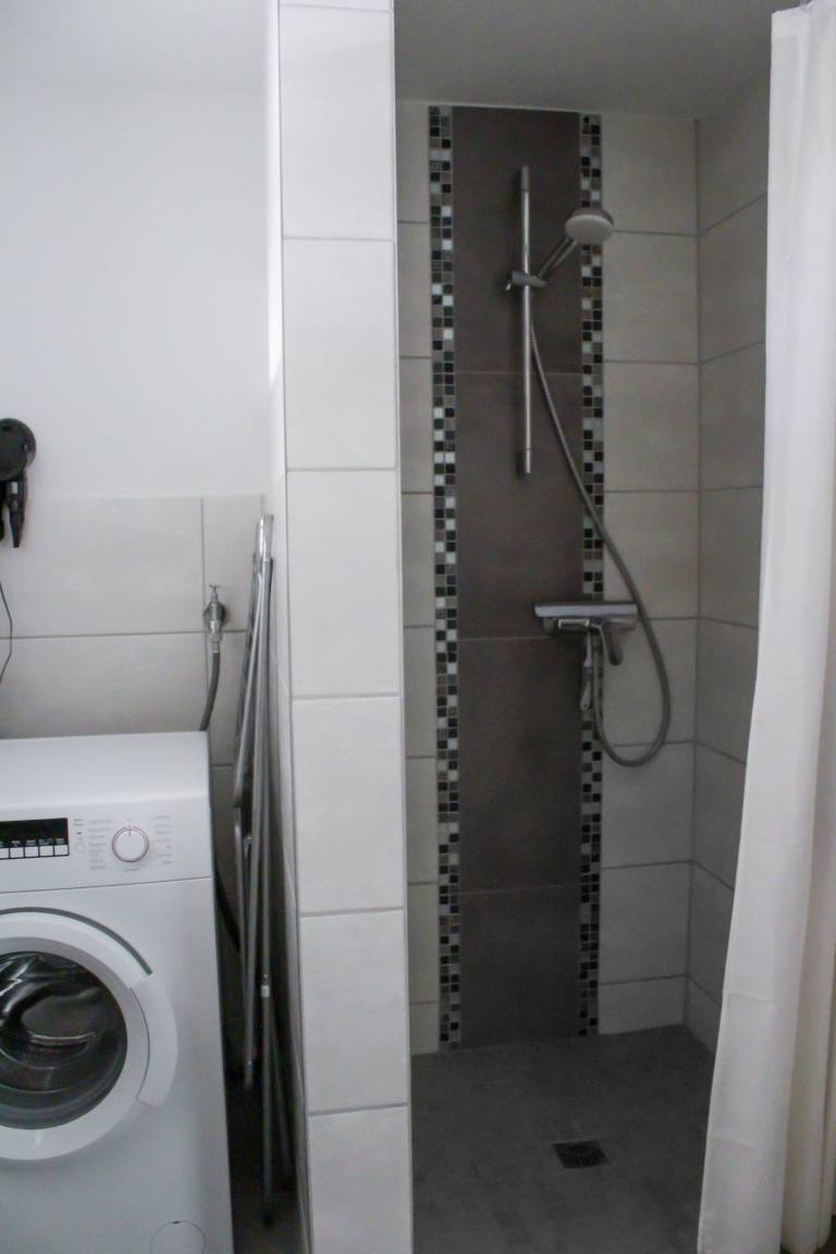 Wohnküche mit Schlafsofa, Bad mit Waschmaschine.