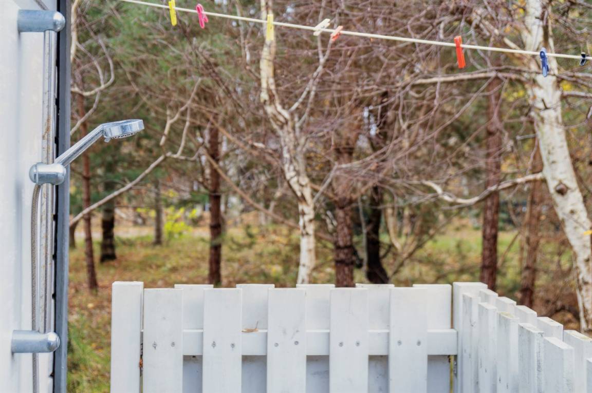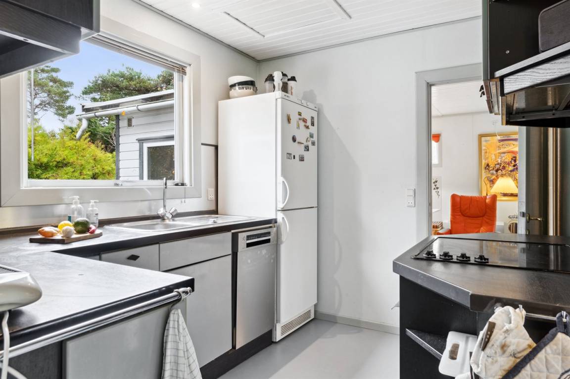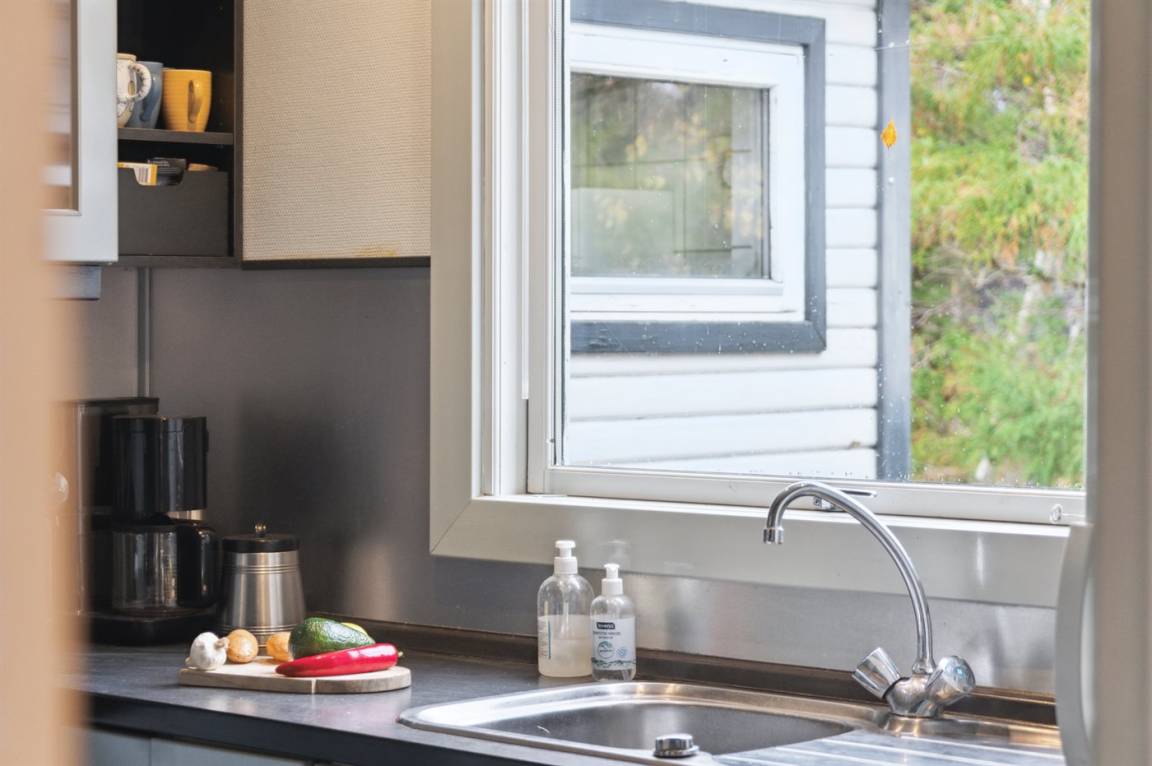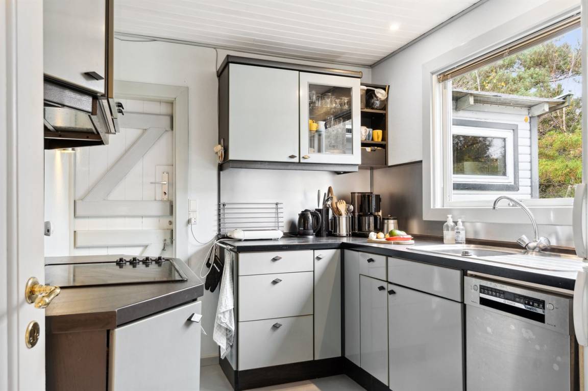 Die Küche grenzt direkt an das Wohnzimmer und den Essbereich, von dem aus man auf die überdachte Terrasse gelangt. Es gibt 2 Schlafzimmer, jedes mit 2 Schlafplätzen, und ein Badezimmer mit Dusche und Fußbodenheizung. Das Haus wird energieeffizient mit einer Luft-Luft-Wärmepumpe beheizt. Außerdem gibt es eine Außendusche und eine Waschmaschine.
