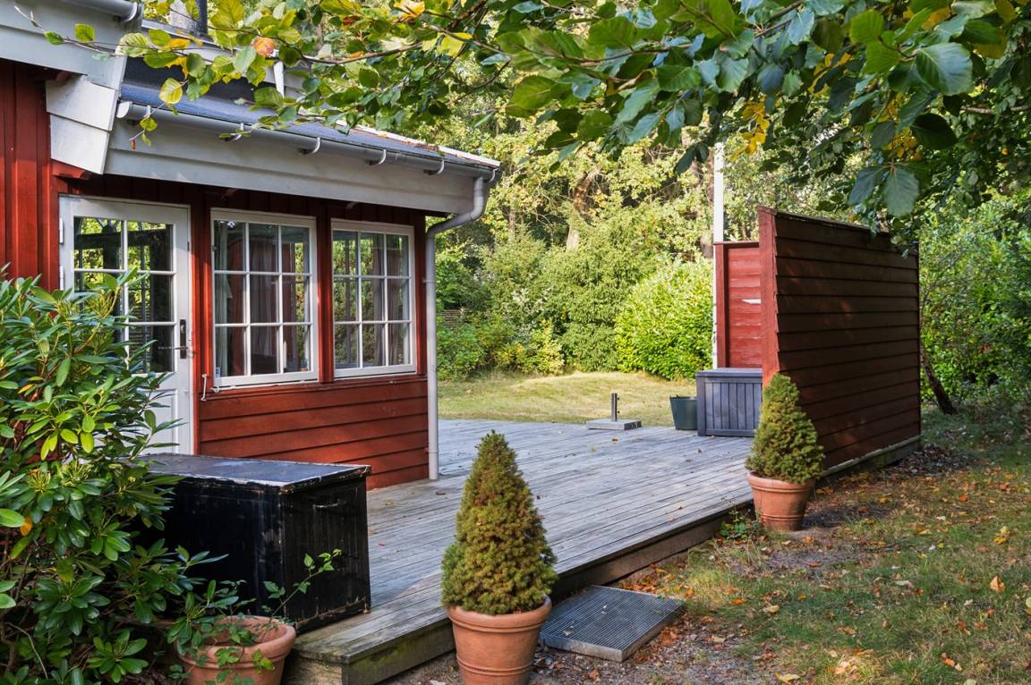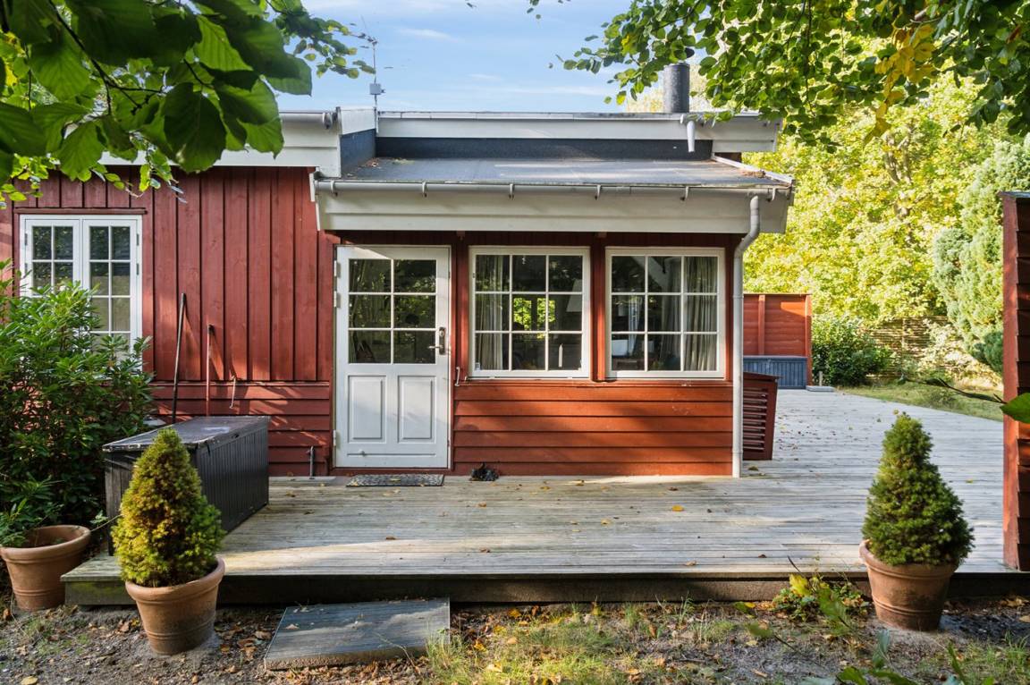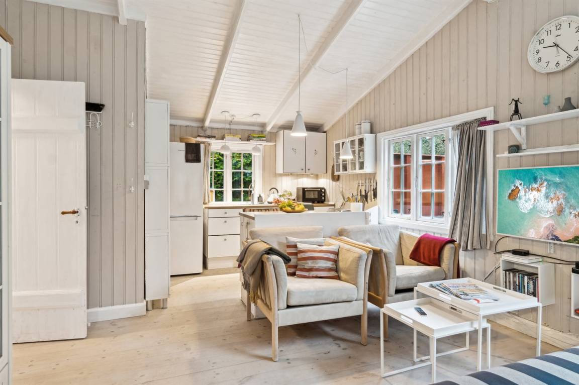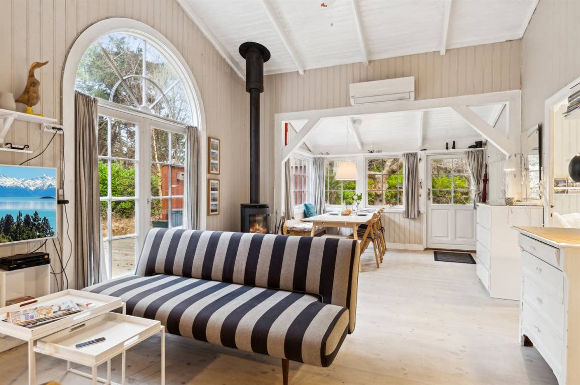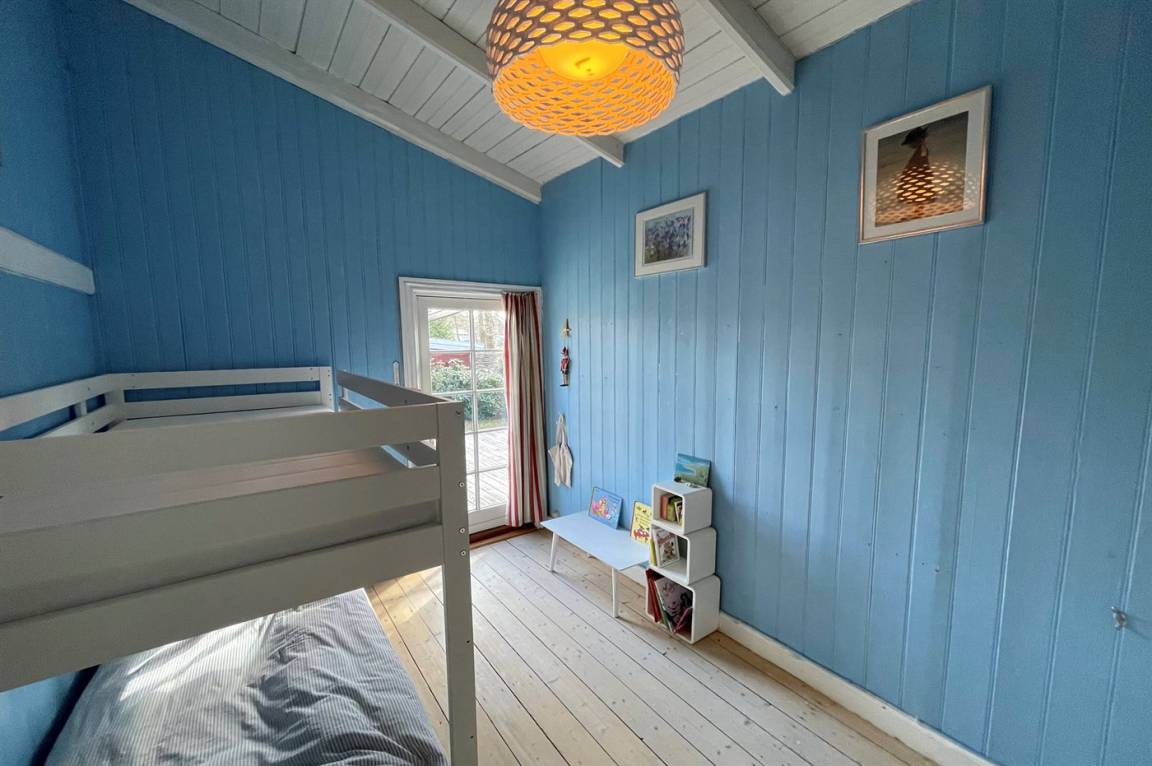 Der große Wohnbereich mit Küche, Wohnzimmer und Essplatz sowie dem Zugang zur Nordterrasse, zusammen mit der Südterrasse, die mit einer elektrischen Markise ausgestattet ist, sind die natürlichen Mittelpunkte für Gemütlichkeit und gemeinsames Beisammensein. Das Haus ist hell und luftig dank der großen Sprossenfenster und der hohen Decken. Es gibt drei Schlafzimmer, jedes mit zwei Schlafplätzen. Das Badezimmer ist mit einer Duschniche ausgestattet, und es gibt eine Waschmaschine.