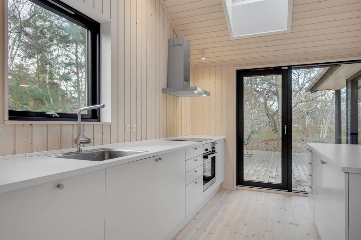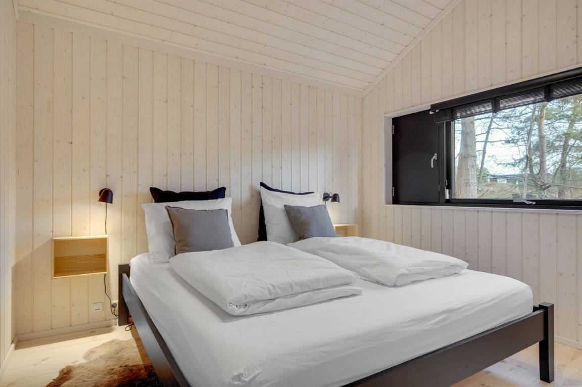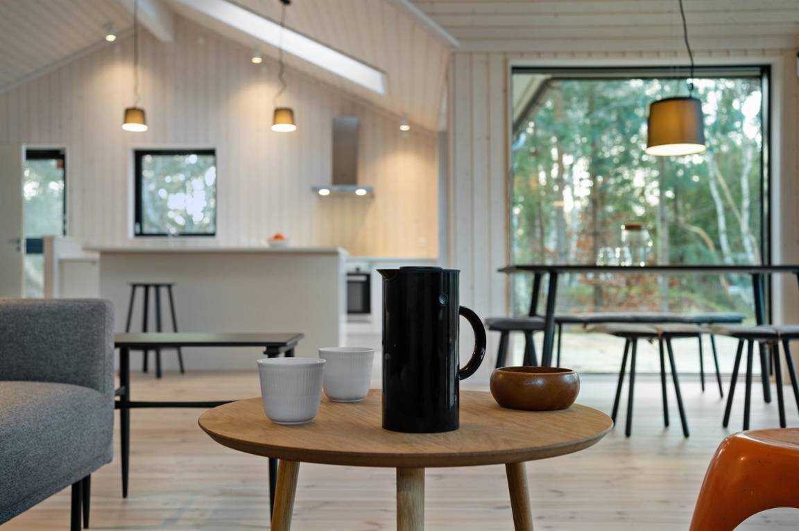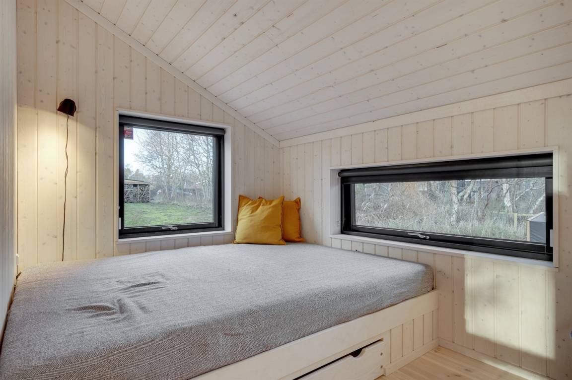 Die Innenräume des Hauses sind offen, hell und modern eingerichtet. Dank der hellen Verkleidungen, der großen Fensterfronten und der bis unter das Dach reichenden Decke in allen Räumen ist das Raumgefühl luftig und angenehm. Die moderne Küche grenzt offen an Essplatz und Wohnzimmer an. Es gibt 2 Schlafzimmer mit je 2 Schlafplätzen sowie ein großer Alkoven mit 2 Schlafplätzen, die sich auch zum Entspannen hervorragend eignet. Das Badezimmer ist mit Fußbodenheizung, Duschnische mit Regendusche und einem direkten Zugang zur Terrasse sowie zu den Außenduschen ausgestattet. Das Haus ist funktional und besteht rundum aus hochwertigen Materialien.