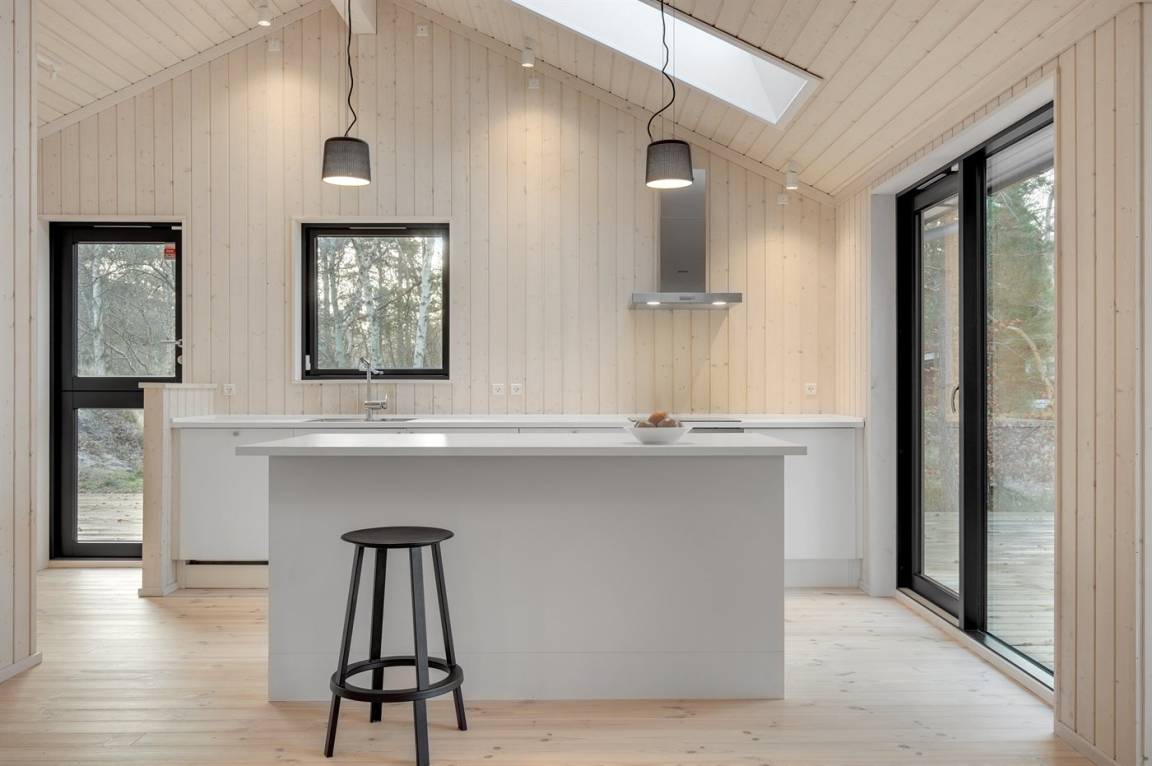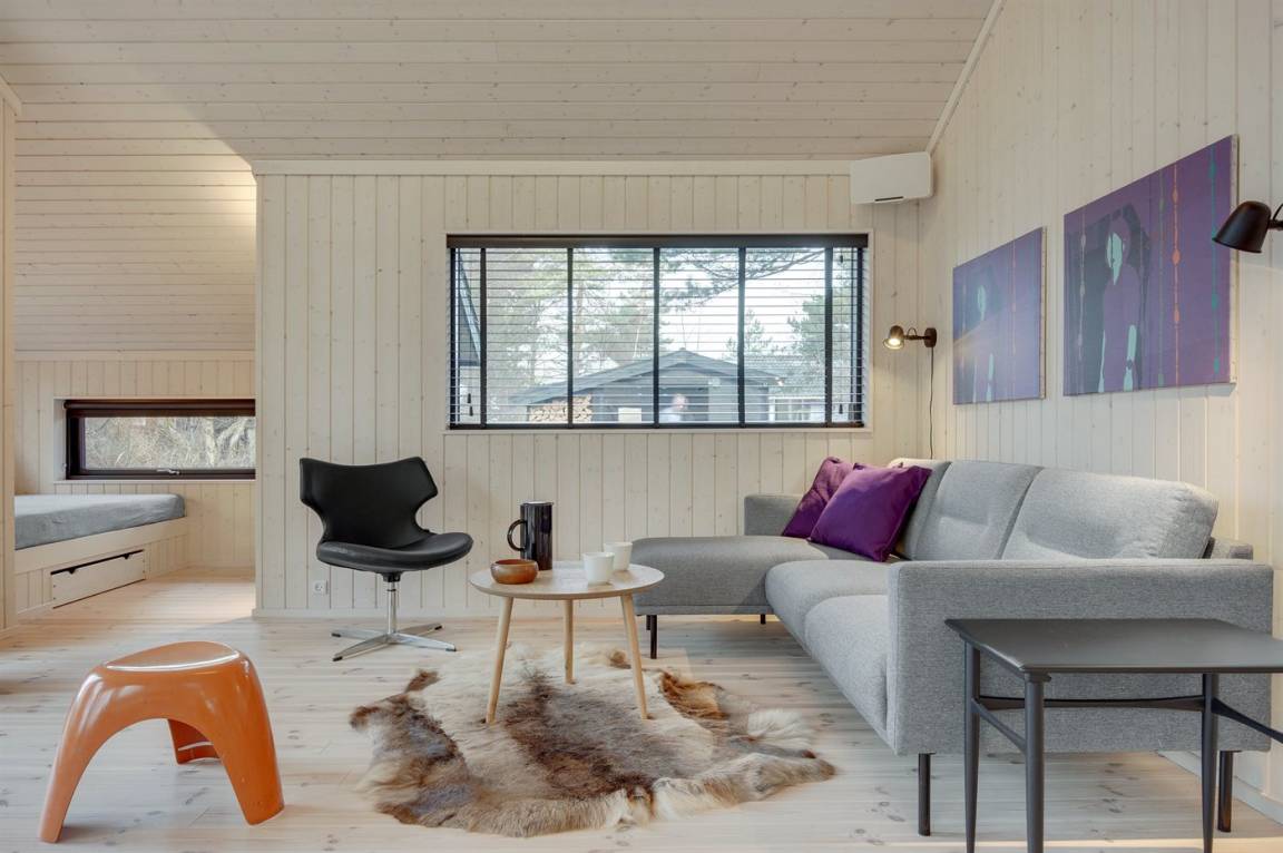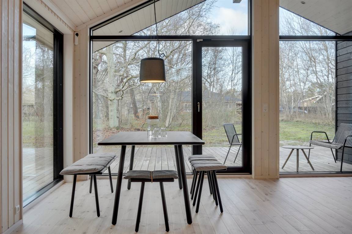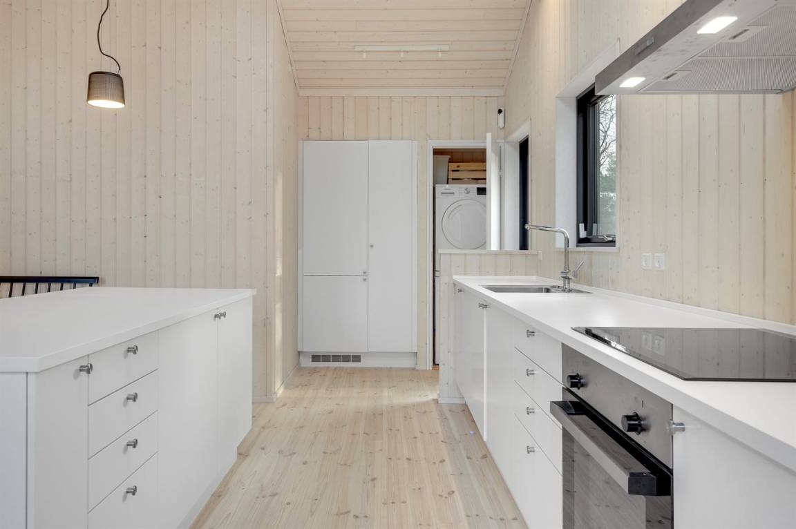 Die Innenräume des Hauses sind offen, hell und modern eingerichtet. Dank der hellen Verkleidungen, der großen Fensterfronten und der bis unter das Dach reichenden Decke in allen Räumen ist das Raumgefühl luftig und angenehm. Die moderne Küche grenzt offen an Essplatz und Wohnzimmer an. Es gibt 2 Schlafzimmer mit je 2 Schlafplätzen sowie ein großer Alkoven mit 2 Schlafplätzen, die sich auch zum Entspannen hervorragend eignet. Das Badezimmer ist mit Fußbodenheizung, Duschnische mit Regendusche und einem direkten Zugang zur Terrasse sowie zu den Außenduschen ausgestattet. Das Haus ist funktional und besteht rundum aus hochwertigen Materialien.