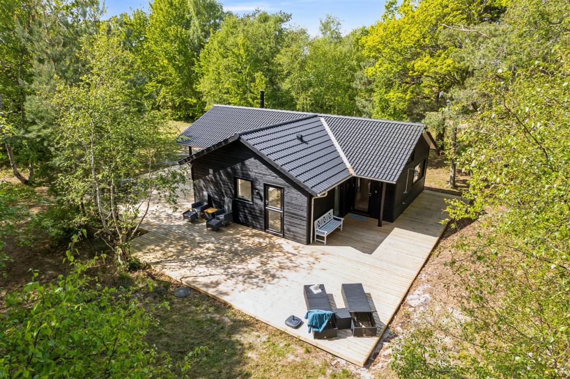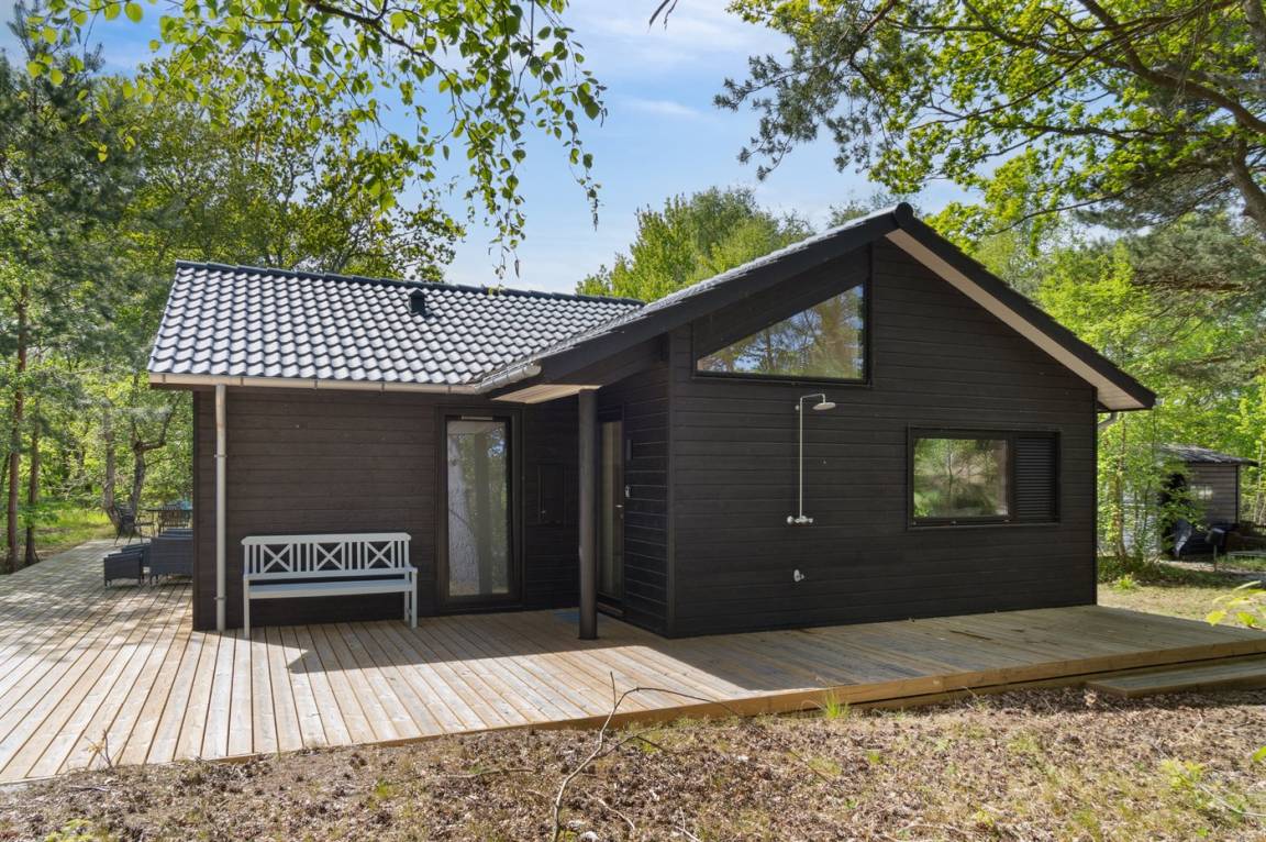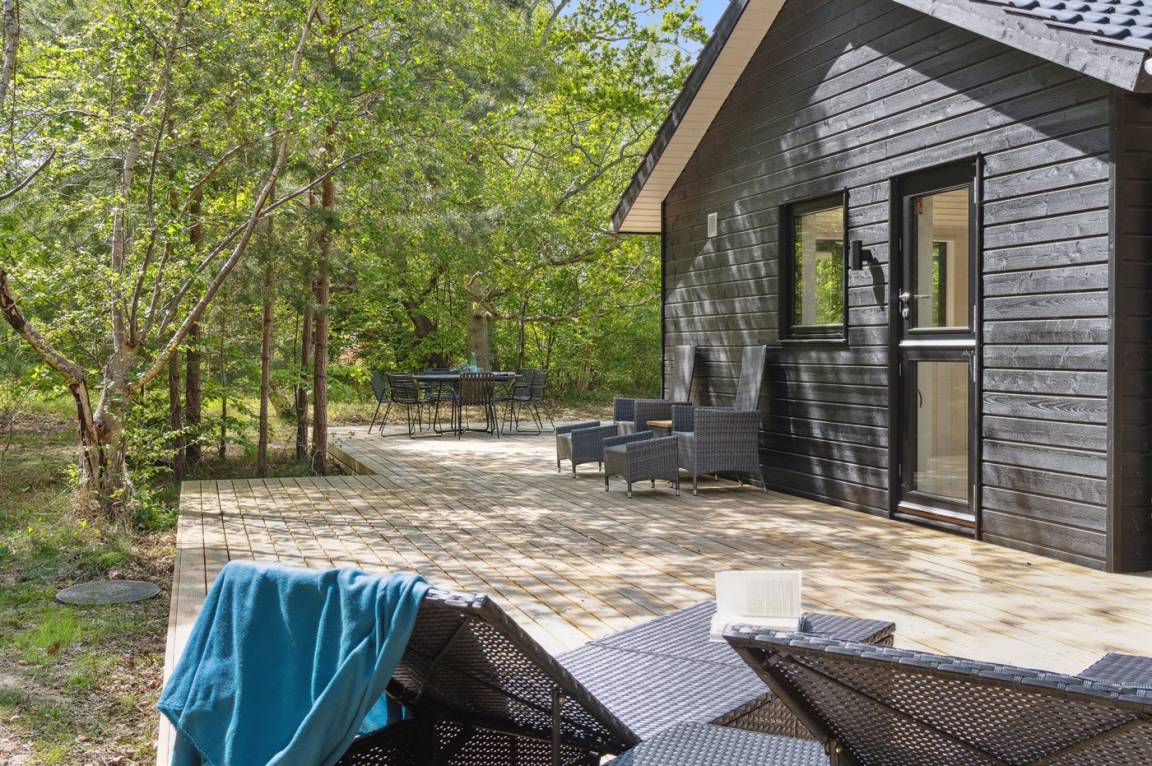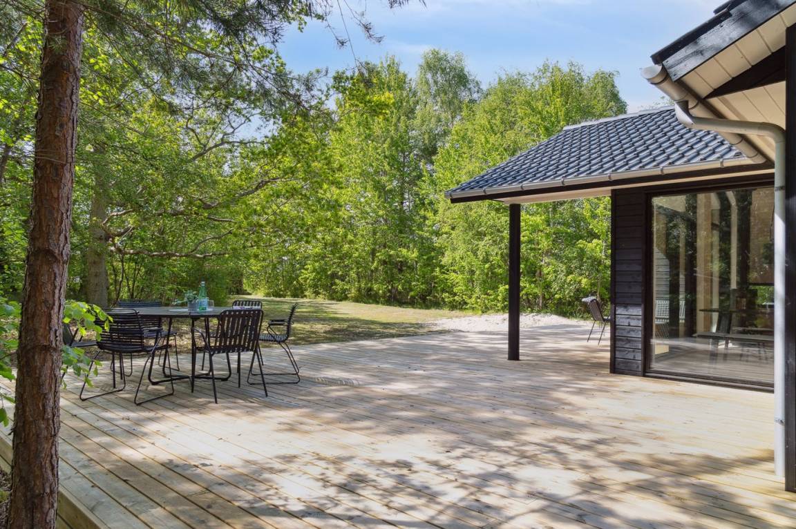 Dieses neue, moderne Ferienhaus liegt auf einem großen Naturgrundstück mit hohen Bäumen, nur 175 m von einem der besten und kinderfreundlichsten Sandstrände Dänemarks entfernt. Das Haus ist ringsherum von einer riesigen Holzterrasse mit Außenduschen umgeben, die teilweise überdacht ist. Hier finden Sie immer Sonne, Schatten oder Windstille.