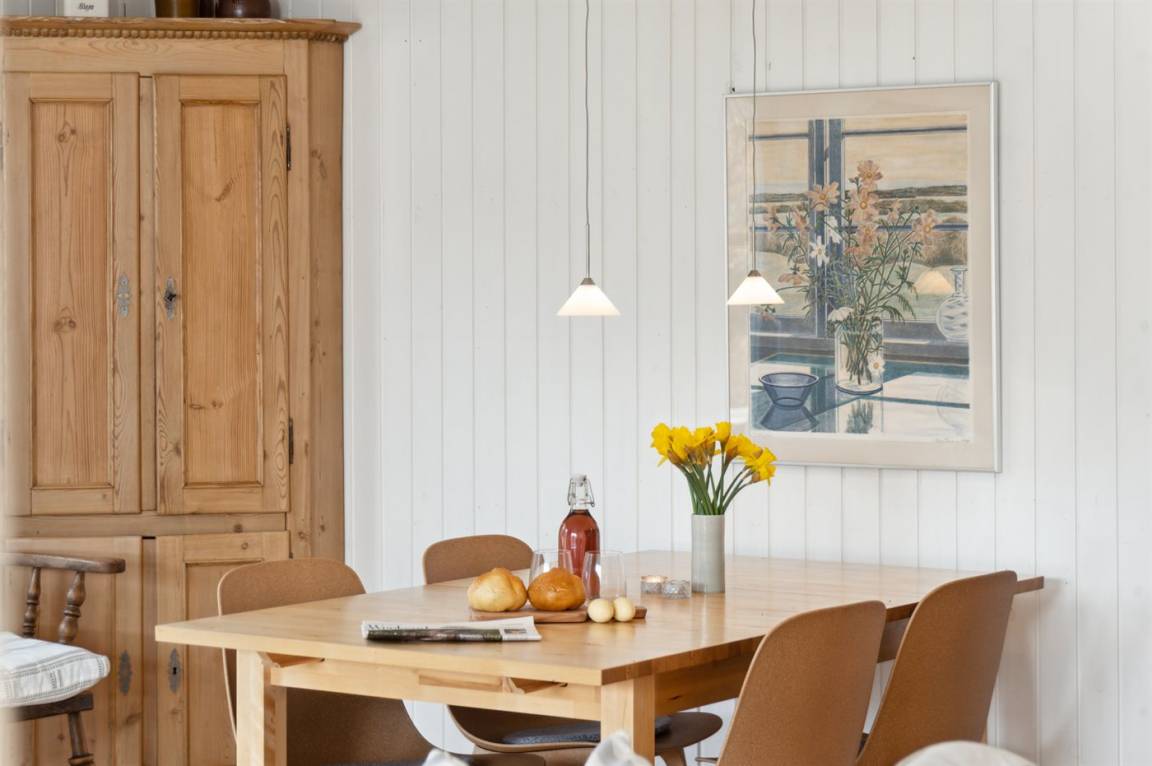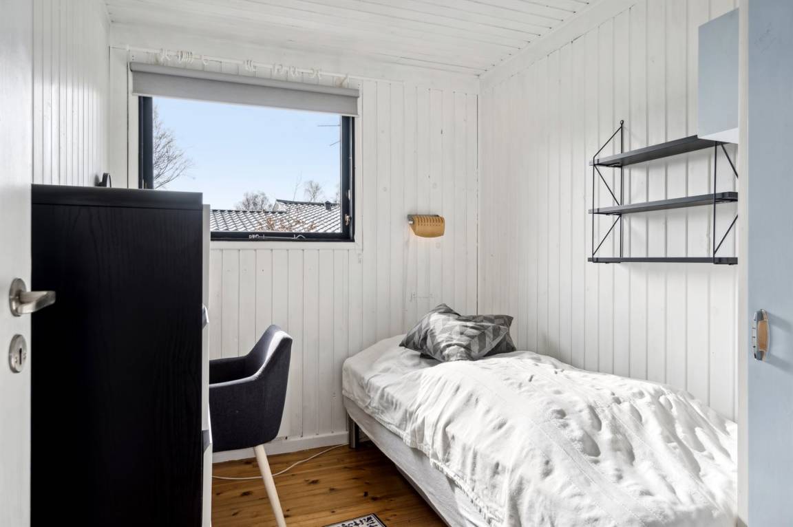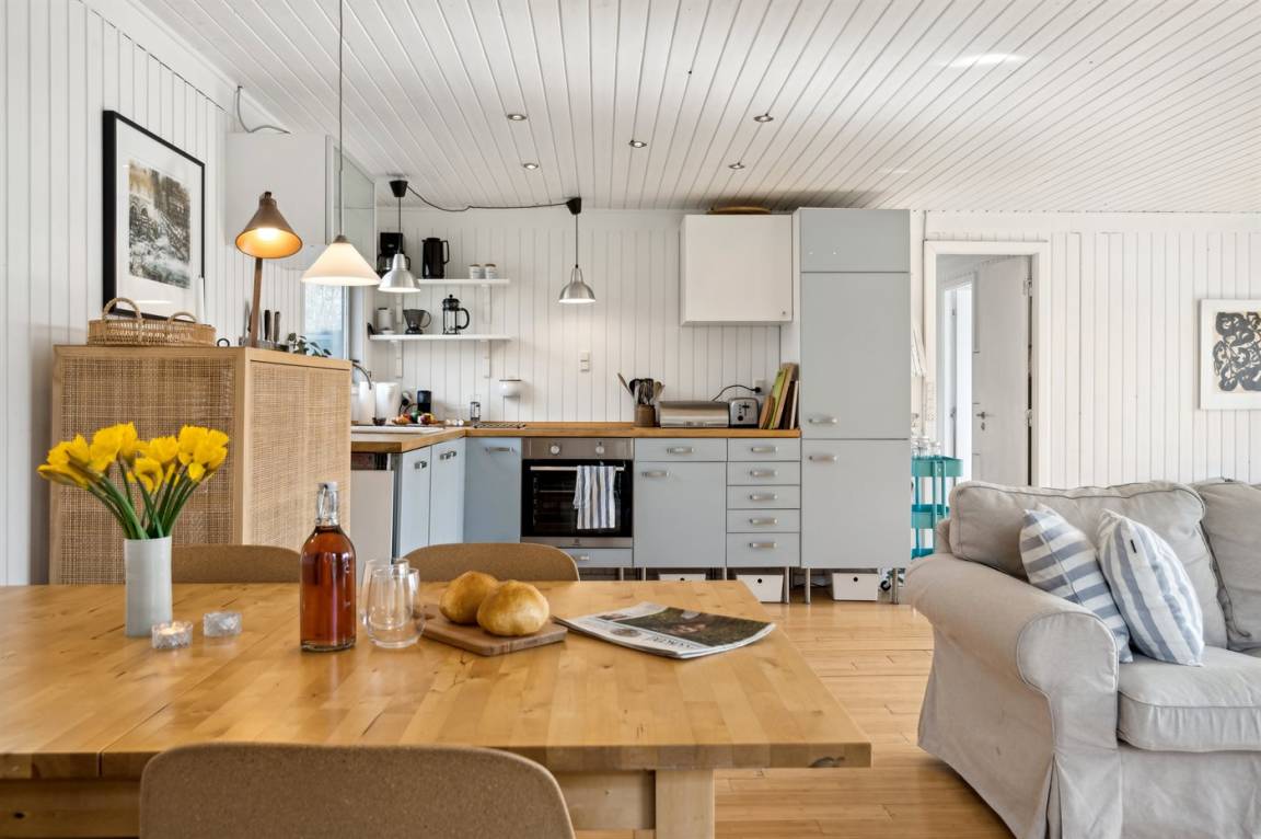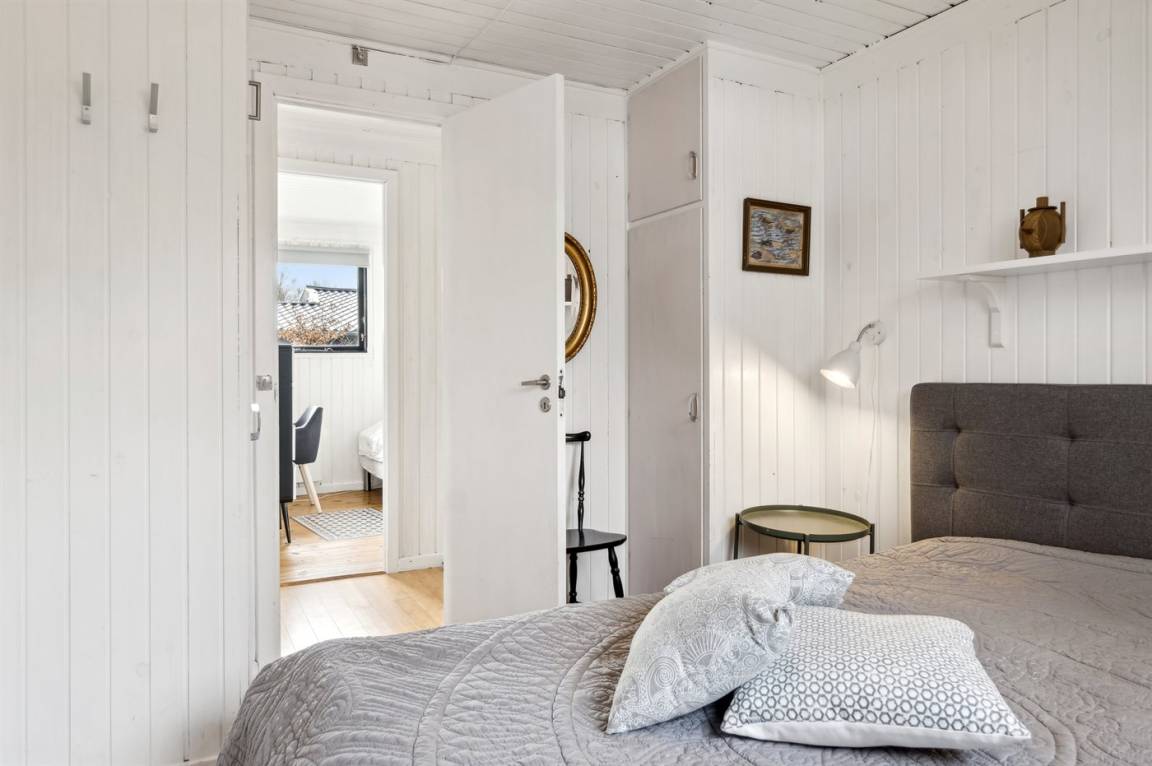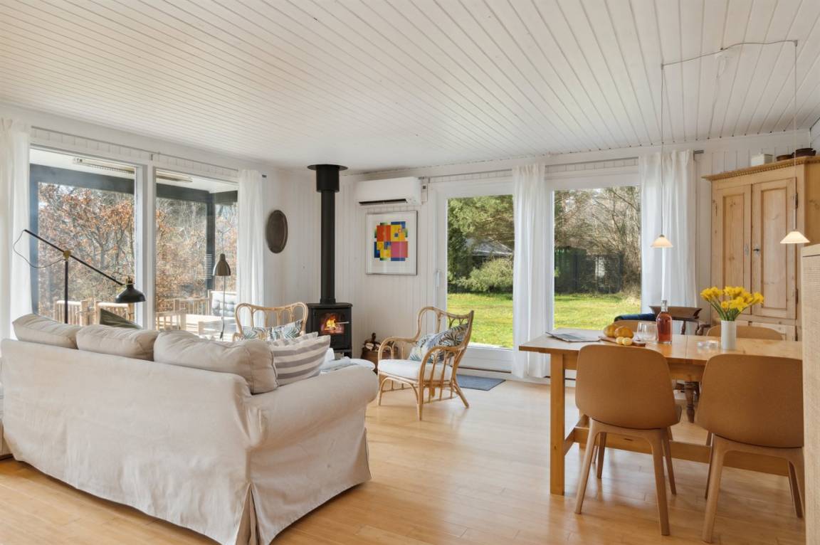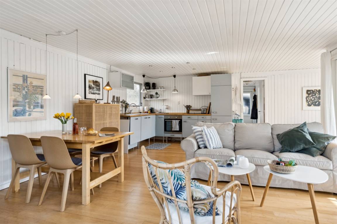 Das Haus verfügt über einen gemütlichen Küchen- und Wohnbereich in offener Verbindung, und Zugang zur überdachten Terrasse sowie zum restlichen Terrassenbereich und Garten bietet. Das Haus verfügt über 3 Schlafzimmer mit einem Doppelbett im einen und Einzelbetten in den anderen beiden Zimmern. Darüber hinaus gibt es ein Gästehaus mit 2 Einzelbetten. Das Haus bietet Platz für 6 Gäste von Woche 19 bis Woche 43. Den Rest des Jahres ist das Gästehaus nicht in der Vermietung enthalten, und das Haus bietet daher Platz für 4 Gäste. Das Badezimmer verfügt über eine Duschkabine und Fußbodenheizung. Das Grundstück ist eingezäunt, sodass Kinder und Haustiere sicher spielen können. Es gibt Glasfaser-Internet, eine Luft-Luft-Wärmepumpe und einen Holzofen.
