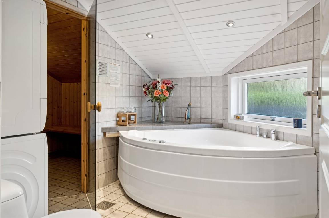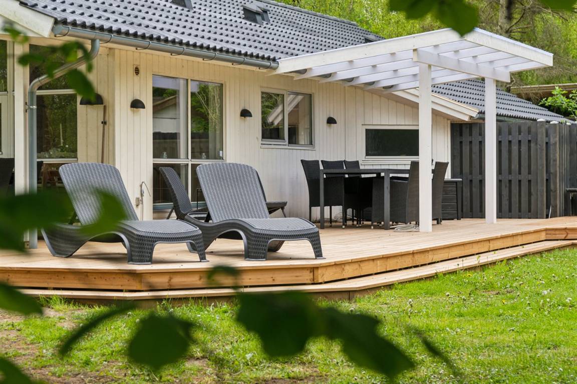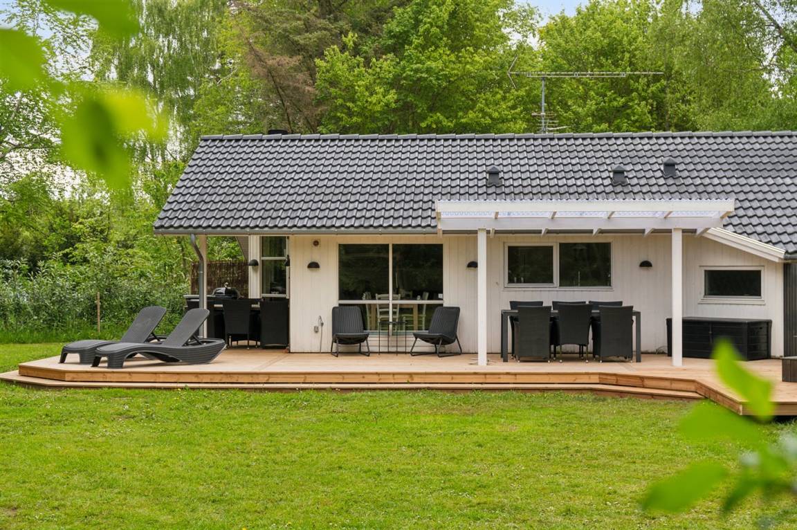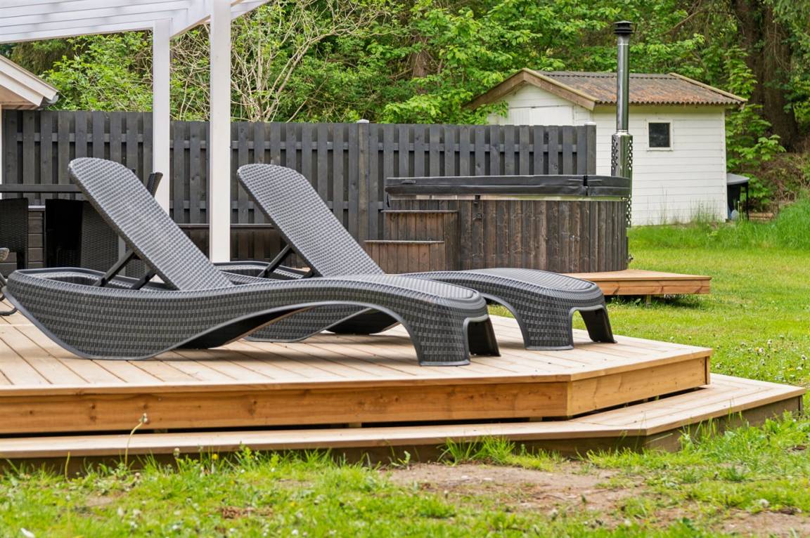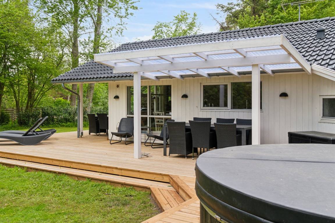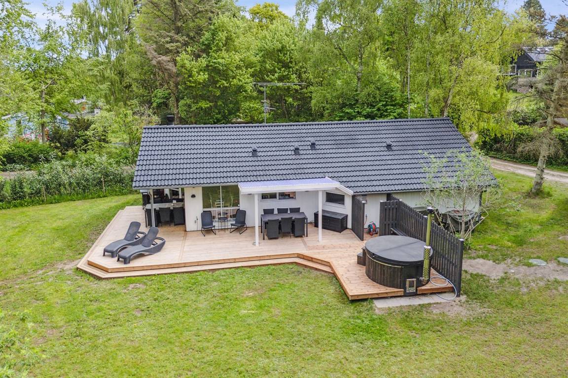 Dieses schöne Ferienhaus tritt hell und luftig hervor mit Decken bis zum First in allen Zimmern. Hier findet man alles, was man für einen entspannten Urlaub benötigt wie z. B. Sauna und eine große, schöne Terrassenfläche mit Hot-Tub. Das Haus liegt in einem ruhigen Ferienhausgebiet in der Nähe der Natur und nur 425 m von einem Strand entfernt, wo es einen Badesteg gibt.