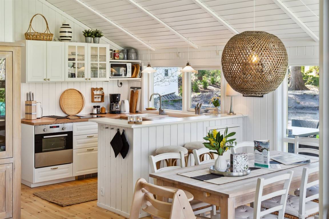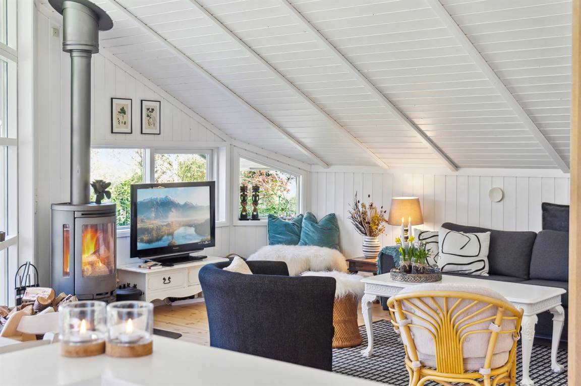 Der natürliche Mittelpunkt des Hauses ist der gemütliche offene Küchen- und Essbereich, der mit dem Wohnzimmer verbunden ist – von wo aus man auf die Terrasse gelangt. Für gemütliche Stunden gibt es einen Kaminofen, und das Haus wird auch energieeffizient mit einer Luft-Luft-Wärmepumpe beheizt.