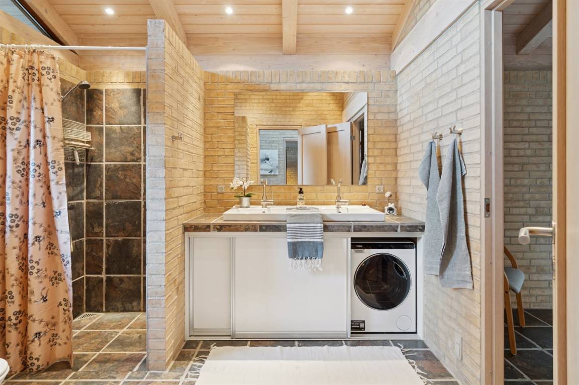 Das Haus wird umweltfreundlich mit einer Luft-Wasser-Wärmepumpe beheizt, und im ganzen Haus gibt es Fußbodenheizung. Für die Jahreszeiten, in denen keine Fußbodenheizung benötigt wird, stehen eine Luft-Luft-Wärmepumpe sowie elektrische Fußbodenheizung im Badezimmer zur Verfügung. Für die etwas gemütlichere Wärme sorgt ein Kaminofen.