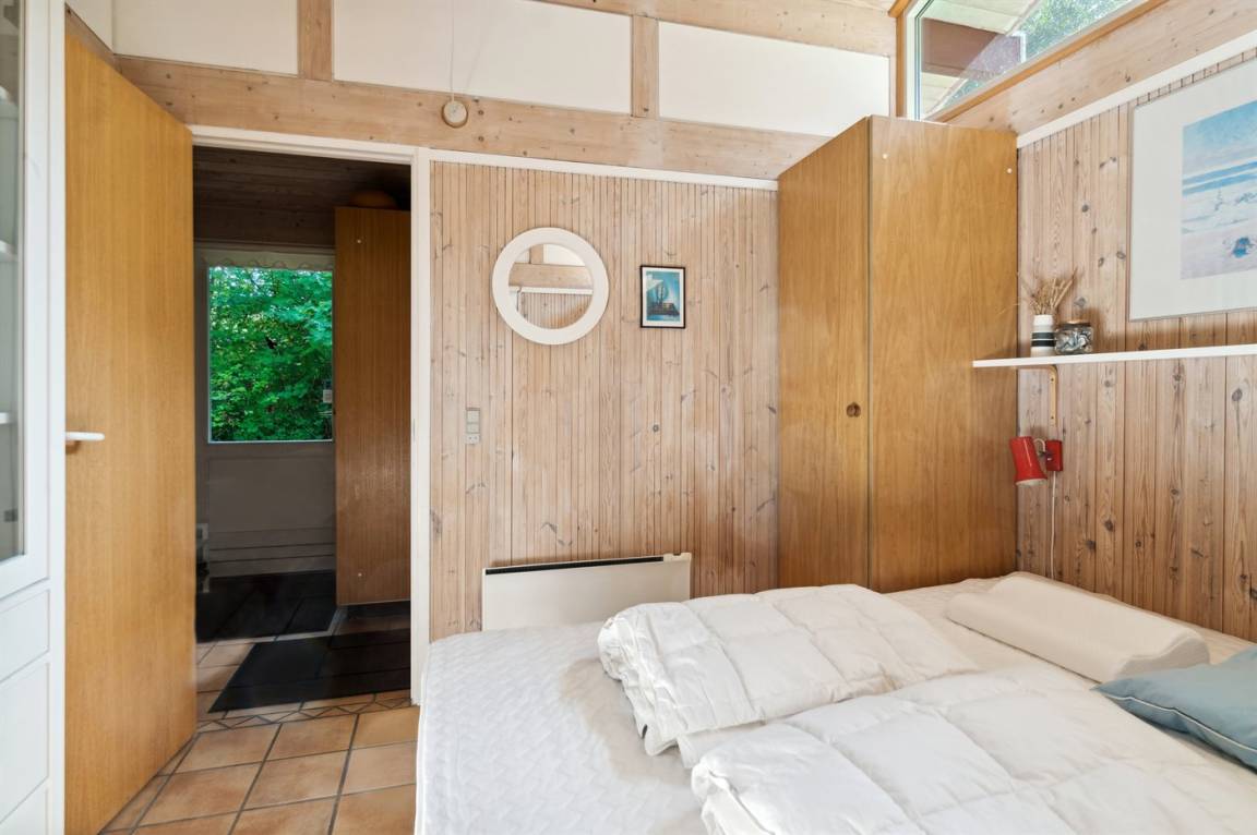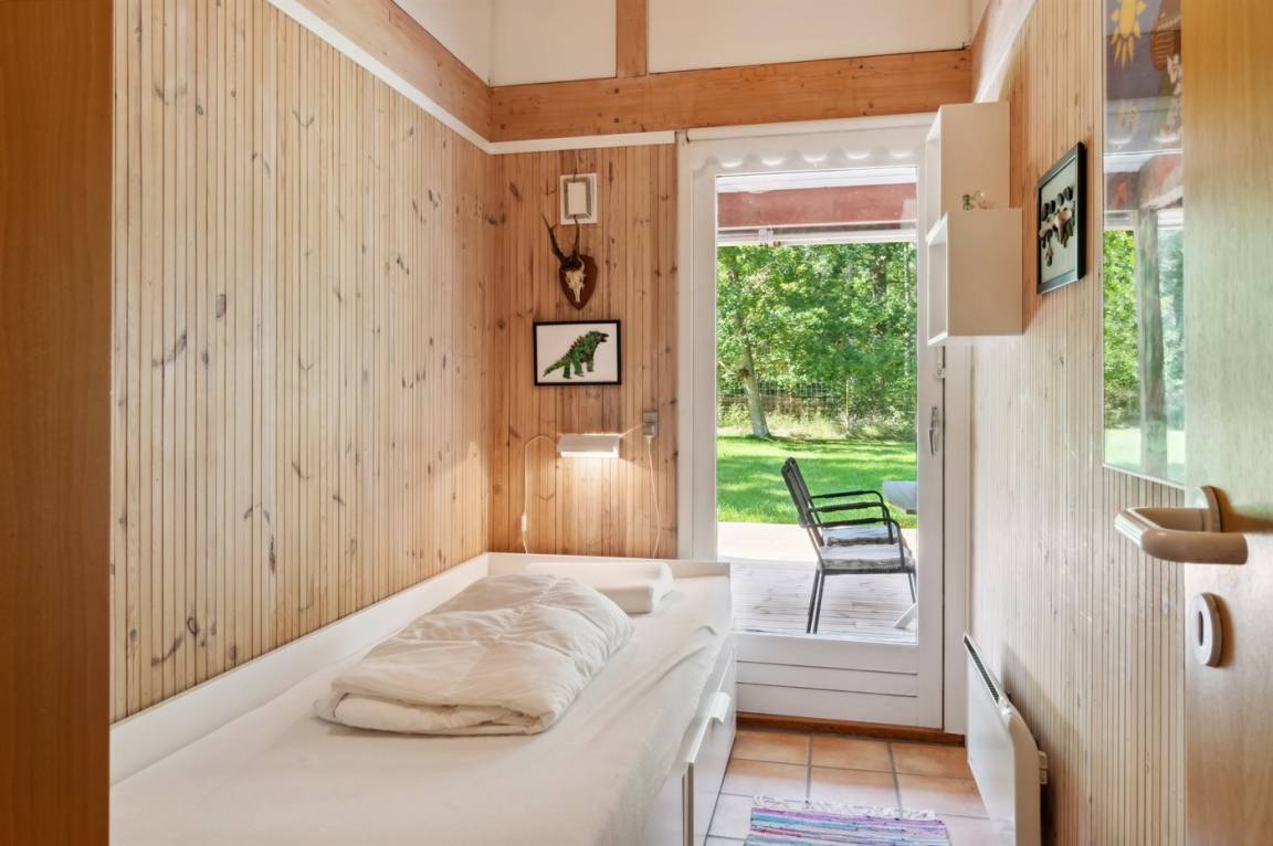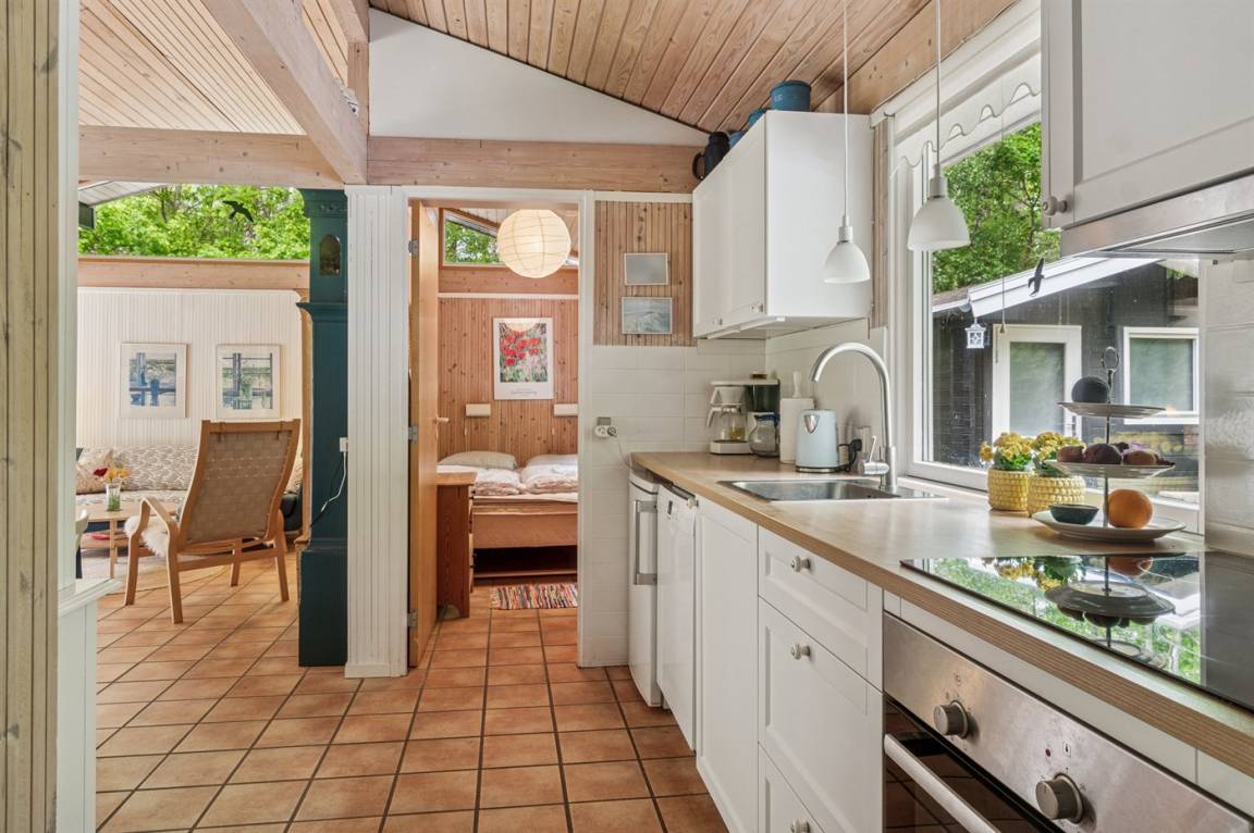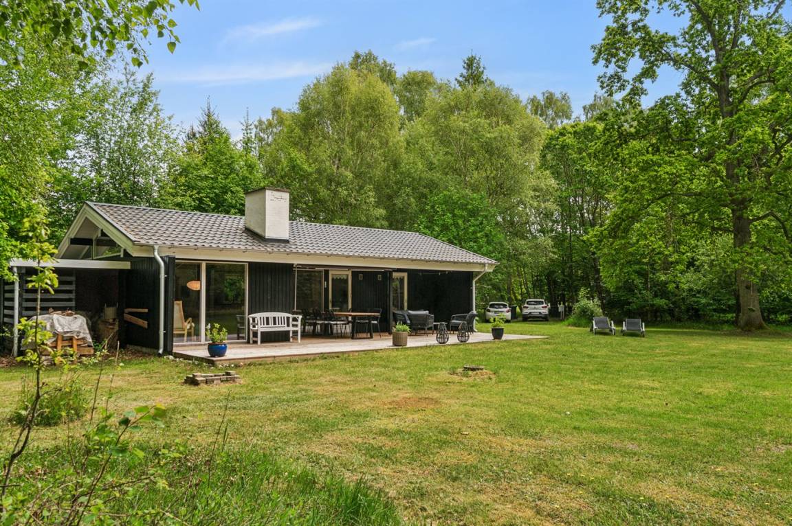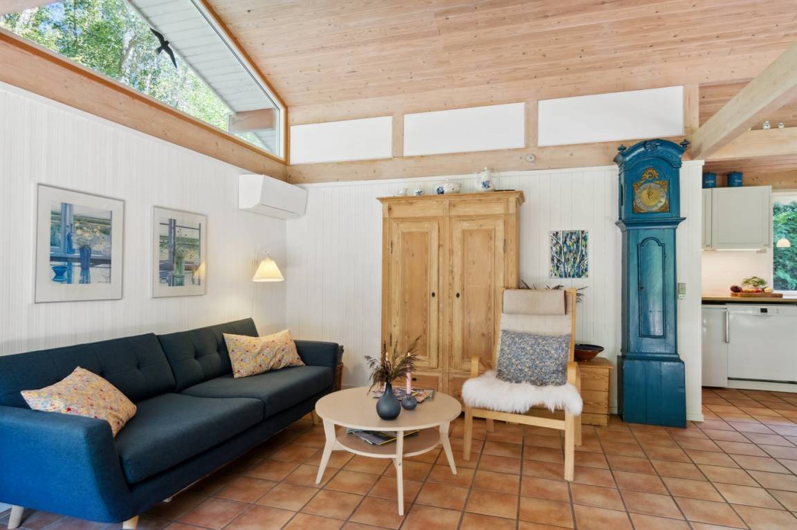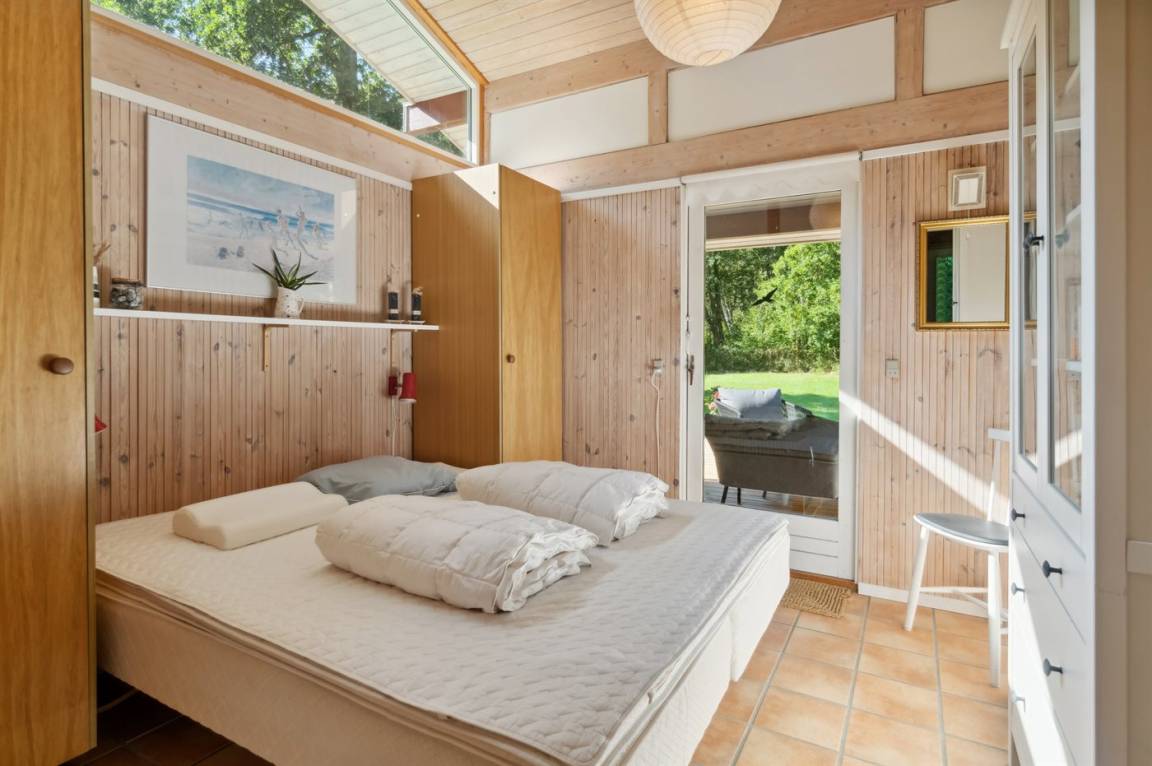Das Haus ist gemütlich eingerichtet mit einer Küche, einem Essbereich und einem Wohnzimmer, von dem aus man Zugang zur westlich ausgerichteten Terrasse hat, ein Teil davon ist überdacht. In allen Räumen gibt es hohe Decken, und zusammen mit den hochgelegenen Fenstern in den Giebeln sorgt dies dafür, dass viel Licht und Luft im Haus vorhanden sind. Es gibt 3 Schlafzimmer, in 2 der Zimmer befinden sich Doppelbetten und im dritten Zimmer gibt es ein Einzelbett. Im Badezimmer gibt es eine Duschnische. Auf dem großen Grundstück gibt es gute Möglichkeiten zum Spielen, und Kinder können sich sicher bewegen.