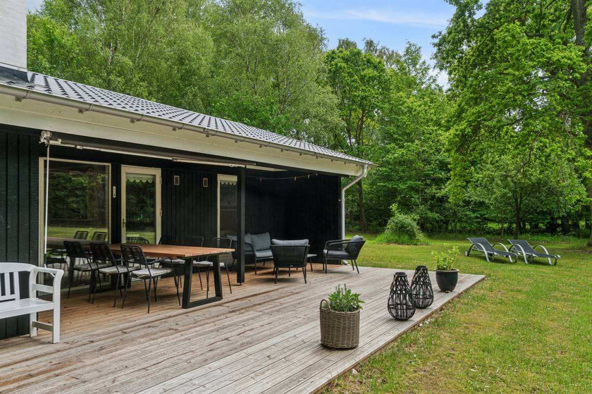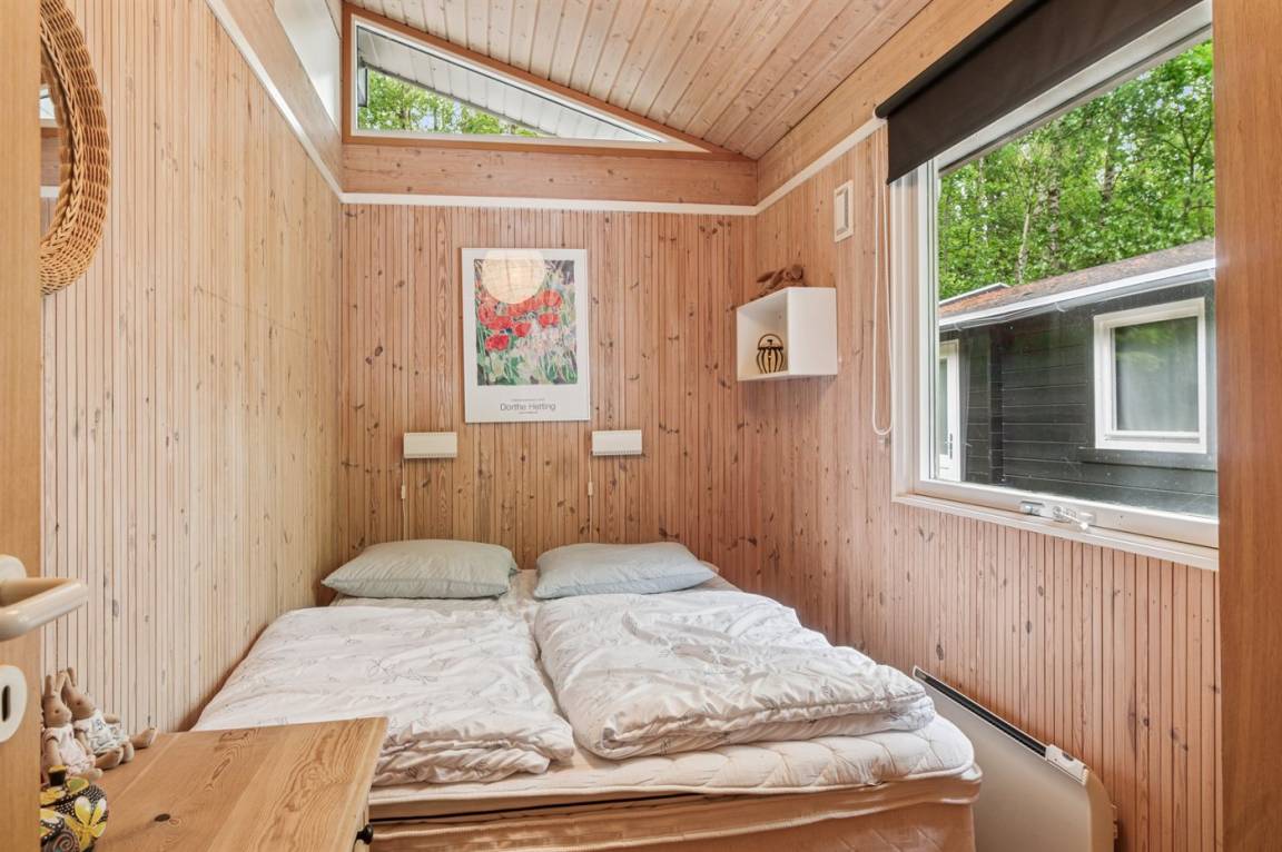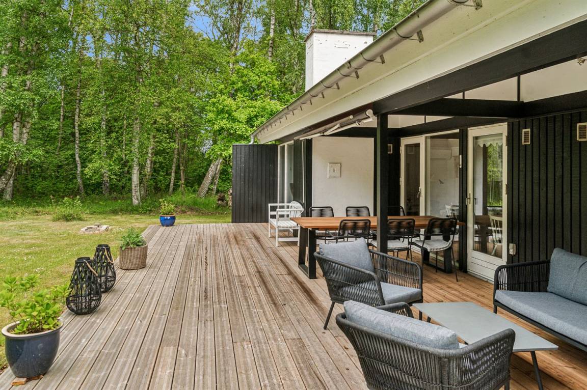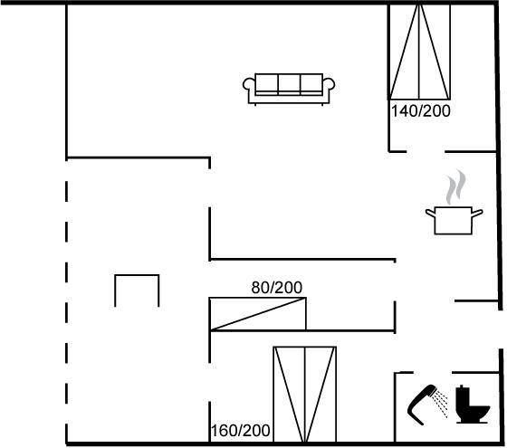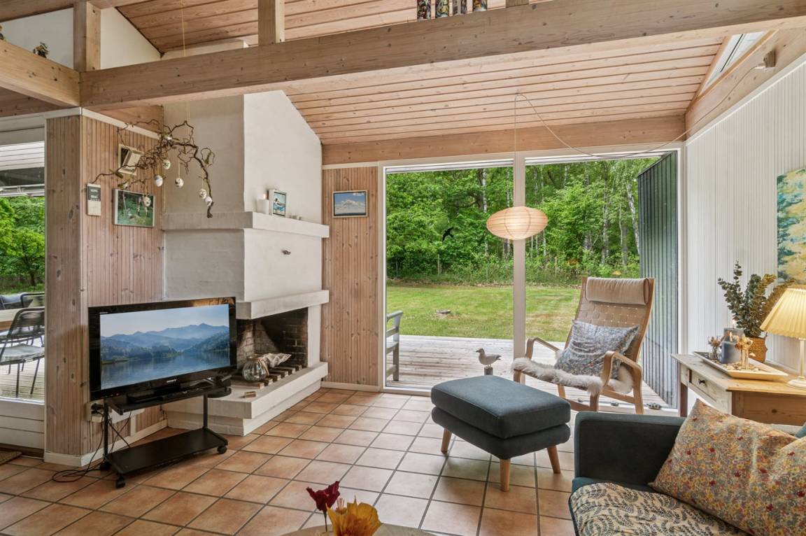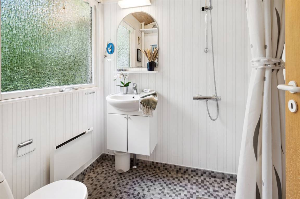 Das Haus ist gemütlich eingerichtet mit einer Küche, einem Essbereich und einem Wohnzimmer, von dem aus man Zugang zur westlich ausgerichteten Terrasse hat, ein Teil davon ist überdacht. In allen Räumen gibt es hohe Decken, und zusammen mit den hochgelegenen Fenstern in den Giebeln sorgt dies dafür, dass viel Licht und Luft im Haus vorhanden sind. Es gibt 3 Schlafzimmer, in 2 der Zimmer befinden sich Doppelbetten und im dritten Zimmer gibt es ein Einzelbett. Im Badezimmer gibt es eine Duschnische. Auf dem großen Grundstück gibt es gute Möglichkeiten zum Spielen, und Kinder können sich sicher bewegen.