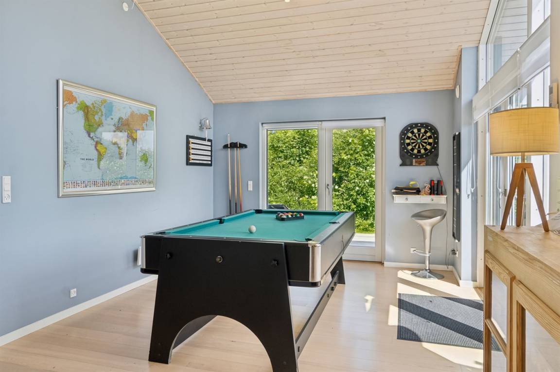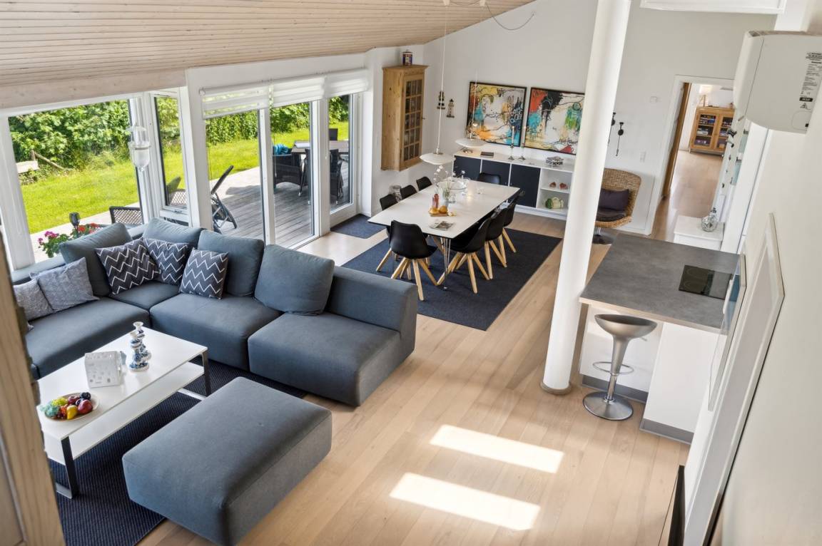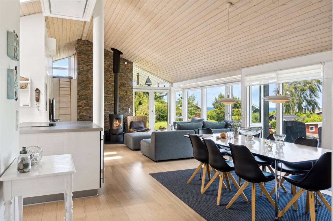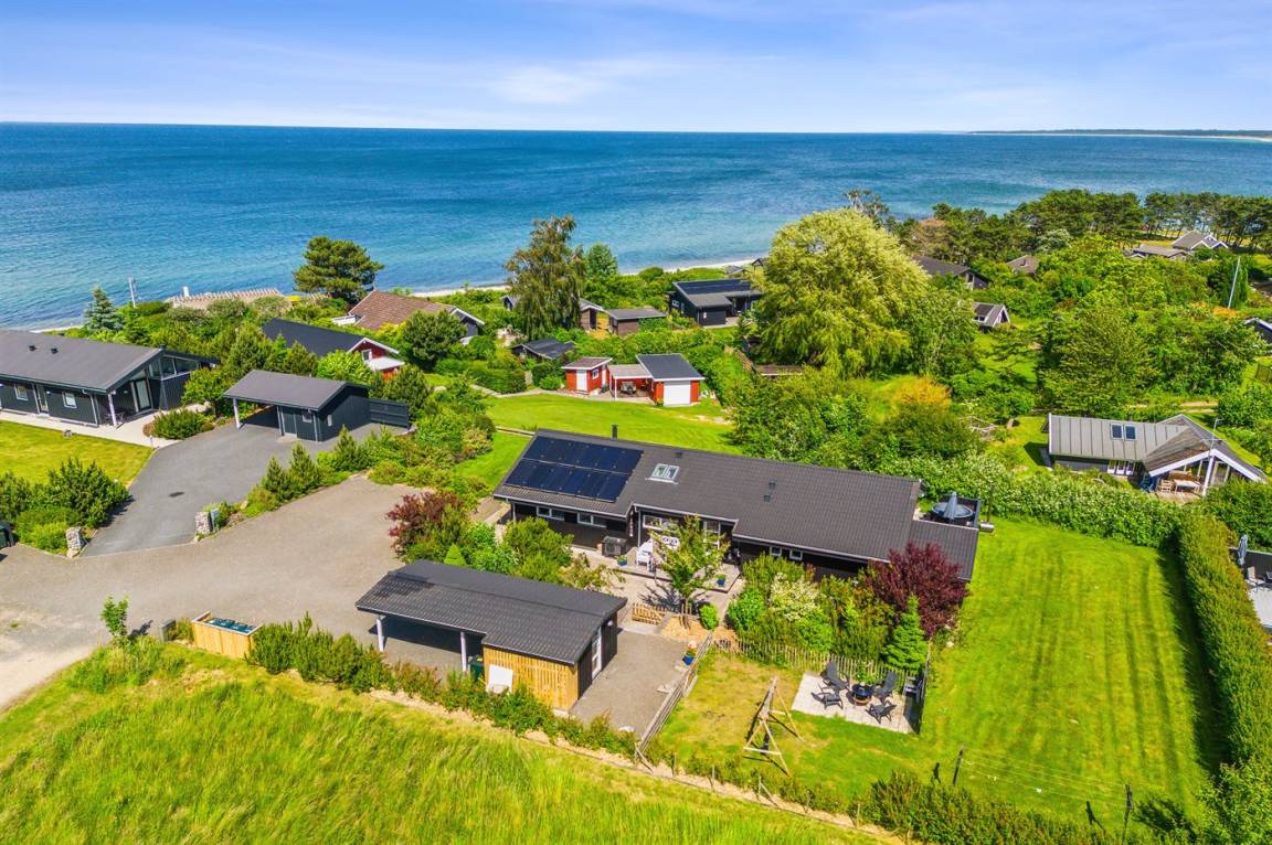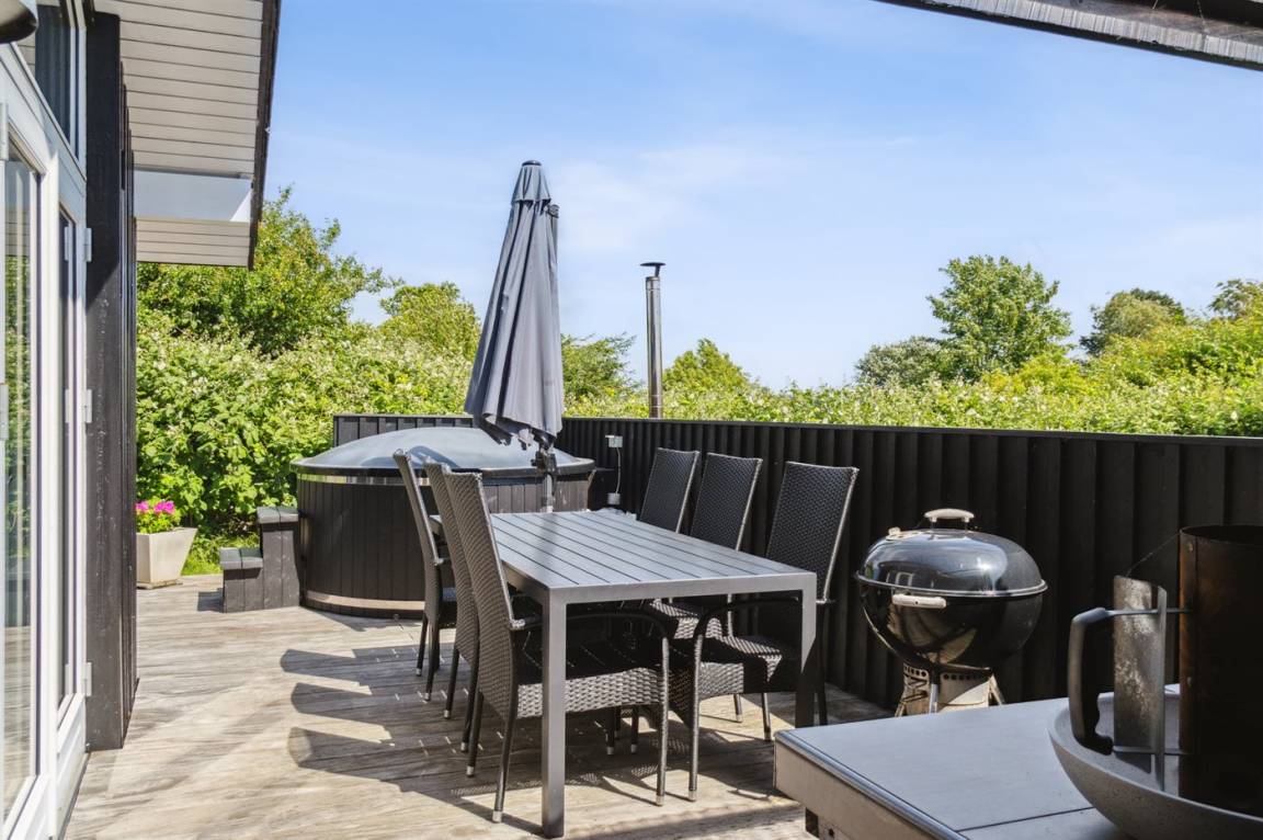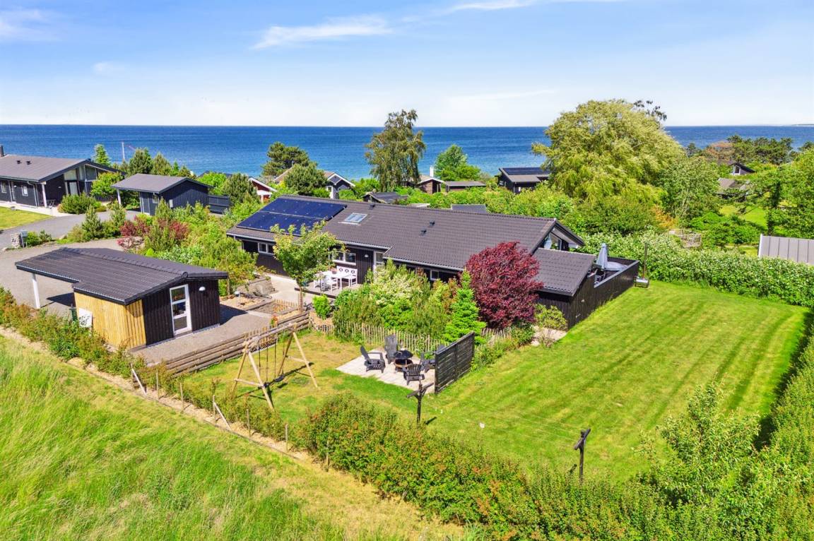 Dieses luxuriöse Ferienhaus mit Meerblick, Innen-Whirlpool und Sauna, Hot Tub und Hobbyraum und vielem mehr befindet sich in einem neueren Ferienhausgebiet nur 100 Meter vom Strand entfernt. Das Haus liegt hoch mit Aussicht unter anderem von der großen Wohnküche, vom Wohnzimmer sowie von der großen Terrasse und dem Garten. Dank der großen Fensterfronten und der hohen Decken ist das Haus hell und luftig, und überall ist das Haus modern und sommerlich eingerichtet.