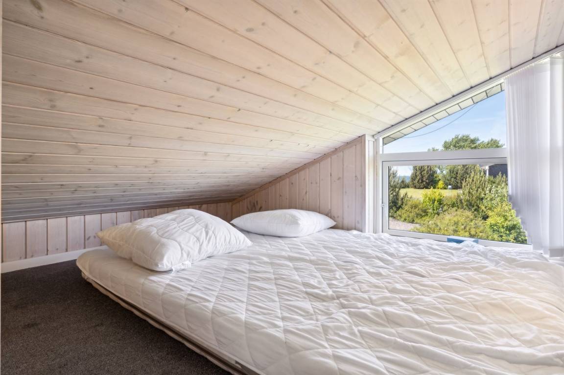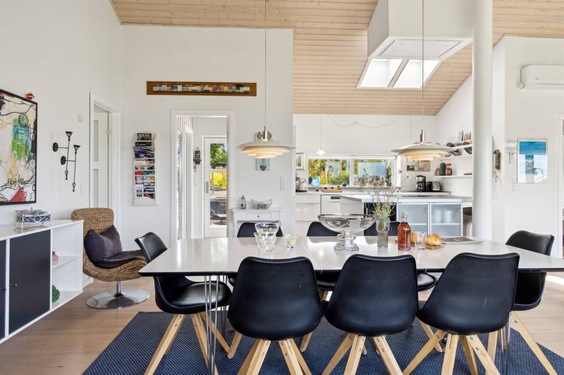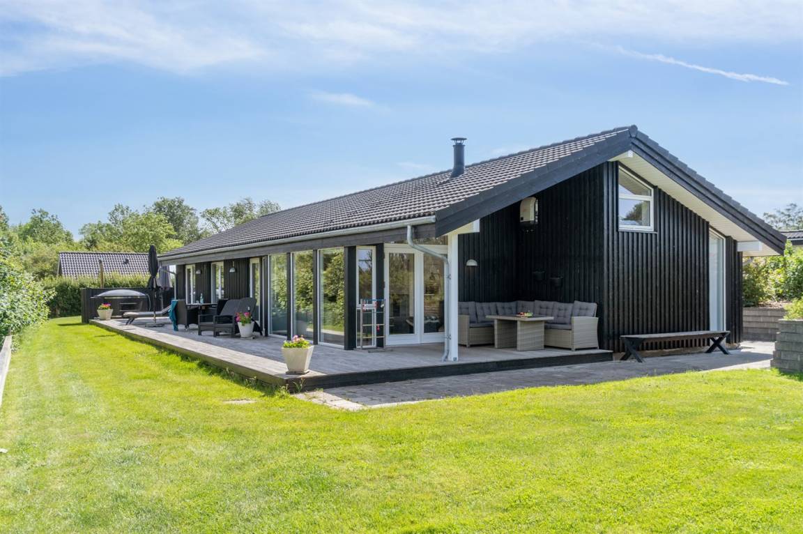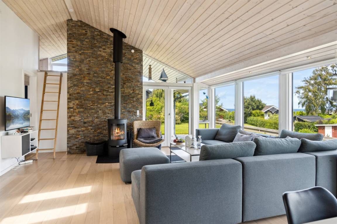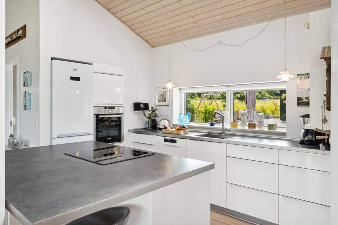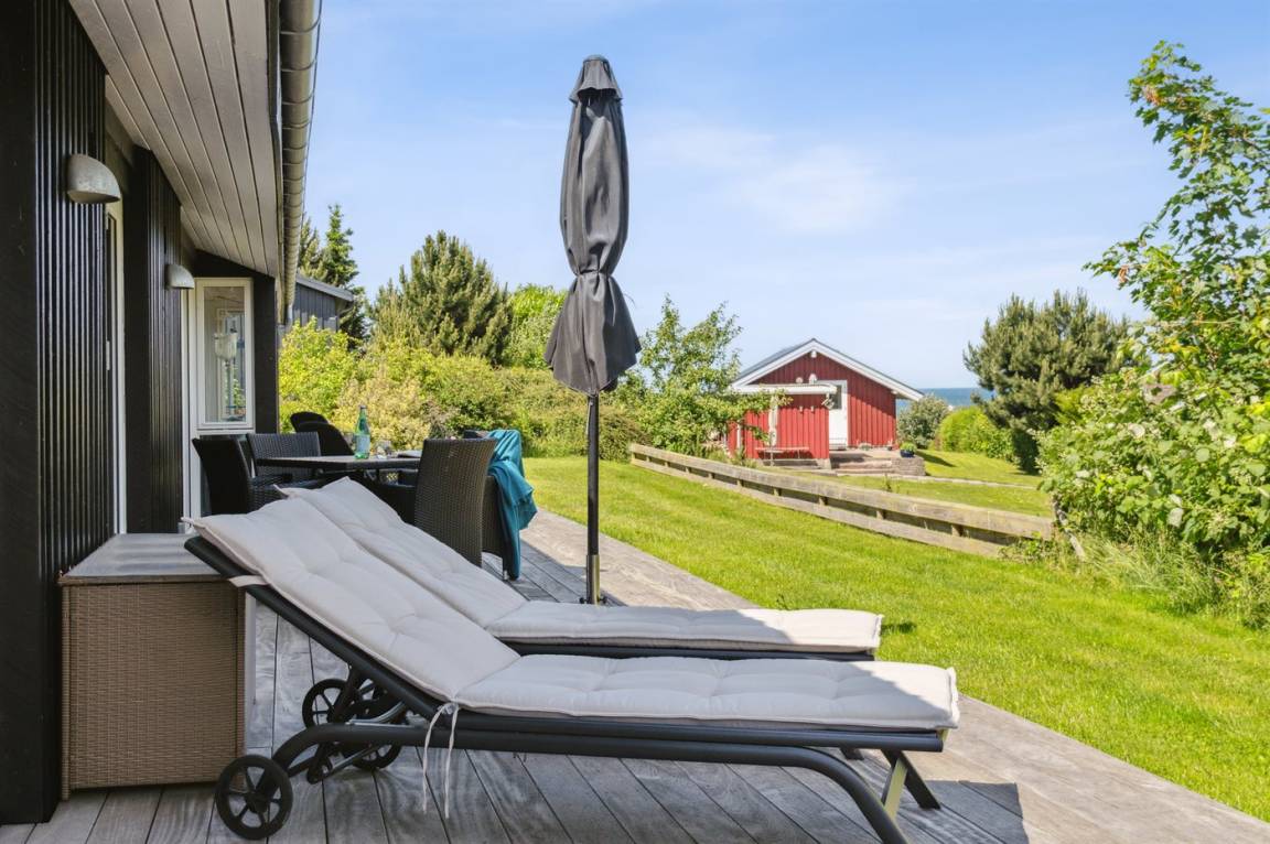 Dieses luxuriöse Ferienhaus mit Meerblick, Innen-Whirlpool und Sauna, Hot Tub und Hobbyraum und vielem mehr befindet sich in einem neueren Ferienhausgebiet nur 100 Meter vom Strand entfernt. Das Haus liegt hoch mit Aussicht unter anderem von der großen Wohnküche, vom Wohnzimmer sowie von der großen Terrasse und dem Garten. Dank der großen Fensterfronten und der hohen Decken ist das Haus hell und luftig, und überall ist das Haus modern und sommerlich eingerichtet.