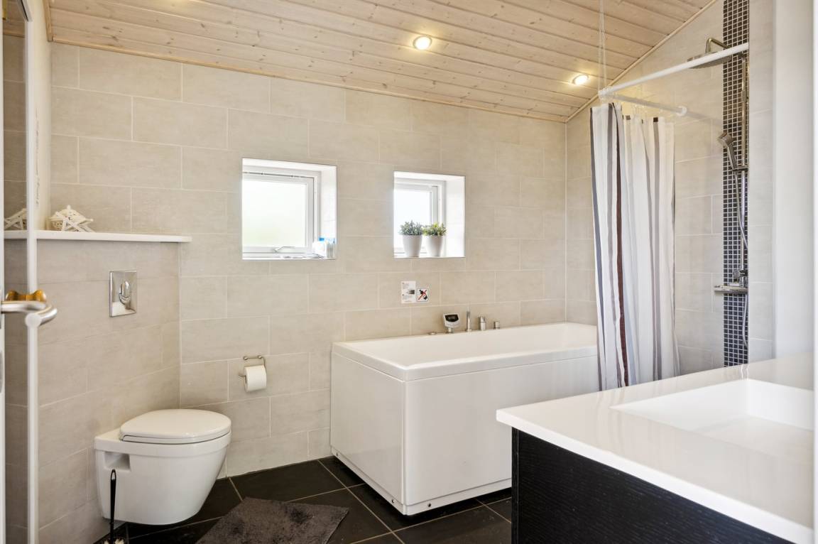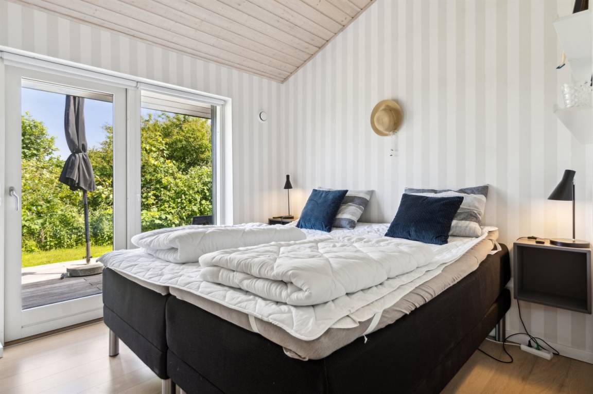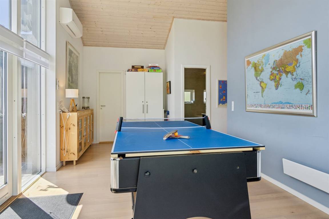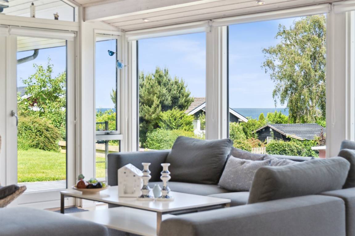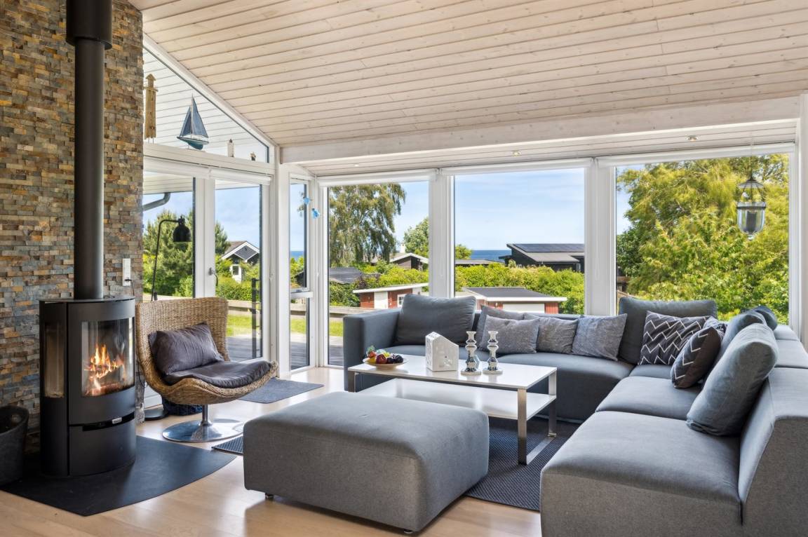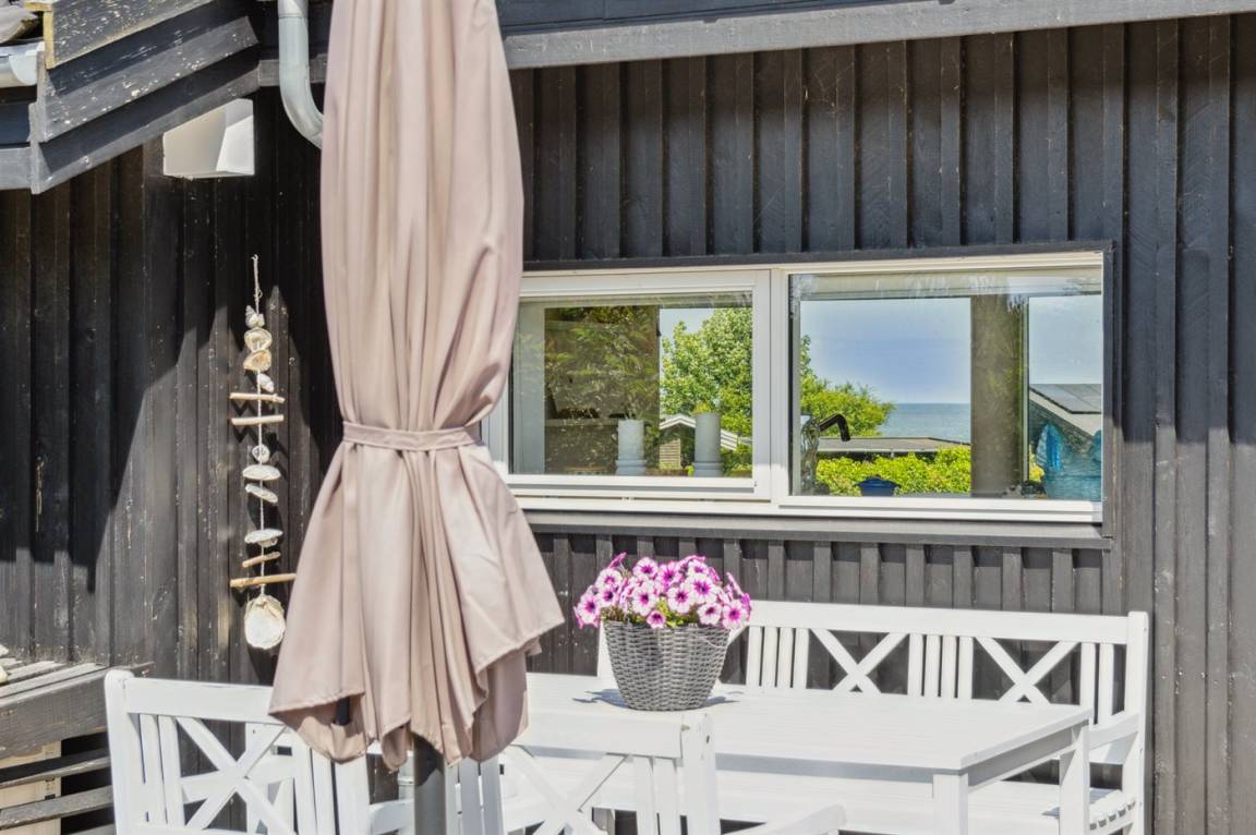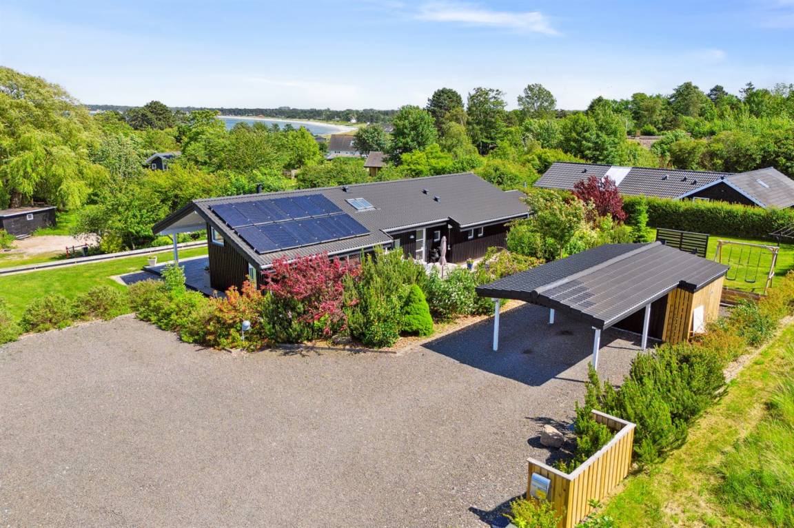 Dieses luxuriöse Ferienhaus mit Meerblick, Innen-Whirlpool und Sauna, Hot Tub und Hobbyraum und vielem mehr befindet sich in einem neueren Ferienhausgebiet nur 100 Meter vom Strand entfernt. Das Haus liegt hoch mit Aussicht unter anderem von der großen Wohnküche, vom Wohnzimmer sowie von der großen Terrasse und dem Garten. Dank der großen Fensterfronten und der hohen Decken ist das Haus hell und luftig, und überall ist das Haus modern und sommerlich eingerichtet.