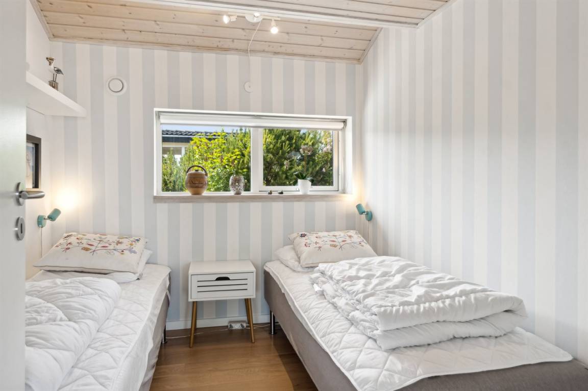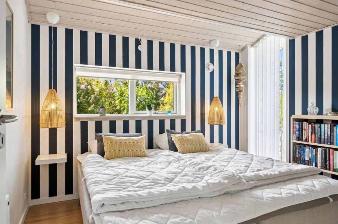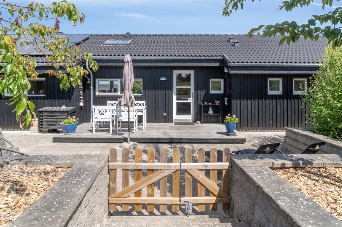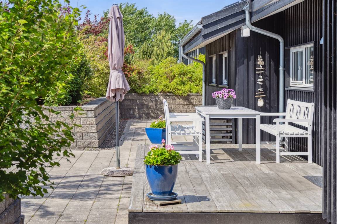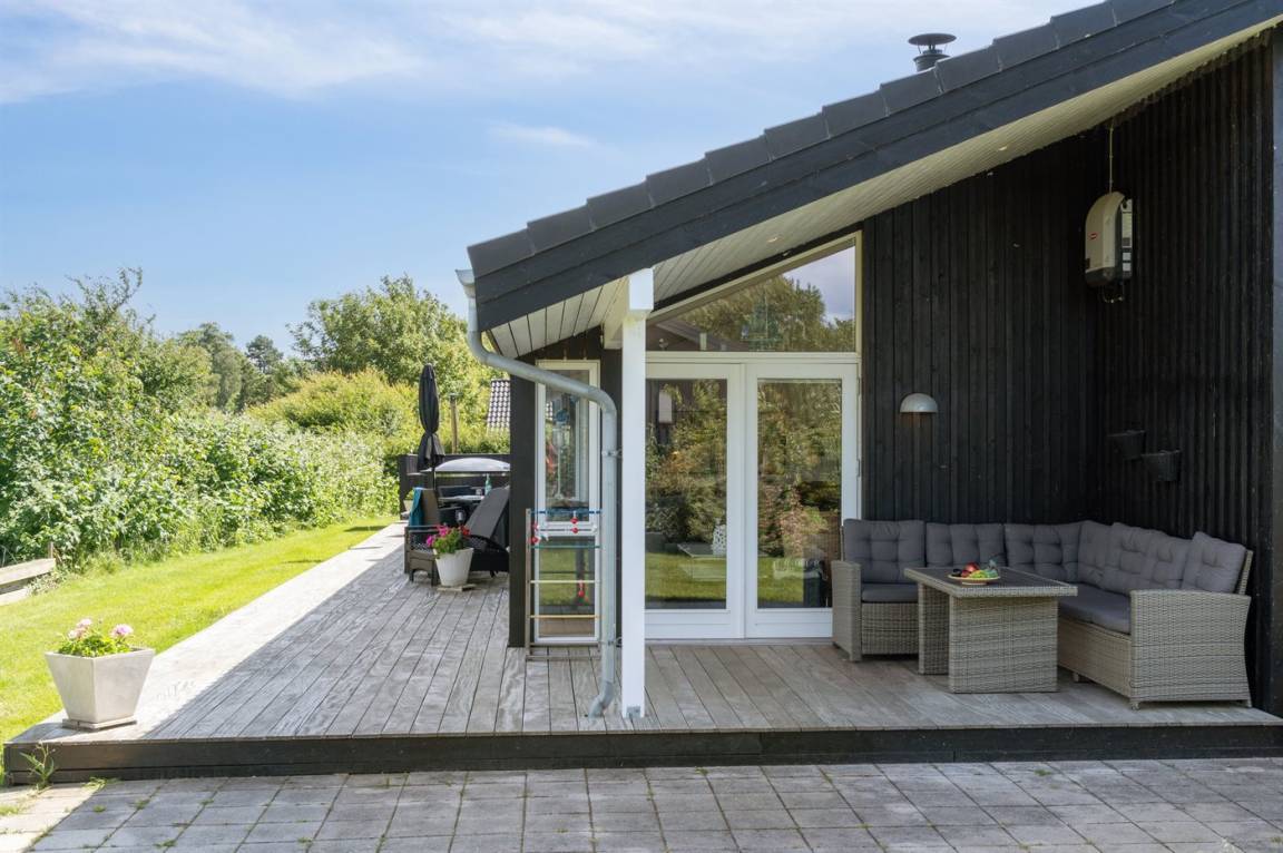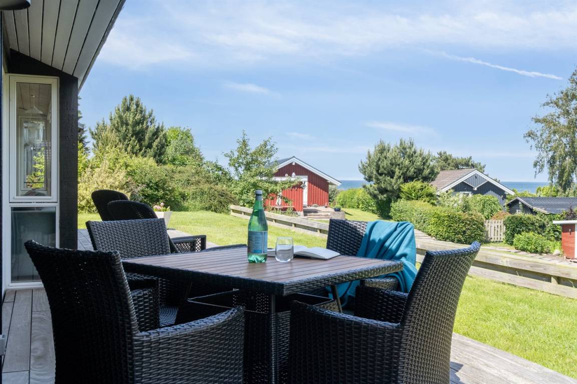 Dieses luxuriöse Ferienhaus mit Meerblick, Innen-Whirlpool und Sauna, Hot Tub und Hobbyraum und vielem mehr befindet sich in einem neueren Ferienhausgebiet nur 100 Meter vom Strand entfernt. Das Haus liegt hoch mit Aussicht unter anderem von der großen Wohnküche, vom Wohnzimmer sowie von der großen Terrasse und dem Garten. Dank der großen Fensterfronten und der hohen Decken ist das Haus hell und luftig, und überall ist das Haus modern und sommerlich eingerichtet.