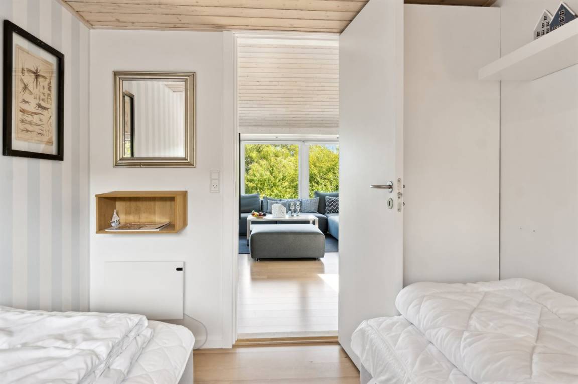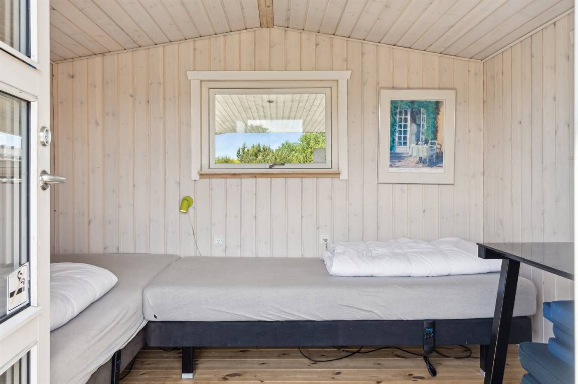 Im Haus gibt es 3 Schlafzimmer, jedes mit 2 Schlafplätzen. Im nach Osten ausgerichteten Schlafzimmer gibt es Meerblick, Zugang zur Terrasse und das Doppelbett ist elektrisch verstellbar. Im offenen Obergeschoss gibt es zusätzlich 2 Schlafplätze auf Matratzen. Außerdem gibt es im Gästehaus 2 Schlafplätze in elektrisch verstellbaren Einzelbetten. Das Gästehaus befindet sich etwa 8 Meter vom eigentlichen Ferienhaus entfernt.