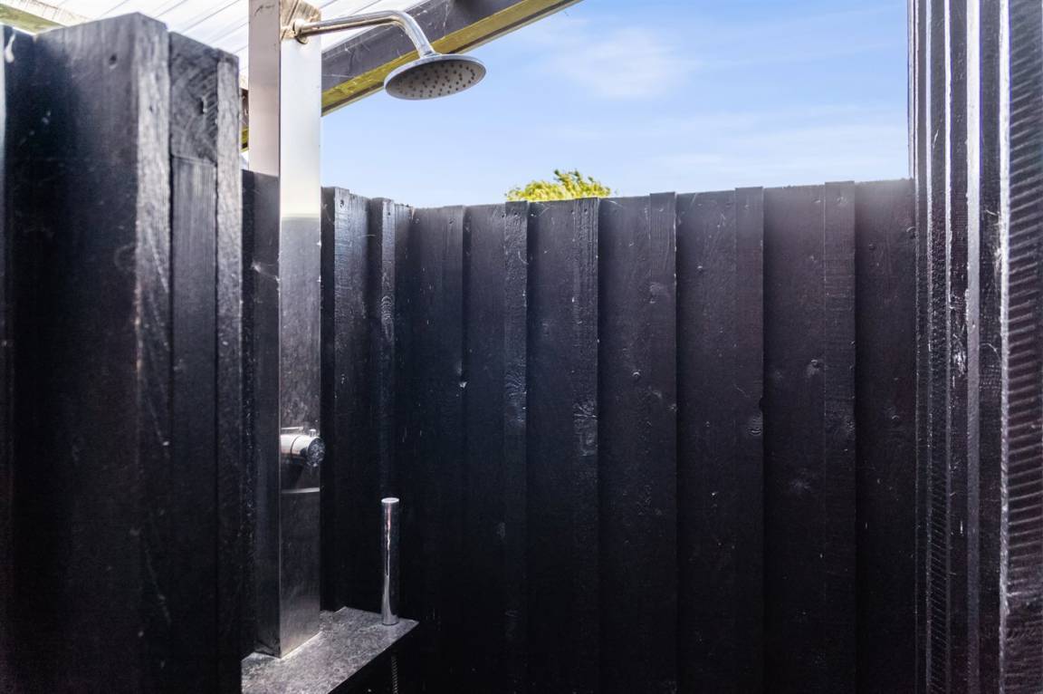 Von der großen Wohnküche mit unter anderem Weinkühlschrank, vom Wohnzimmer sowie vom einen Schlafzimmer gibt es Zugang zur Terrasse mit Hot Tub, Außendusche und Außenküche. Ein Teil der Terrasse ist überdacht, um Schatten vor der Sonne und Schutz an kühleren Abenden zu bieten. Der Hot Tub und die Außendusche sind das ganze Jahr über zugänglich. Übrigens: Die Außendusche steht im Zeitraum von Ostern bis zur einschl. 42 KW zur Verfügung.